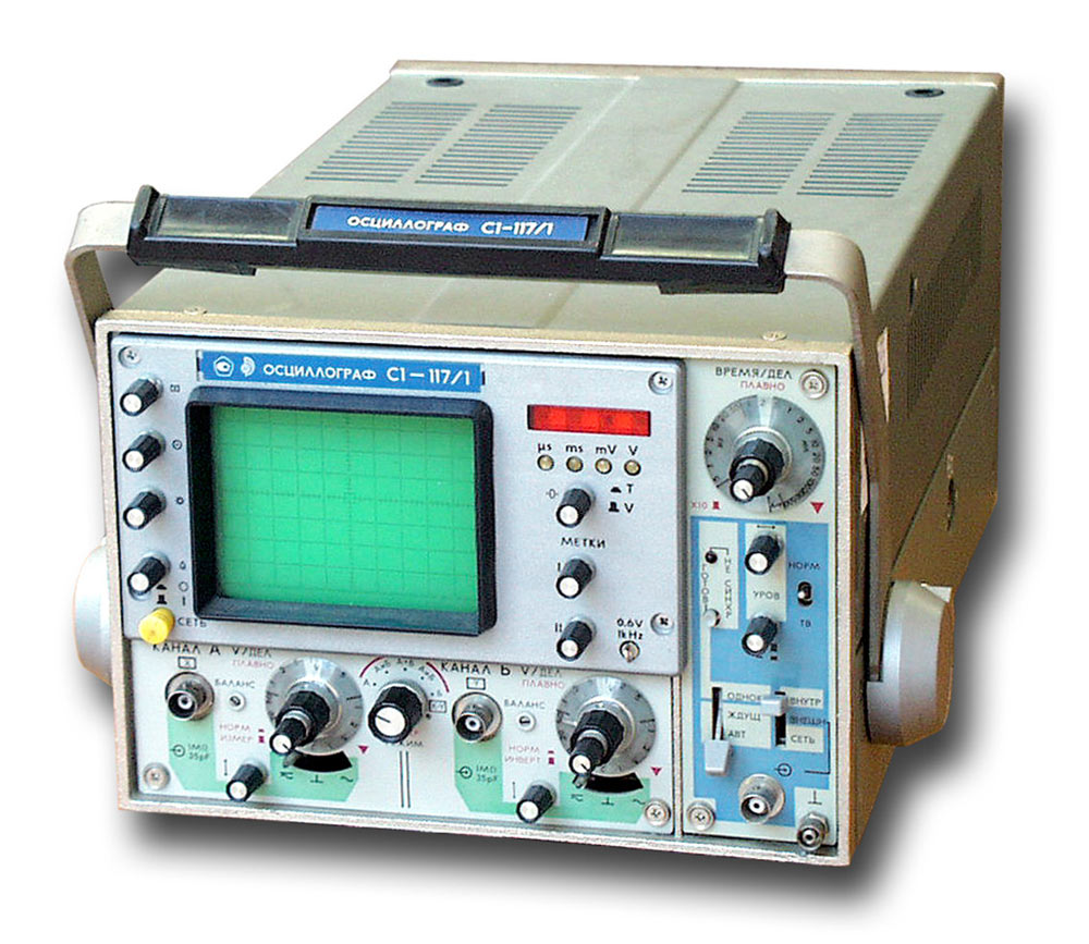 Осциллографы *С1-117/1* и *С1-117/2* с начала 1985 года выпускало Минское ПО *Калибр*. Универсальные двухканальные осциллографы **С1-117** предназначены для исследования формы электрических сигналов визуальным наблюдением и измерением амплитудных и временных параметров по ЭЛТ, а так же цифровым методом (для С1-117/1) с индикацией результатов измерения и размерности измеряемых параметров на светодиодном индикаторе. Оба осциллографа обеспечивают исследования сигналов в широком диапазоне амплитуд от 400 мкВ до 300 В с частотой до 15 МГц. Очень высокая чувствительность (0,1 мВ/дел.) позволяет использовать приборы в радиоизмерительной, вычислительной, электронной, медицинской технике, ядерной физике. Наличие ТВ синхронизации делает осциллограф удобным для ремонта телевизионных и видеоустройств.