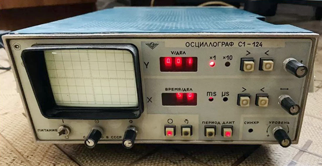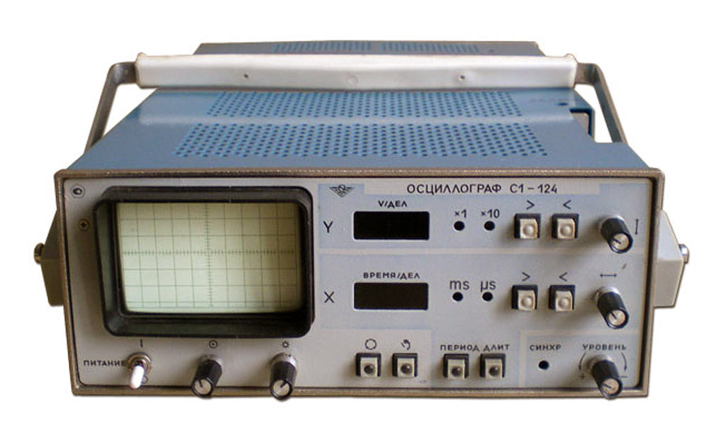 Осциллограф универсальный *С1-124* выпускался возможно c 1989 года Львовским ПО имени В.И.Ленина (Золочевский радиозавод). Осциллограф предназначен для исследования периодических электрических сигналов в диапазоне частот от 0 до 10 МГц при текущем обслуживании и оперативной диагностики неисправностей радиоэлектронного оборудования в полевых, цеховых или в лабораторных условиях. Осцсиллограф может быть использован и в автоматизированных системах контроля. Осциллограф *С1-124* обеспечивает автоматическую установку размеров изображения в пределах экрана с индикацией их на цифровом светодиодном индикаторе. В этой модели используется кинескоп типа 8ЛО8И. Питание осциллографа может осуществляться: от сети переменного тока с напряжением 220 В и частотой 50/60 Гц; от сети переменного тока с напряжением 220 В или 115 В с частотой 400 Гц; или от источника постоянного напряжения 27 В. Мощность, потребляемая от сети переменного тока напряжением 220 В, не превышает 25 ВА. Ток, потребляемый от источника постоянного тока при напряжении 27 В, не превышает 0,8 А. Габариты модели 245х350х110 мм. Вес с преобразователем 4 кг.