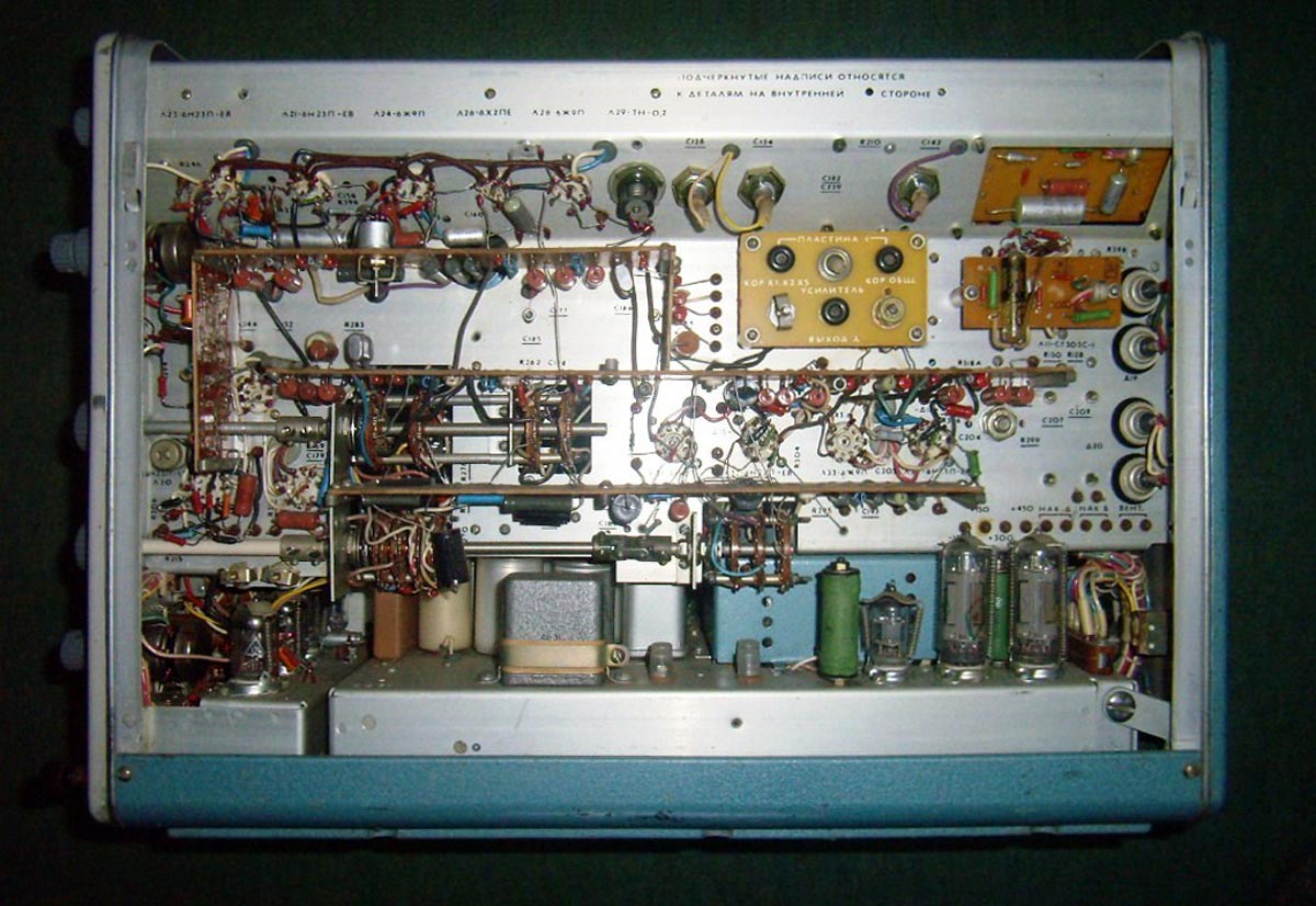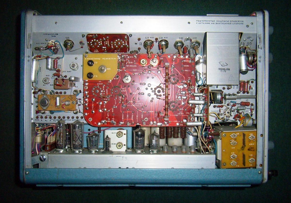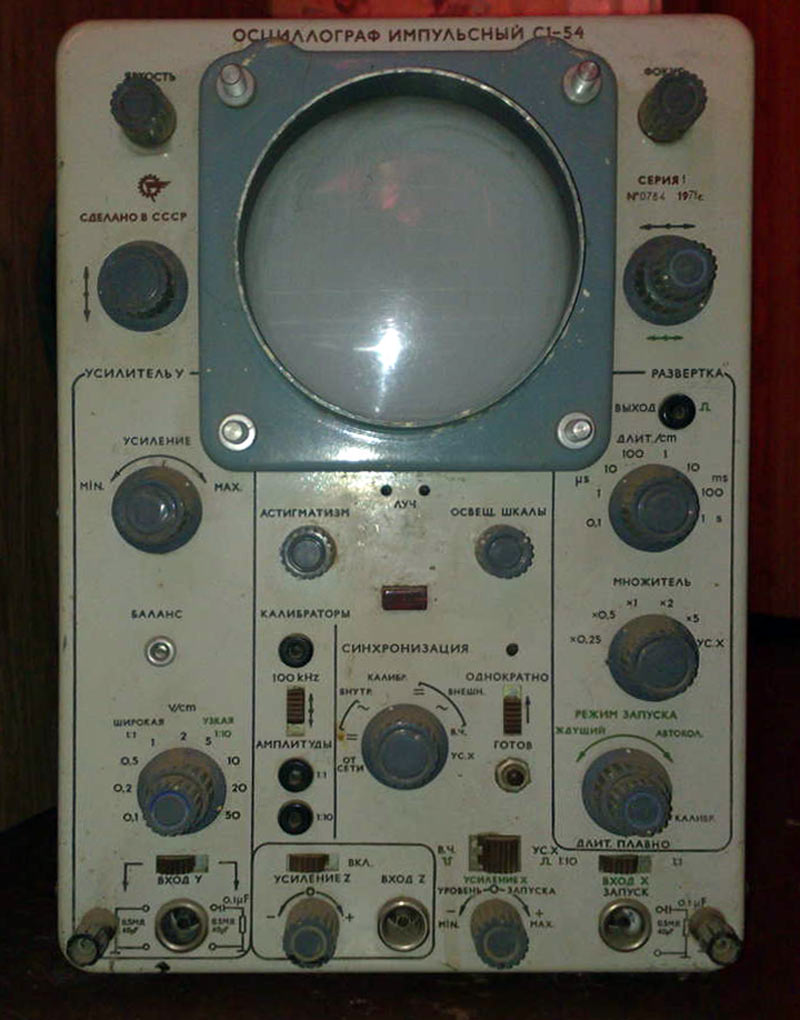 Осциллограф *С1-54* выпускался с 1970 года. Осциллограф *С1-54* - универсальный и предназначен для исследования импульсных и периодических процессов в лаборатории, полевых и высотных (до 5 км) условиях. Технические характеристики: Прибор позволяет наблюдать и измерять периодические и импульсные электрические сигналы: в диапазоне амплитуд от 0,01 В до 500 В; в диапазоне частот периодических сигналов от 2 Гц до 20 МГц; параметры импульсов длительностью от 0,1 мкс до 0,5 с с частотой следования от 200 Гц до 500 кГц; Неравномерность частотной характеристики усилителя вертикального отклонения не более 3 дБ в диапазоне частот от 0 до 20 МГц, не более 1 дБ в полосе частот 50 Гц-3 МГц для широкой полосы и не более 3 дБ в диапазоне частот от 2 Гц до 2 МГц для узкой полосы. Максимальная чувствительность усилителя горизонтального отклонения 0,05 мм/мВ. Неравномерность АЧХ усилителя горизонтального отклонения не более 3 дБ в диапазоне частот от 5 Гц до 2М Гц. Рабочая часть экрана 40х90 мм. Питание от сети переменного тока частотой 50 Гц, напряжением 220 В или 400Гц и 115 В. Мощность, потребляемая от сети 140 В•А. Масса прибора 25 кг. Габариты 260х380х550 мм. Наработка прибора на отказ 600 часов.