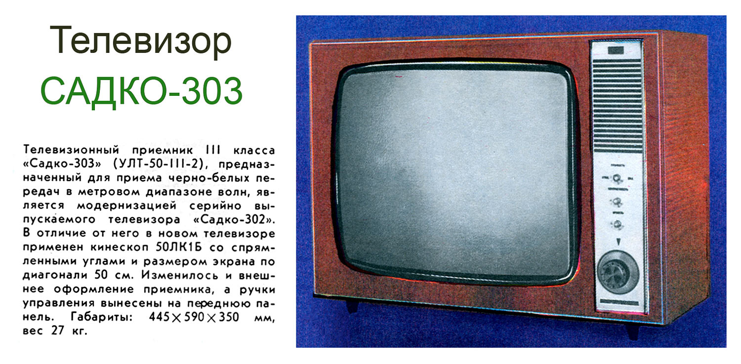 Телевизор **Садко-303** с 1972 года выпускал Новгородский телевизионный завод. Телевизор *Садко-303* (УЛТ-50-III-2) работает в любом из 12 каналов МВ диапазона. Печатные платы расположены на вертикальном штампованном шасси, что делает удобным доступ к лампам и элементам. Отдельно находится кинескоп 50ЛК1Б, с отклоняющей системой, блок ПТК и громкоговоритель 1ГД-36. Производился телевизор в настольном и напольном вариантах. Футляр прямоугольный, отделан ценными породами дерева. Сзади телевизор закрыт пластмассовой стенкой, с отверстиями для вентиляции. Основные ручки управления находятся на передней панели, это ручки ПТК, гетеродина, яркости, контрастности, громкости и выключатель сети. На заднюю стенку выведены гнёзда для подключения телефонов, ручки регулировки частоты кадров, размера по вертикали, частоты строк, линейности кадров, переключатель напряжения сети, предохранитель и антенные гнезда. К аппарату можно подключить магнитофон для записи или прослушивать звук на головные телефоны при отключенном громкоговорителе. Имеется ряд автоматических регулировок, которые позволяют вести устойчивый приём программ на удалении от телецентра. Уменьшение помех достигается применением АПЧ и Ф строчной развертки. Выходная мощность 0,5 Вт. Чувствительность 150 мкВ. Диапазон звуковых частот 125...7100 Гц. Питание от сети 127 или 220 В. Потребляемая мощность 160 Вт. Габариты телевизора 538 х 506 х 350 мм. Масса 30 кг.