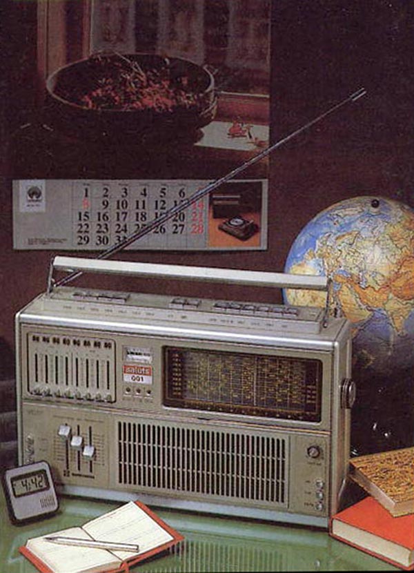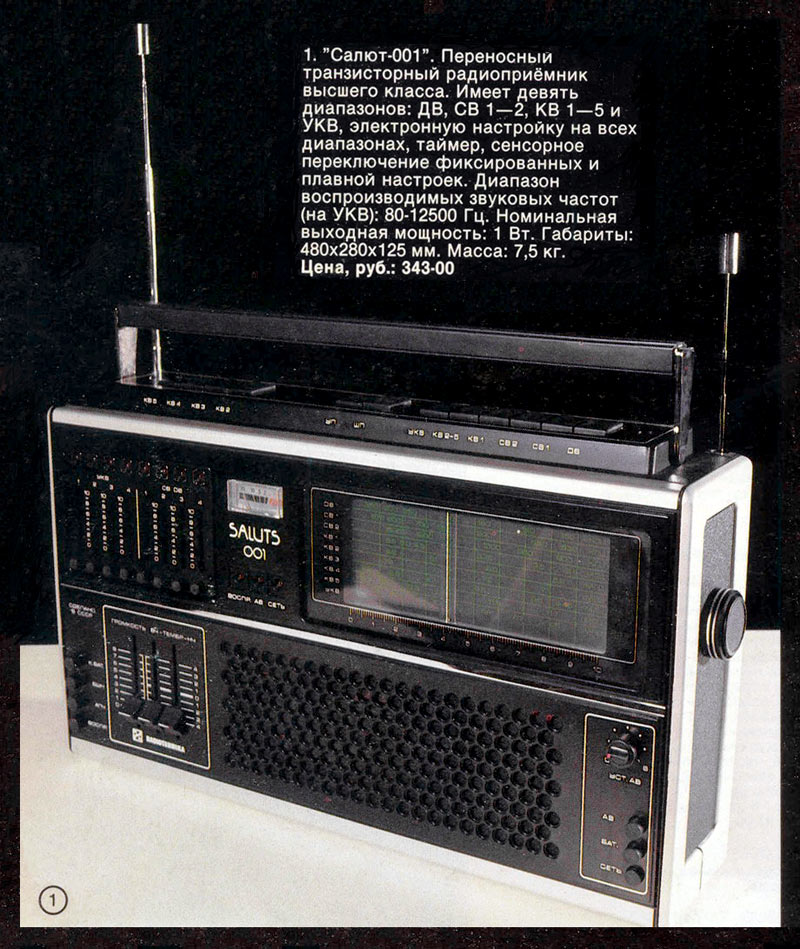 Переносной радиоприёмник *Салют-001* с 1980 года выпускал Рижский радиозавод имени А.С.Попова. Радиоприёмник высшего класса *Салют-001* создан специалистами КБ **Орбита** и предприятия **Штерн-радио** ещё в 1977 году. Приёмник отличается весьма высокими характеристиками, рядом потребительских качеств и не уступает лучшим мировым образцам. Электронная настройка и АПЧ во всех диапазонах, сенсорное переключение фиксированных настроек (а их 8, 4 в УКВ и 4 в остальных), возможность автовыключения приёмника по заданному времени, двойное преобразование частоты при приёме в диапазонах KB, многопетлевая система АРУ не полный перечень схемных особенностей применённых в приёмнике. Приёмник построен по функционально-блочному принципу. Блок ПЧ-ЧМ, блок регулирования громкости и тембра, кассета для убирающегося сетевого шнура разработаны немецкими специалистами, остальные и конструкция приёмника специалистами КБ **Орбита**. Экспортный вариант приёмника именовался **EuroMatic-001**, а ещё **Salute-001** и отличался другими частотами диапазонов КВ и УКВ.