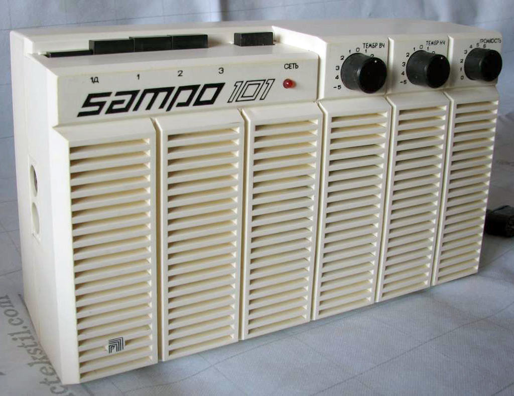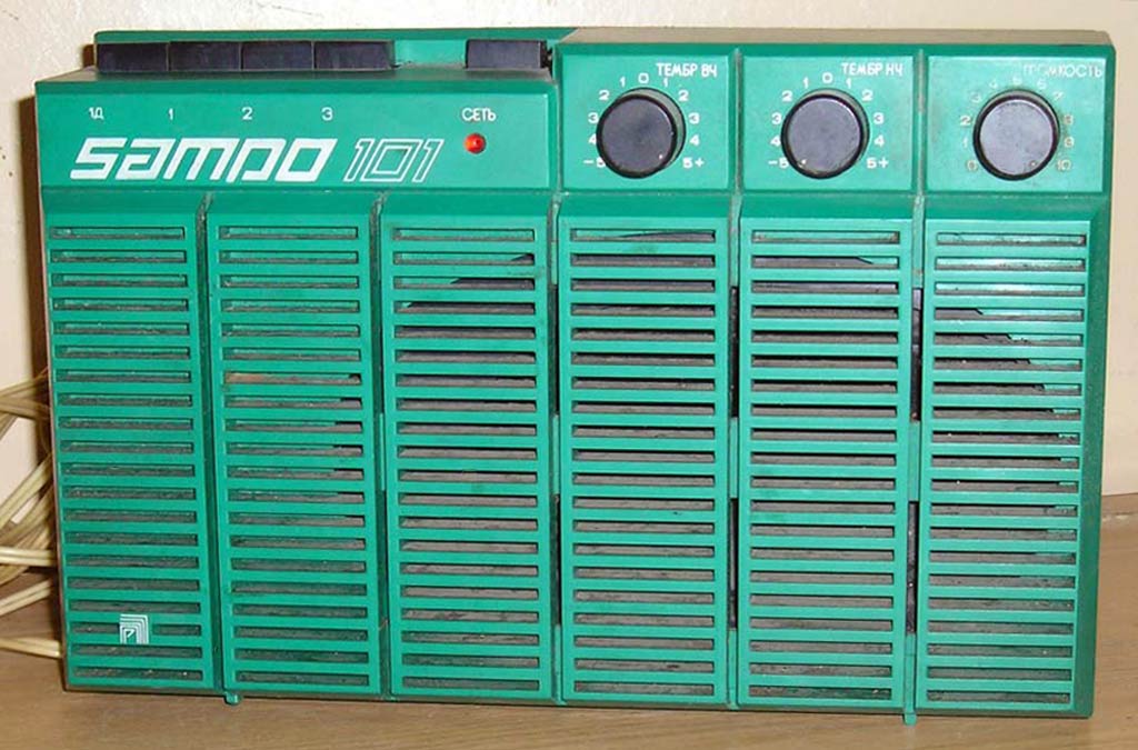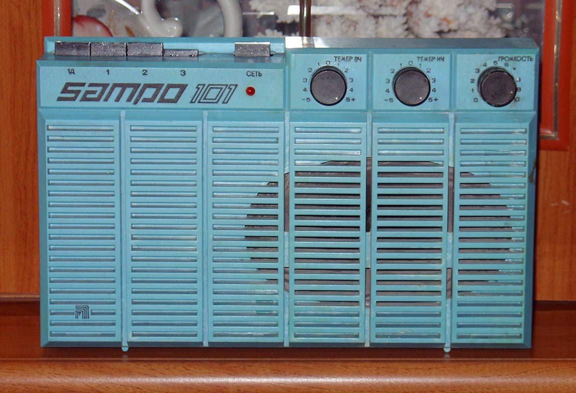 Приёмник трёхпрограммный *Сампо-101* выпускался с 1987 года Петрозаводским радиозаводом. Первый отечественный трёхпрограммный приёмник проводного вещания 1-й группы сложности **Сампо-101** предназначен для приёма программ транслируемых по уплотненной проводной трансляционной радиосети. Особенность ПТ - автоматическая регулировка чувствительности, которая позволяет получить одинаковую для всех программ громкость звучания при одном положении регулятора громкости, постоянный уровень записи на магнитофон независимо от уровней сигнала в каналах. ПТ имеет: регуляторы тембра по ВЧ и НЧ; индикатор включения сети; линейный выход сигнала. Корпус модели выполнен из цветного ударопрочного полистирола. Диапазон воспроизводимых частот 63...12500 Гц. Уровень звукового давления 75 дБ. Отношение сигнал/фон -53 дБ. Номинальная выходная мощность 0,5 Вт. Размеры ПТ - 277х174х101 мм. Масса - 1,8 кг.