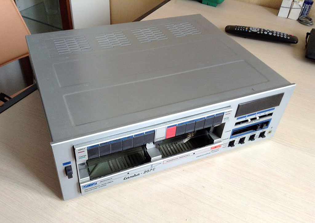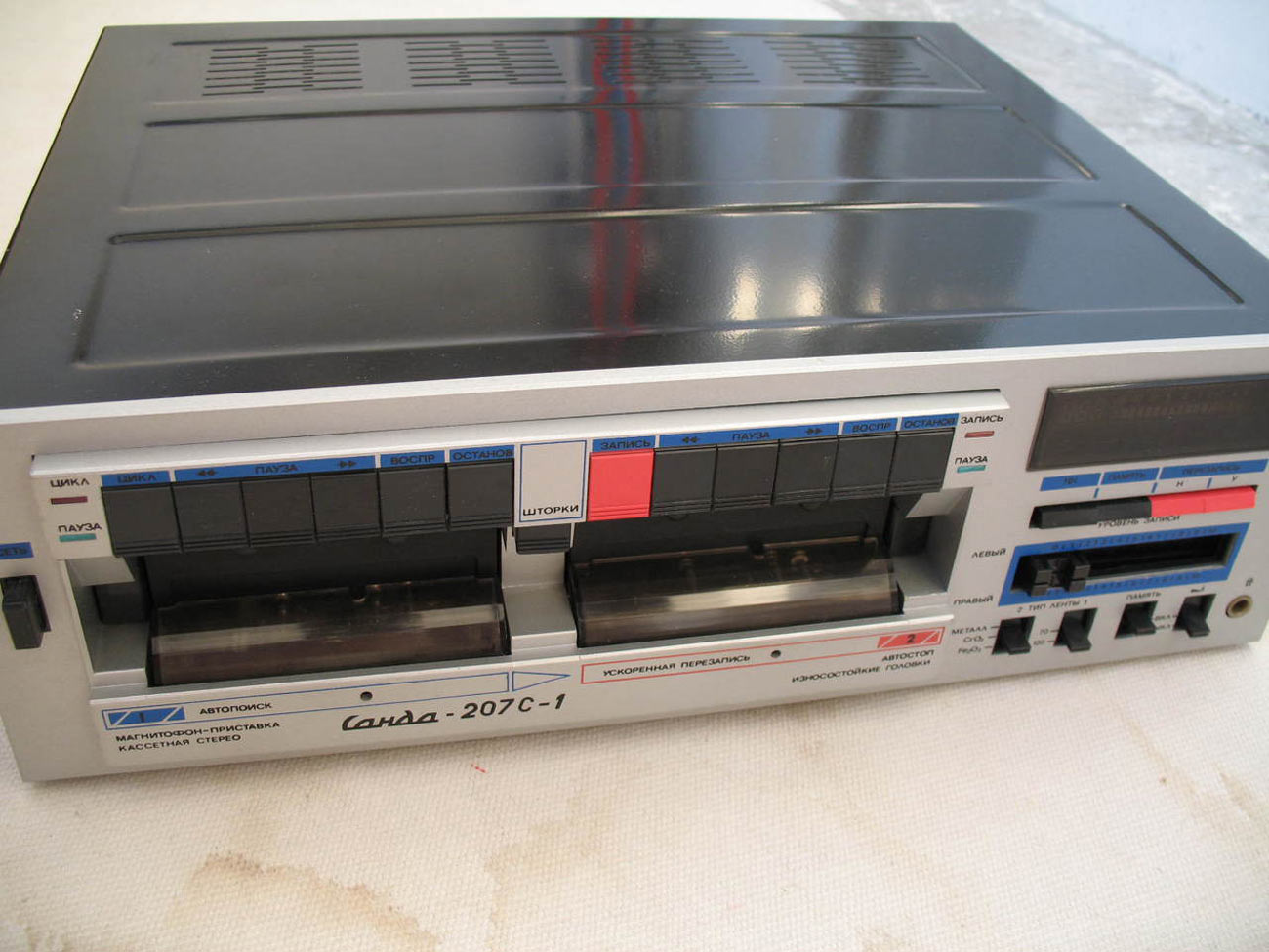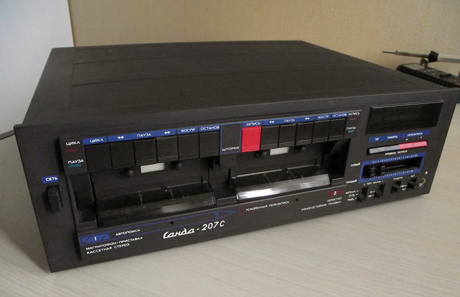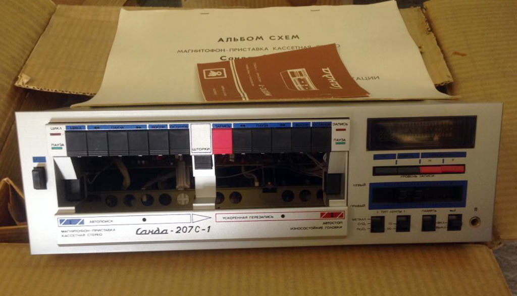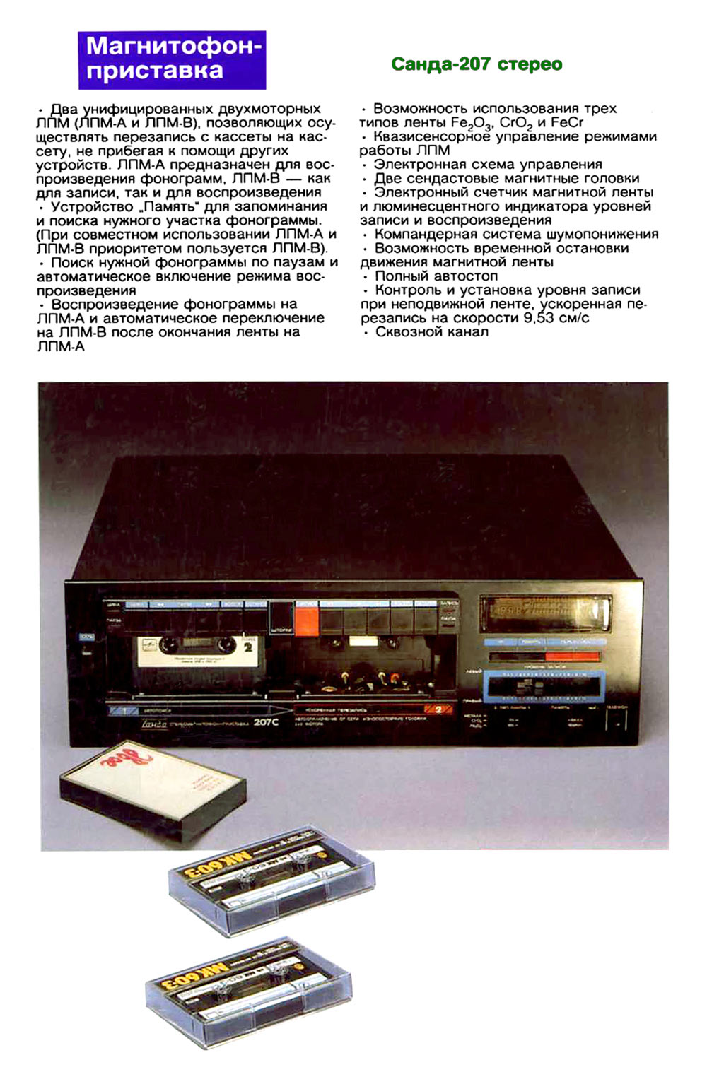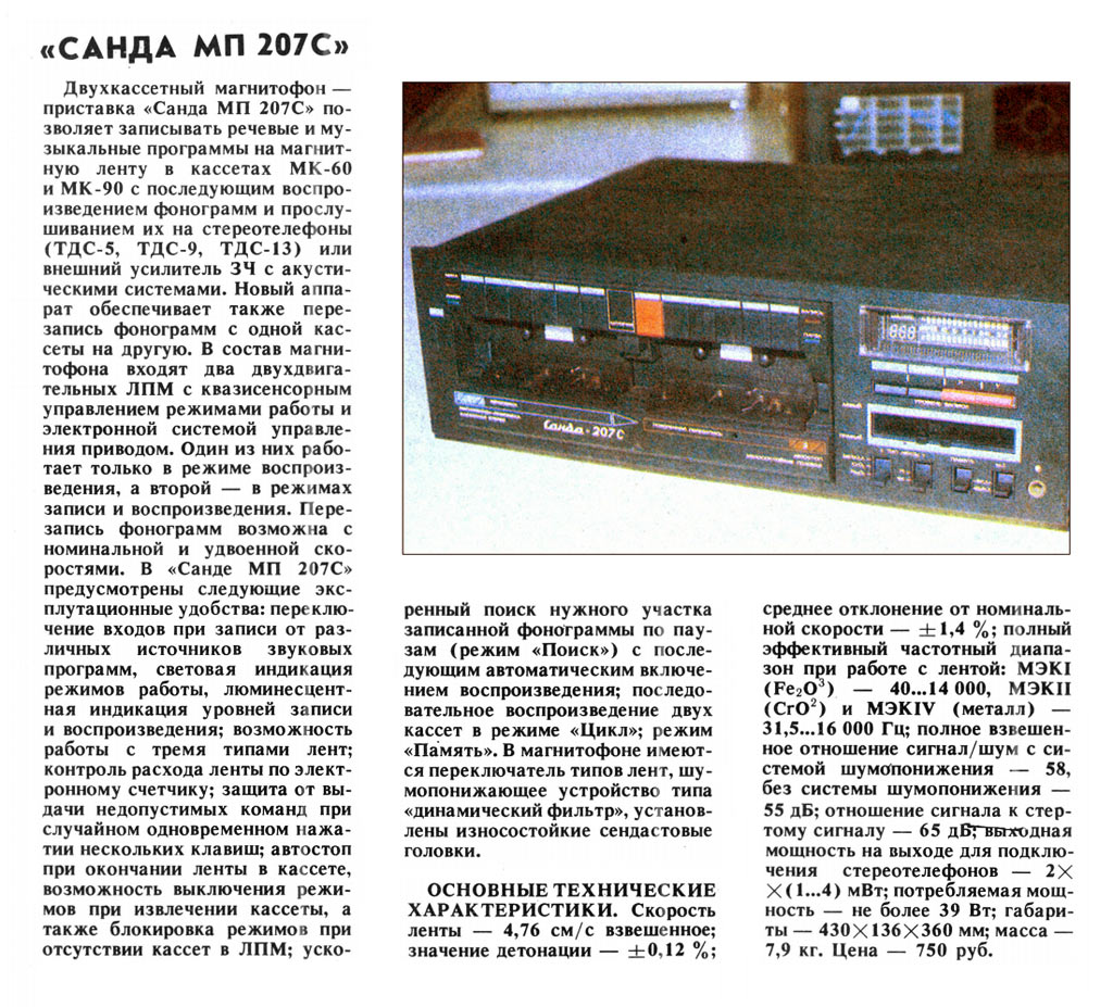 Магнитофон-приставка *Санда-207С* с 1988 года выпускалась Марийским машиностроительным заводом. С 1989 года наименование изменено на *Санда МП-207С*. МП является аналогом модели *Вильма-207С* и позволяет записывать фонограммы на магнитную ленту в кассетах МК, с их последующим воспроизведением на стереотелефоны или УКУ с АС. МП обеспечивает и перезапись фонограмм с кассеты на кассету. В состав МП входят два двух-двигательных ЛПМ с квазисенсорным управлением режимами работой электронной системой управления. Один ЛПМ работает в режиме воспроизведения, второй ЛПМ в режиме записи и воспроизведения. Перезапись фонограмм возможна с номинальной и удвоенной скоростями. В МП предусмотрены: переключение входов; световая индикация режимов работы; люминесцентная индикация уровней З/В; возможность работы с тремя типами лент; контроль расхода ленты по электронному счетчику; защита от недопустимых команд при случайном нажатии нескольких клавиш; автостоп при окончании ленты; выключения режимов при извлечении кассеты; ускоренный поиск фонограмм по паузам с автовключением на воспроизведение; последовательное воспроизведение двух кассет в режиме *Цикл*; режим *Память*; система шумоподавления; сендастовые головки. Диапазон частот, при использовании ленты с порошком хрома 40...16000 Гц. Уровень шума -55 дБ. Выходная мощность на стереотелефонах 2х5 мВт. Потребляемая от сети мощность 40 Вт. Габариты МП - 430х136х360 мм. Масса 7,9 кг. Магнитофон-приставка *Санда МП-207С-1* выпускаемая с 1991 года по своей конструкции, оформлению и параметрам схожа с базовой.