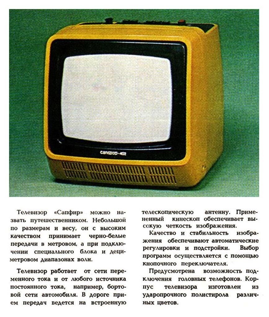 Телевизор *Сапфир-402* в 1983 году подготовило к выпуску Рязанское ПО *Красное Знамя*. Телевизор *Сапфир-402* (4УПИТ-23) работает в МВ диапазоне. Выбор программ - кнопочный, можно выбрать одну из 6-ти заранее настроенных программ. Чувствительность 30 мкВ. Номинальная выходная мощность 0,3 Вт. Диапазон воспроизводимых частот - 400...3500 Гц. Питание от сети или аккумулятора. Потребляемая мощность 25 и 17 Вт. Габариты телевизора 325х225х225 мм. Масса 6,5 кг. Цена 220 рублей. Реклама из каталога *Товары народного потребления за 1984 год.