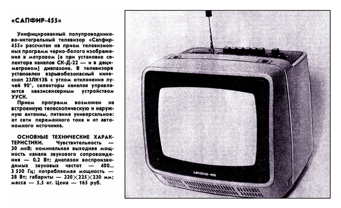 Телевизионный приёмник чёрно-белого изображения *Сапфир-455* с 1987 года опытно выпускало Рязанское ПО *Красное Знамя*. Унифицированный полупроводниково-интегральный телевизор *Сапфир-455* рассчитан на приём телевизионных программ в диапазоне МВ, а при установке селектора каналов СК-Д-22 и в диапазоне ДМВ. В модели установлен взрывобезопасный кинескоп 23ЛК13Б с углом отклонения лучей 90 градусов. Селекторы каналов управляются квазисенсорным устройством УУСК. Приём программ возможен на встроенную телескопическую и наружную антенны, питание универсальное: от сети переменного тока и от автономного источника 12 В. Основные технические характеристики ТВ: Чувствительность по каналу изображения 30 мкВ. Номинальная выходная мощность канала звукового сопровождения 0,2 Вт. Диапазон воспроизводимых звуковых частот не уже 400...3550 Гц. Потребляемая мощность от сети 28 Вт, от аккумулятора 16 Вт. Габариты телевизора - 220х225х230 мм. Масса - 5,5 кг. Цена 165 рублей.