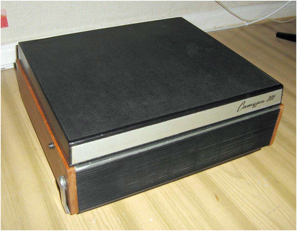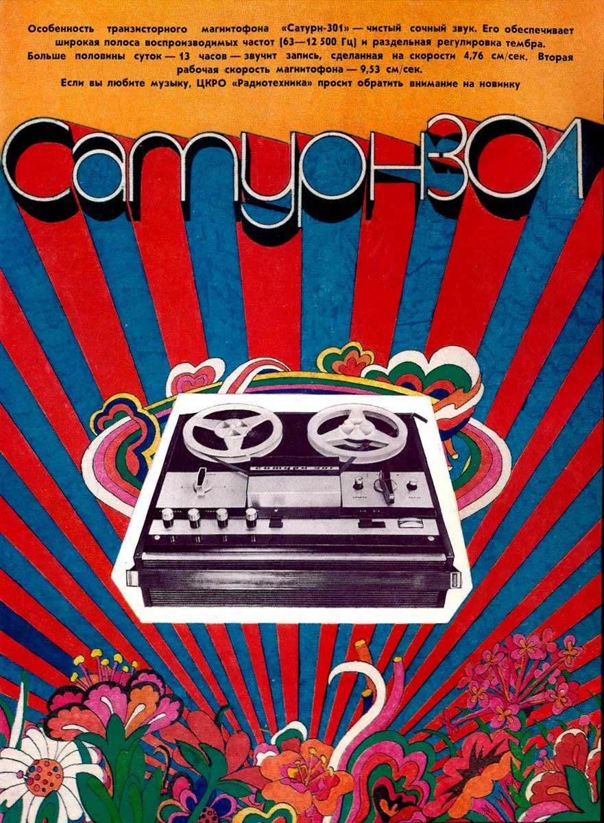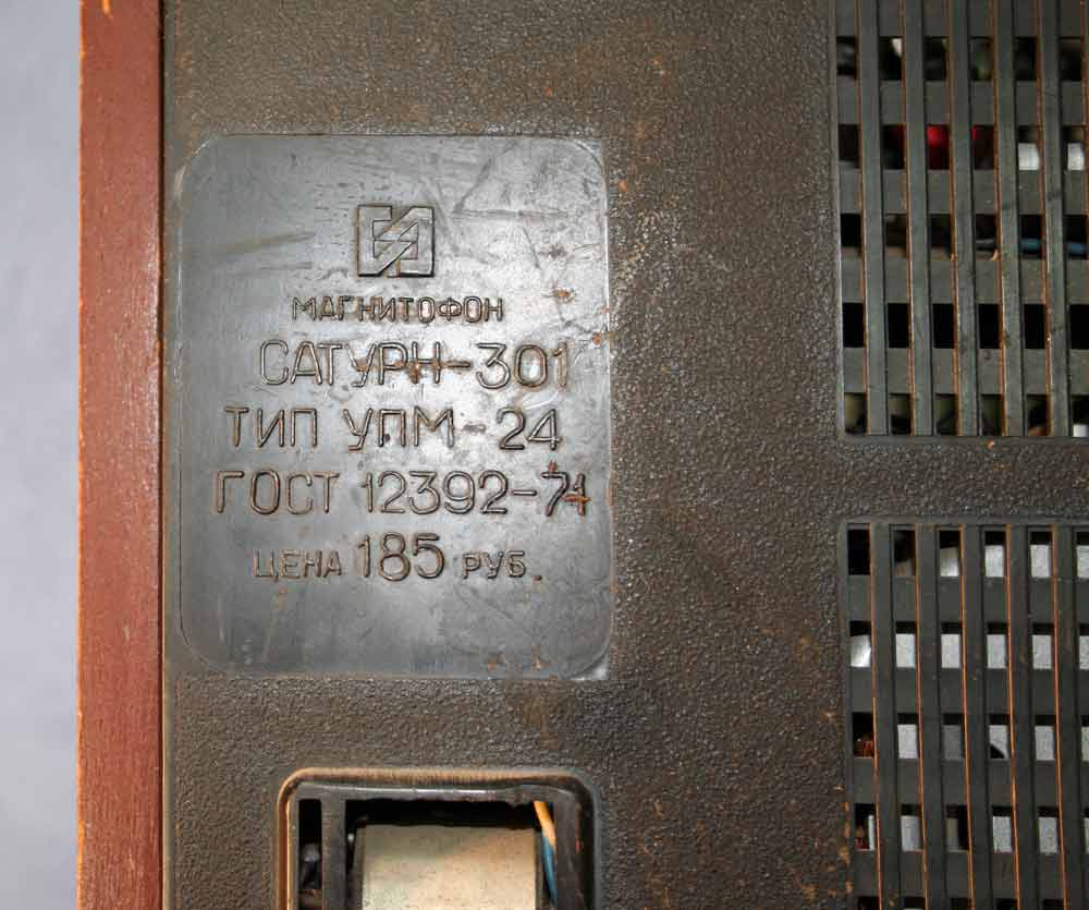 Катушечный транзисторный магнитофон *Сатурн-301* с I-кв 1973 года выпускал Омский Электротехнический завод имени Карла Маркса. Четырёхдорожечный двухскоростной магнитофон **Сатурн-301** предназначен для записи и воспроизведения речевых и музыкальных программ. В магнитофоне имеется индикатор уровня записи, кнопка пауза, регуляторы тембров. Прослушивать запись можно через громкоговоритель, внешнюю АС или же головные телефоны. Магнитная лента А4407-6Б. Номер катушки 15. Скорость движения магнитной ленты 9,53 и 4,76 см/сек. Максимальное время записи на скорости 9,53 см/сек - 4 часа 15 минут, 4,76 см/сек - 8 часов 30 минут. Рабочий диапазон звуковых частот на ЛВ на скорости 9,53 см/сек - 63...12500 Гц, 4,76 см/сек - 63...6300 Гц. Коэффициент детонации на скорости 9,53 см/сек - 0,3 %, 4,76 см/сек - 2 %. Диапазон регулировки тембров по ВЧ и НЧ - 15 дБ. Номинальная выходная мощность при работе на встроенную АС - 2, внешнюю АС - 6 Вт. Потребляемая от сети мощность 45 Вт. Габариты магнитофона - 375х335х141 мм. Его масса 9,5 кг. Цена 185 рублей.