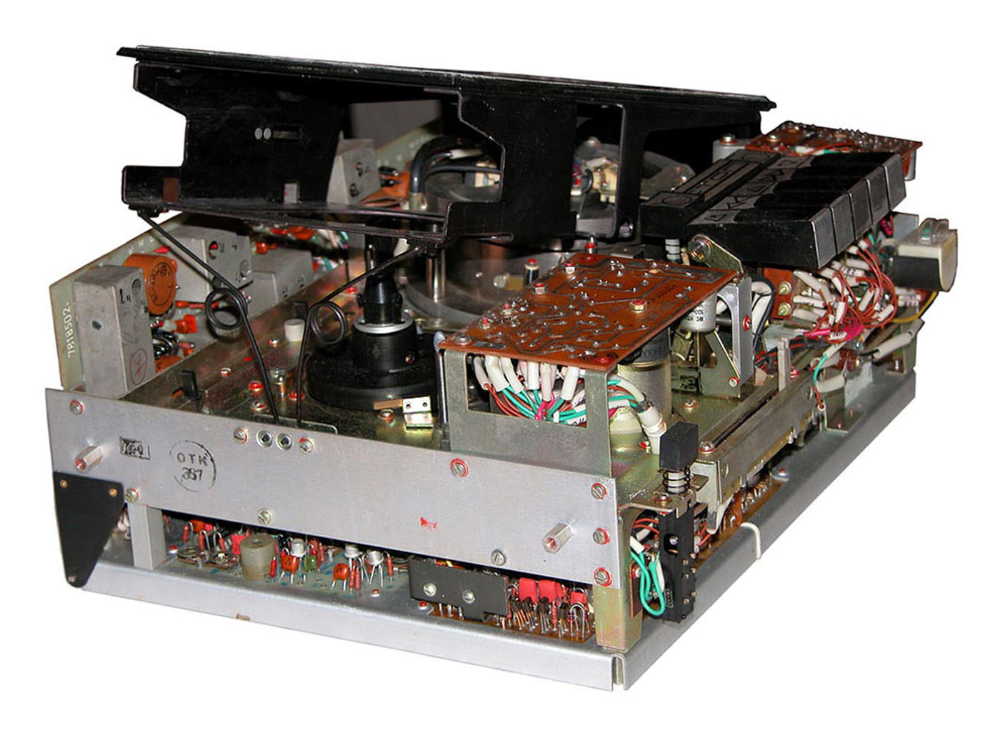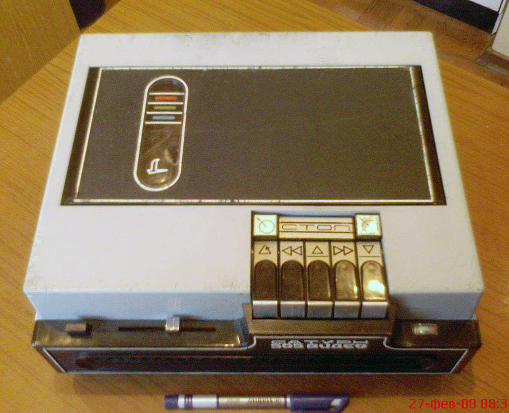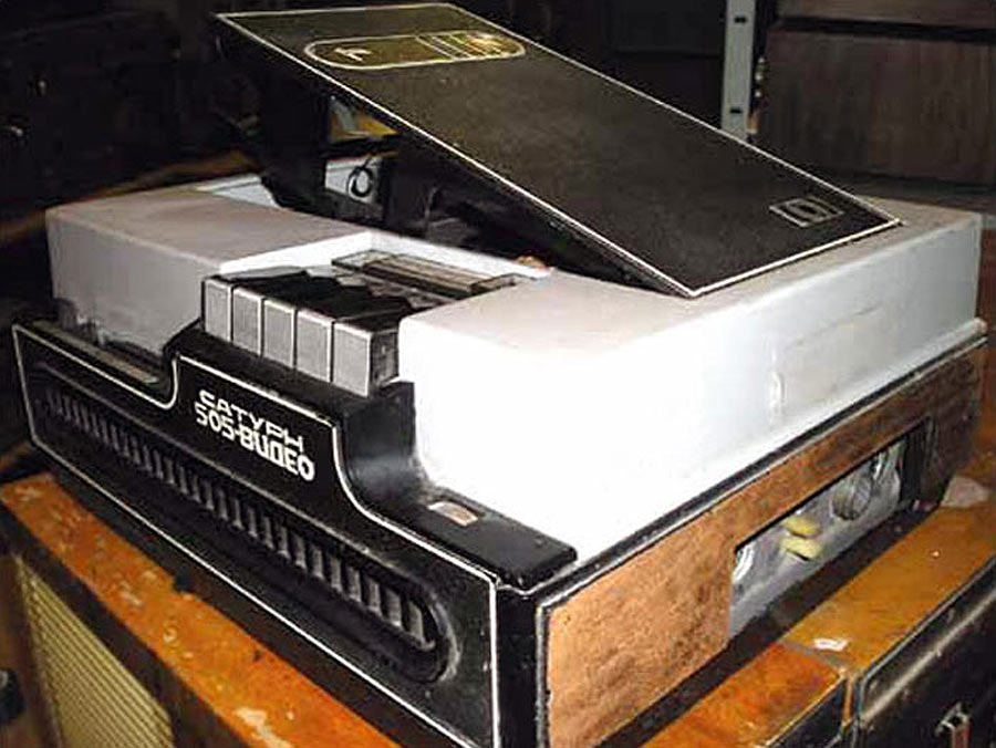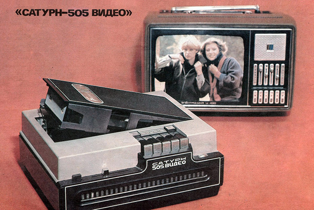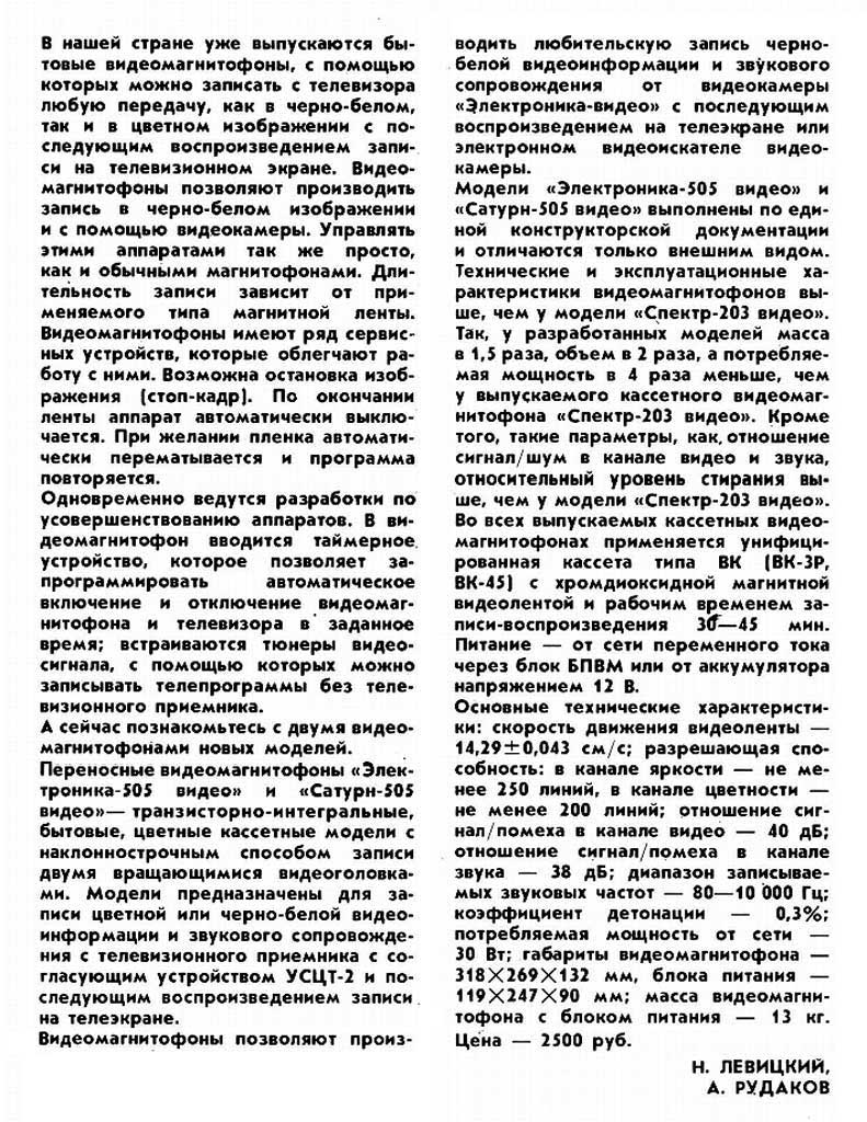 Кассетный видеомагнитофоны *Сатурн-505-видео* с 1979 года выпускал Раменский приборостроительный завод. Видеомагнитофон является копией модели *Электроника-505-Видео*. Это так же транзисторно-интегральный цветной кассетный видеомагнитофон стандарта VCR, с наклонно-строчным способом записи двумя видеоголовками. Видеомагнитофон предназначен для записи и воспроизведения цветных и ч/б видеосигналов и звукового сопровождения от телевизора с согласующим устройством УСЦТ-2. Кроме того ВМ позволяет производить запись ч/б видеоинформации и звукового сопровождения от видеокамеры. Питается аппарат от сети переменного тока через внешний блок питания или от аккумуляторов. Скорость протяжки ленты 14,29 см/с. Разрешающая способность по горизонтали в канале яркости 250 линий, цветности 200 линий. Отношение сигнал/помеха в канале изображения 40 дБ, звукового сопровождения 38 дБ. Диапазон частот канала звука 80...10000 Гц. Коэффициент детонации ± 0,3 %. Потребляемая мощность 30 Вт. Габариты модели - 318x269x132 мм, блока питания - 119x247x90 мм. Масса модели - 10 кг, блока питания - 3 кг. Цена - 2500 рублей.
