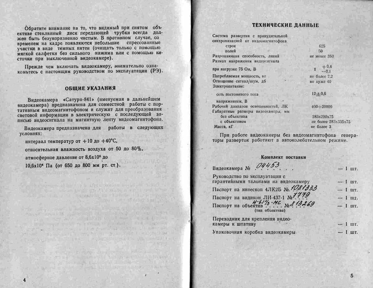 Видеокамера *Сатурн-841* выпускалась предположительно с 1977 года Раменским приборостроительным заводом. ВК предназначена для работы с портативным видеомагнитофоном и служит для преобразования визуальной световой информации в электрическую, с последующей записью ч/б видеосигнала на магнитную ленту видеомагнитофона. Видеокамера аналогична видеокамере *Электроника-841* выпуска 1974 года. Более подробная информация содержится на нескольких страницах инструкции к видеокамере и в описании видеокамеры *Электроника-841* на соответствующей странице сайта.