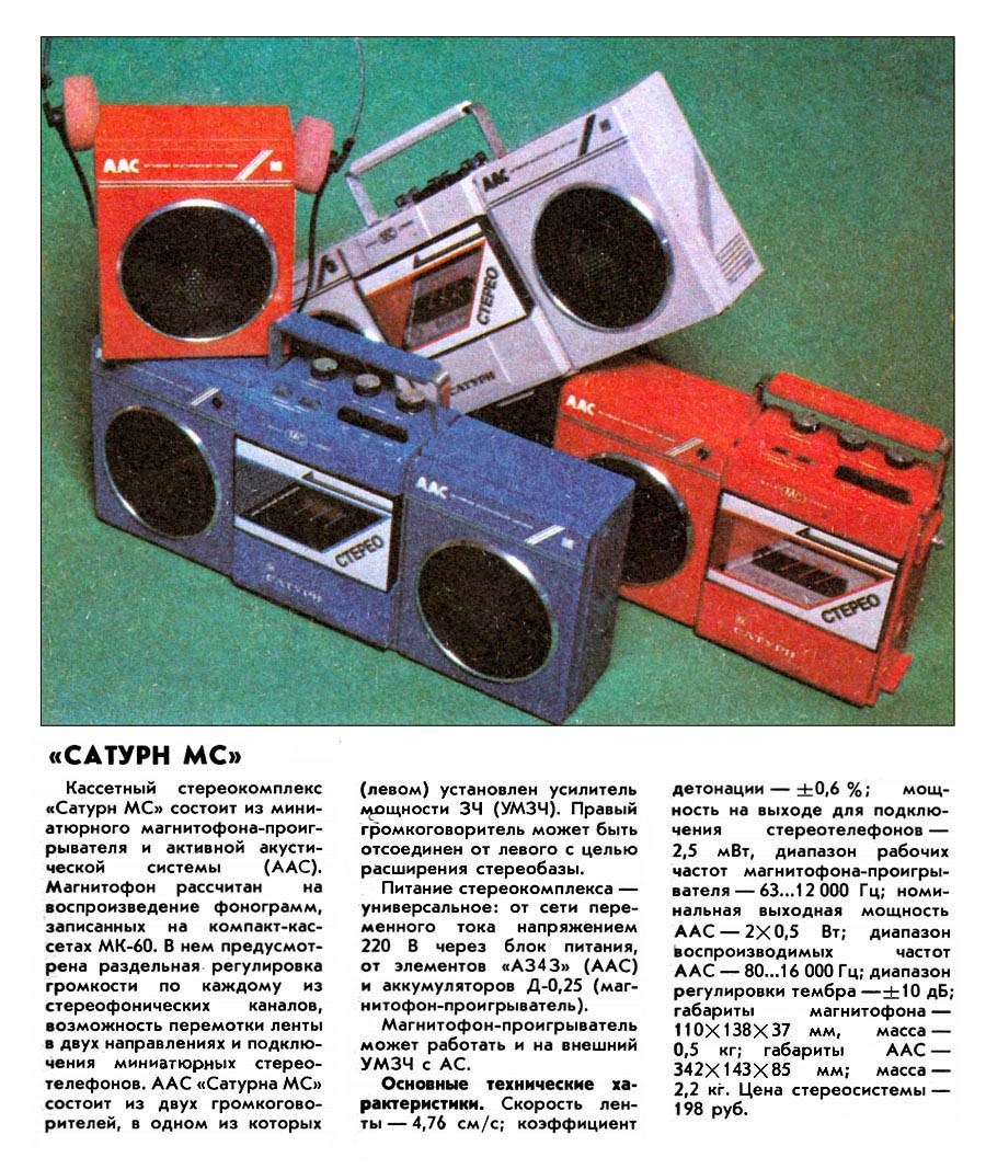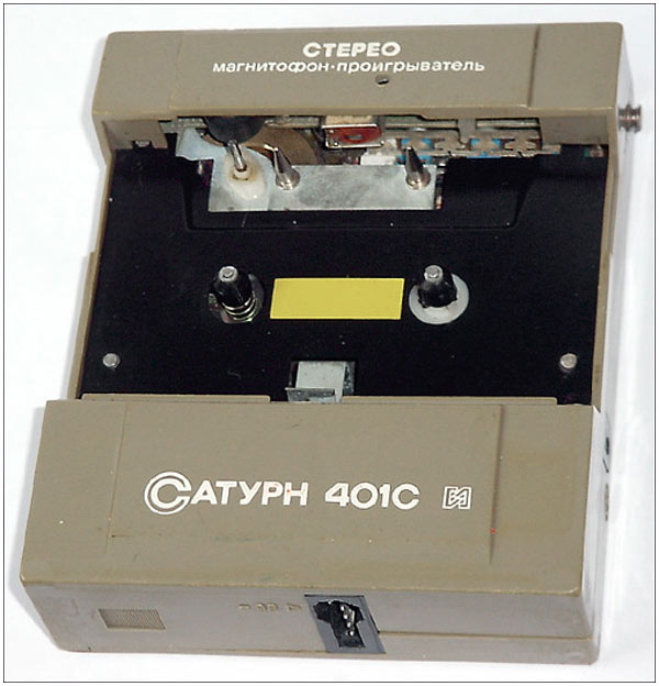 Активная стереосистема и магнитофон-проигрыватель *Сатурн-401С* с 1988 года выпускалась Омским ЭТЗ им. Карла Маркса. Первые выпуски именовались *Сатурн МС*. Стереосистема и магнитофон-проигрыватель **Сатурн-401С** (с 1989 года *Сатурн П-401С*) - переносный, блочный аппарат, состоящий из магнитофона и активной АС с выносным БП. Магнитофон воспроизводит моно и стерео фонограммы с кассет МК-60 на стереофонические телефоны ТДС-13 или на ААС. В плейере имеется раздельная регулировка громкости, ускоренная перемотка ленты в обоих направлениях. Питание плейера осуществляется от аккумуляторов или от сети через БП при совместной работе с ААС. Скорость ленты 4,76 см/с. Коэффициент детонации 0,5%. Диапазон частот 63...10000 Гц. Мощность на выходе телефонов 2,5 мВт. Мощность потребляемая от сети 4 Вт. Габариты плейера 138х337х88 мм. Вес 0,5 кг. ААС состоит из объединенного с громкоговорителем левого канала усилителя и громкоговорителя правого канала. В комплексе есть регулировка громкости и тембров по НЧ и ВЧ. К ААС можно подключить стереотелефоны. Питание комплекса универсальное, от элементов 343 или от сети через блок питания. Номинальная выходная мощность ААС - 2х0,5 Вт. Электрический диапазон воспроизводимых частот ААС - 80...16000 Гц. Диапазон частот воспроизводимых громкоговорителями 120...10000 Гц. Время работы от батарей 10 часов. Габариты ААС - 342х143х85 мм. Масса 2,2 кг. К комплексу выпускался тюнер *Сатурн-Т-201С*, которым можно заменить МП, вытащив его и вставив тюнер или использовать автономно, принимая стереофонические программы УКВ диапазона на стереотелефоны.