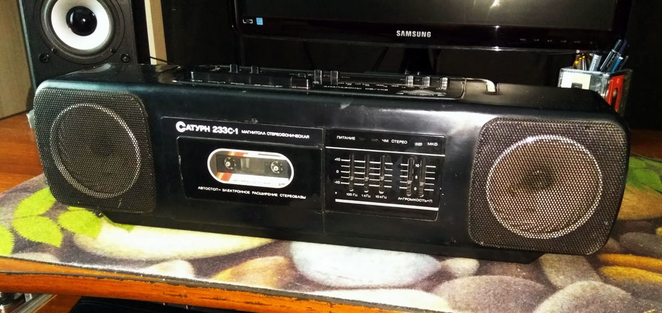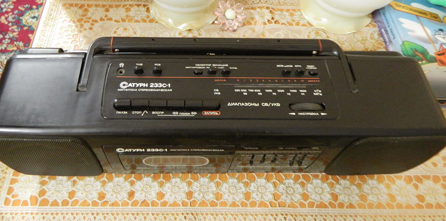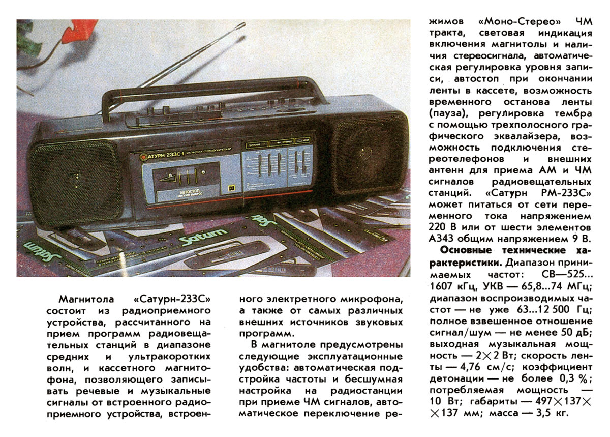 Носимая магнитола *Сатурн РМ-233С-1* выпускалась с 1992 года Омским ЭТЗ им. К. Маркса, ПО *Сатурн*. Магнитола состоит из приёмного устройства, работающего в диапазоне СВ, УКВ и кассетного магнитофона, позволяющего записывать фонограммы от встроенного радиоприёмника, электретного микрофона и внешних источников. В магнитоле предусмотрены: АПЧ и бесшумная настройка при приёме ЧМ сигналов, автоматическое переключение режимов моно-стерео, световая индикация включения магнитолы и наличия стереосигнала, АРУЗ, автостоп при окончании ленты в кассете, возможность временного останова ленты, регулировка тембра с помощью трехполосного графического эквалайзера, возможность подключения стереотелефонов и внешних антенн. Магнитола может питаться от сети переменного тока или от 6 элементов А343. Диапазон принимаемых частот: СВ 525...1607 кГц, УКВ 65,8...74 МГц; диапазон воспроизводимых частот 63...12500 Гц; взвешенное отношение сигнал/шум не менее 50 дБ; выходная музыкальная мощность 2X2 Вт; скорость ленты 4,76 см/с; детонация 0,3%; потребляемая мощность 10 Вт; габариты магнитолы 497х137х137 мм; масса 3,5 кг.