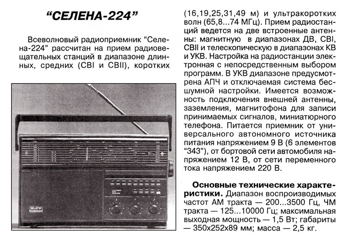 Радиоприёмник *Селена-224* (Selena-224) с 1994 года выпускал Гродненский завод *Радиоприбор*. В отличие от экспортного приёмника *Selena-223*, 224 модель рассчитана на внутренний рынок. В 1995 году выпуск приёмников был прекращён. Информация о РП в рекламном проспекте.