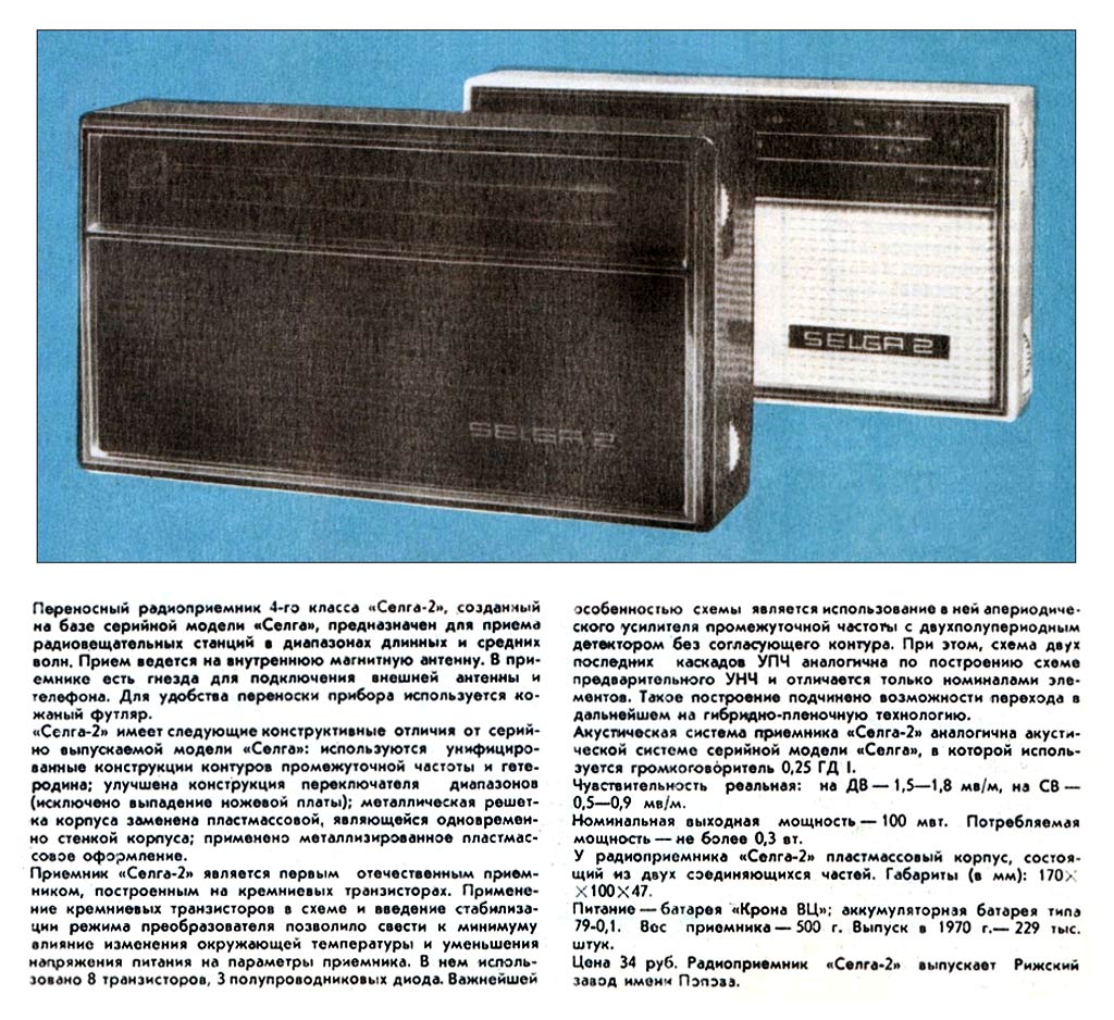 Портативный транзисторный радиоприёмник *Селга-2* с 1970 года выпускал Рижский радиозавод имени А.С.Попова. **Селга-2** - первый отечественный радиоприёмник, в котором были применены кремниевые транзисторы. Приёмник предназначен для приёма радиостанций в диапазонах ДВ и СВ. Приём осуществляется на внутреннюю магнитную антенну, имеются гнёзда для подключения внешней антенны и миниатюрного телефона. Приёмник размещен в кожаном футляре. Принципиальная схема и конструкция, даёт возможность в будущем использовать и интегральные микросхемы. Чувствительность приёмника 1,5 мВ/м. Селективность по соседнему каналу 20 дБ. Номинальная выходная мощность 100 мВт, максимальная 200 мВт. Габариты приёмника 170 х 100 х 47 мм. Его масса 500 грамм. Питание радиоприёмника *Селга-2* производится от батареи **Крона ВЦ** или аккумуляторной батареи **7Д-0,1**. С осени 1970 года номерное наименование радиоприёмника, где цифра *2* обозначала номер разработки, сменилось на *Селга-402*, где цифра *4* уже обозначала класс, а цифра *2* после нуля - порядковый номер разработки.
