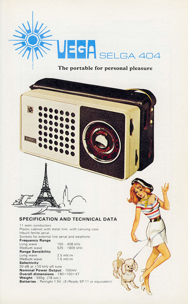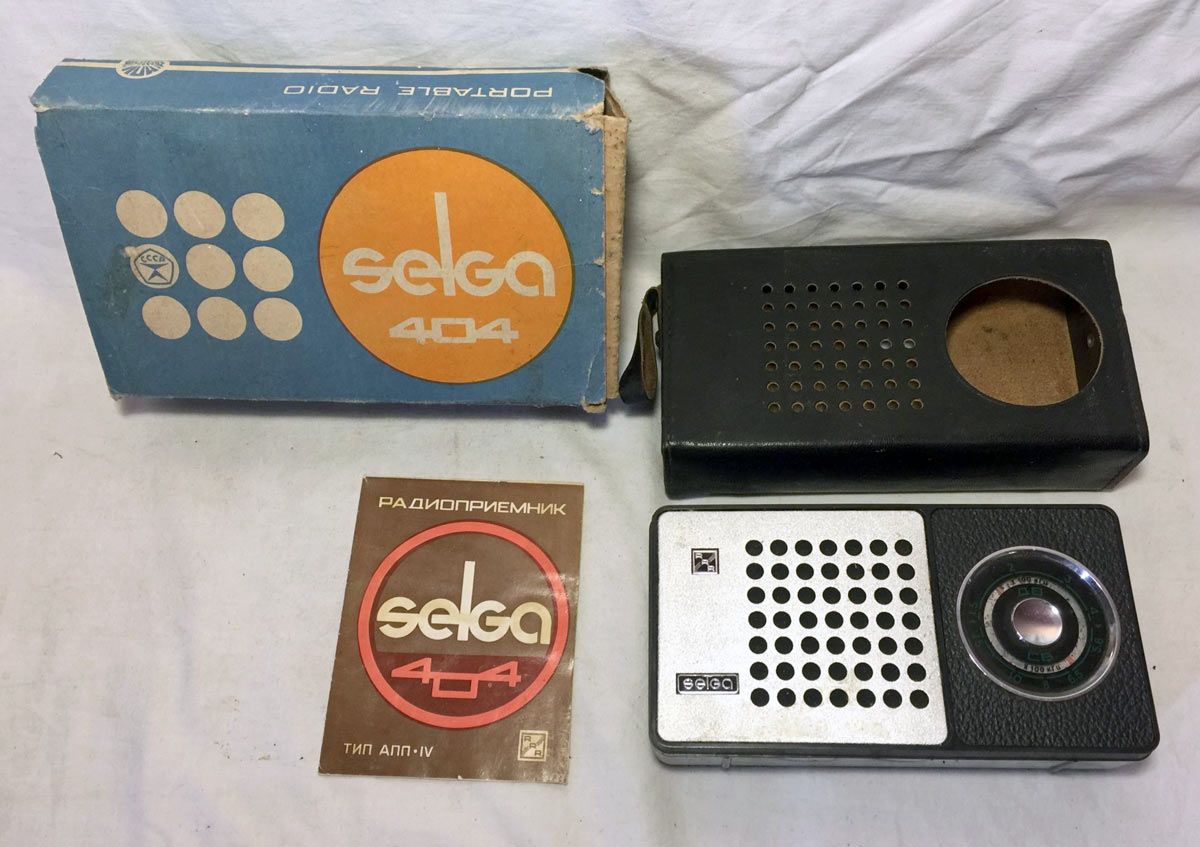 Портативный радиоприёмник *Селга-404* с 1973 года выпускал Рижский радиозавод имени Попова. Радиоприёмник разработан на основе модели **Селга-402** и рассчитан на приём в диапазонах ДВ, СВ. 3-х контурный ФСС в усилителе ПЧ заменен 2-х контурным полосовым фильтром, введена стабилизация гетеродина. Качество звука и громкость благодаря применению нового громкоговорителя 0,5ГД-37 значительно улучшились. Чувствительность приёмника **Селга-404** в ДВ диапазоне 1,2 мВ/м, СВ - 0,6 мВ/м. Избирательность по соседнему каналу не менее 26 дБ. Питается приёмник от батареи *Крона ВЦ* или от шести элементов А-316. Габариты приёмника - 190 х 100 х 46 мм, масса 0,7 кг. Цена приёмника в основной комплектации 32 рубля 67 копеек. Экспортные радиоприёмники имели наименование *Comix* и *Vega*. Выпускали радиоприёмники *Селга-404* только в одной цветовой гамме (чёрный цвет).