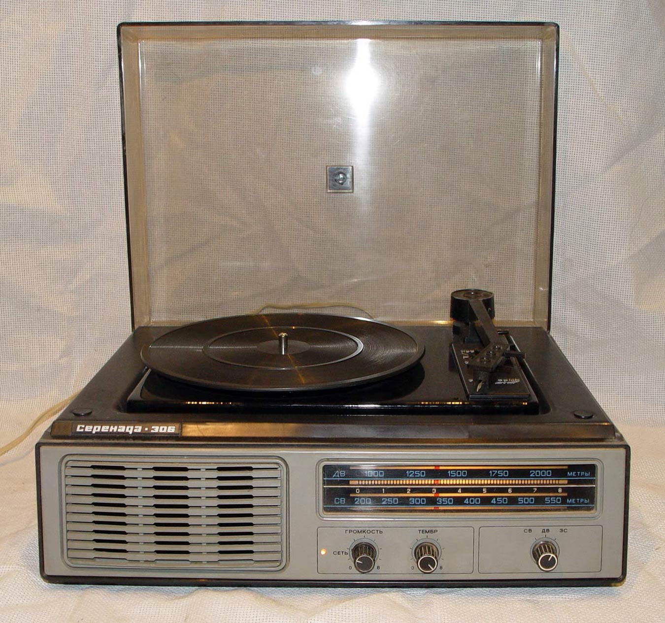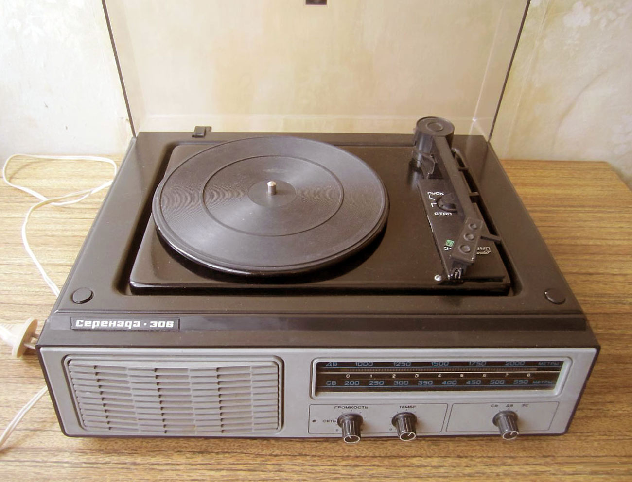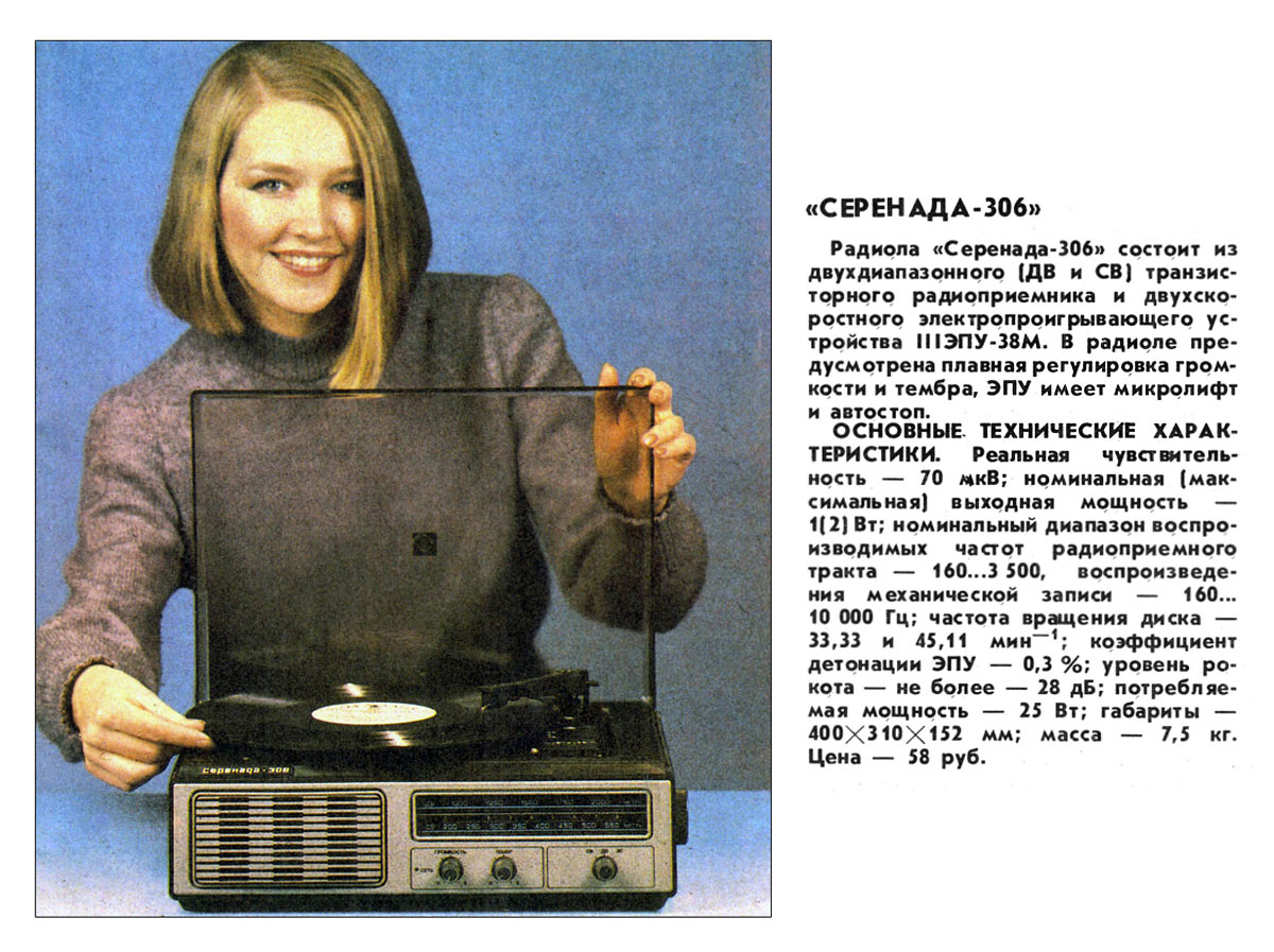 Стационарная транзисторная радиола *Серенада-306* с I-кв 1984 года выпускалась Владивостокским завод *Радиоприбор*. Радиола **Серенада-306** состоит из двухдиапазонного транзисторного радиоприёмника и 2-х скоростного электропроигрывающего устройства III-ЭПУ-38М. В радиоле имеется плавная регулировка громкости и тембра по ВЧ. ЭПУ имеет микролифт и автостоп. Корпус у радиолы из пластмассы и дерева. Чувствительность на обоих диапазонах 70 мкВ. Номинальная выходная мощность - 1 Вт, максимальная - 2 Вт. Номинальный диапазон воспроизводимых звуковых частот приёмного тракта - 160...3500 Гц, механической записи не уже - 160...10000 Гц. Частота вращения диска электропроигрывателя 33,33 и 45,11 об/мин. Коэффициент детонации 0,3 %. Уровень рокота 28 дБ. Потребляемая мощность 25 Вт. Габариты радиолы 400х310х152 мм. Вес 7,5 кг. Цена 62 рубля.