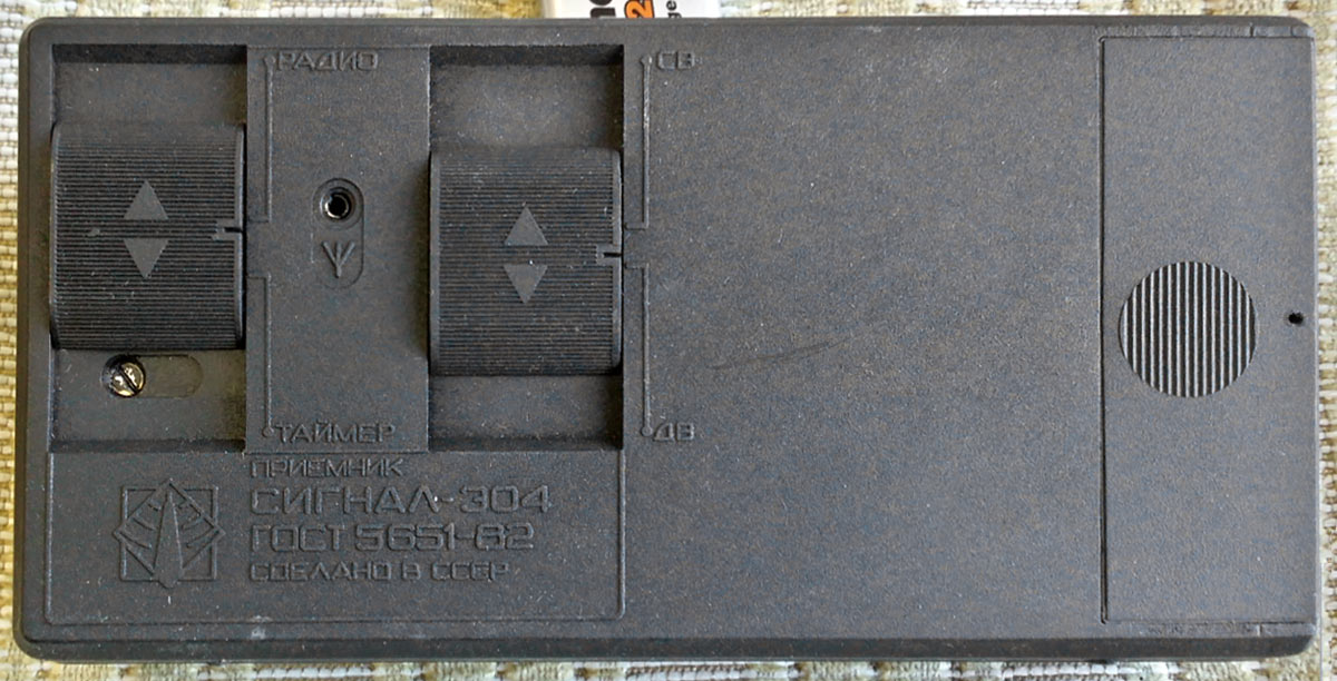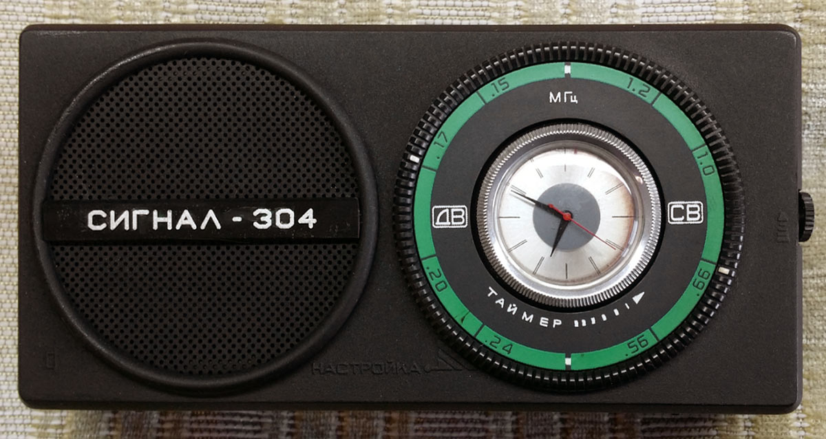 Радиоприёмник с часами и таймером *Сигнал-304* с 1985 года выпускал Каменск-Уральский ПСЗ. Приёмник 3-й группы сложности с часами и таймером **Сигнал-304** обеспечивает приём в диапазонах ДВ и СВ. Таймерное устройство обеспечивает отсчет текущего времени и автоматическое включение приёмника на 30 минут в установленное время. Имеются разъёмы для подключения внешней антенны и миниатюрного телефона. Питание от батареи Крона ВЦ или аккумулятора 7Д-0115. Корпус из ударопрочного полистирола чёрного цвета (был и серо-коричневый). Чувствительность в диапазонах ДВ 1,2, СВ 0,8 мВ/м. Диапазон воспроизводимых звуковых частот 450...3150 Гц. Номинальная выходная мощность 0,1, максимальная 0,15 Вт. Габариты приёмника 160х80х40 мм. Масса 450 г.