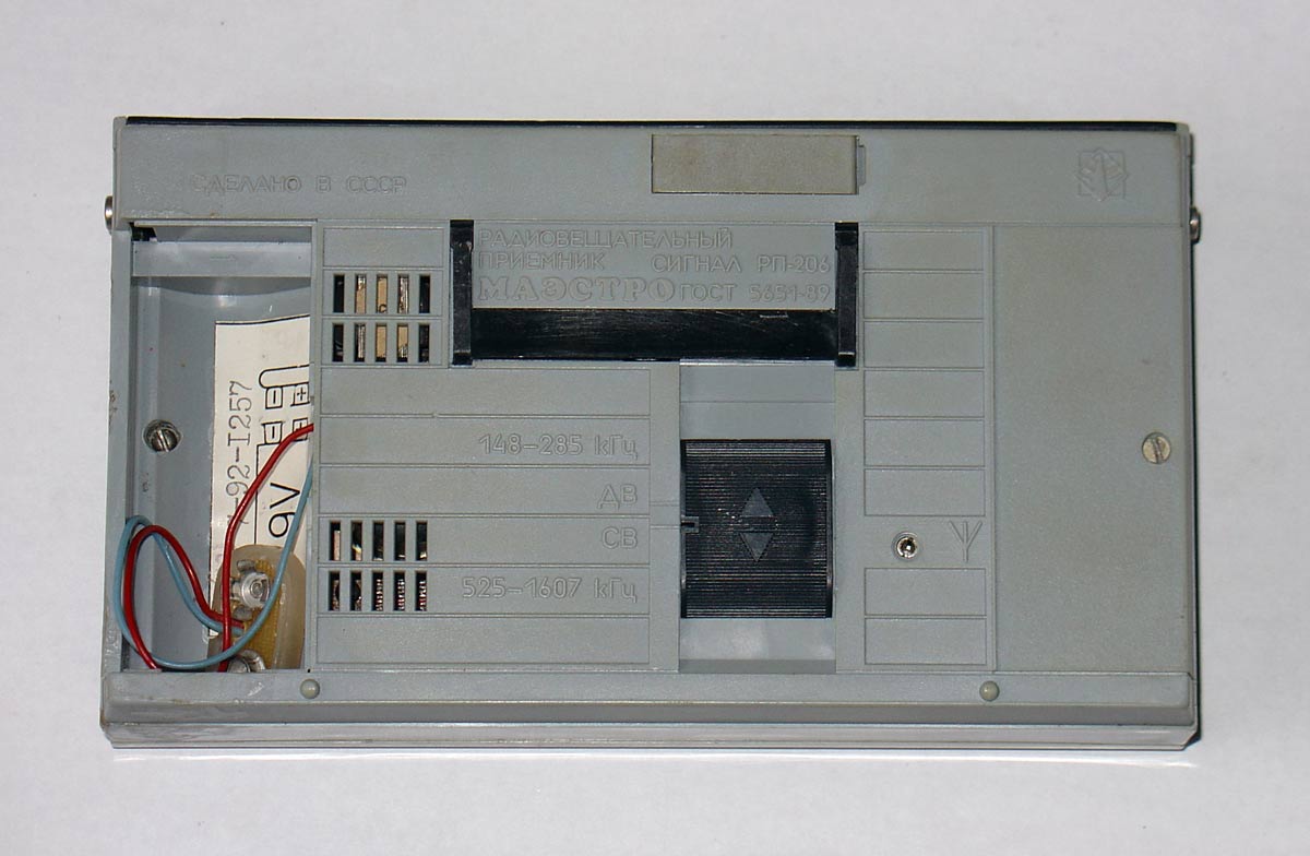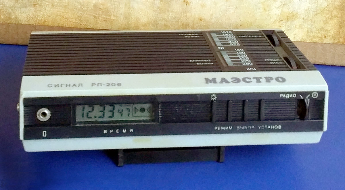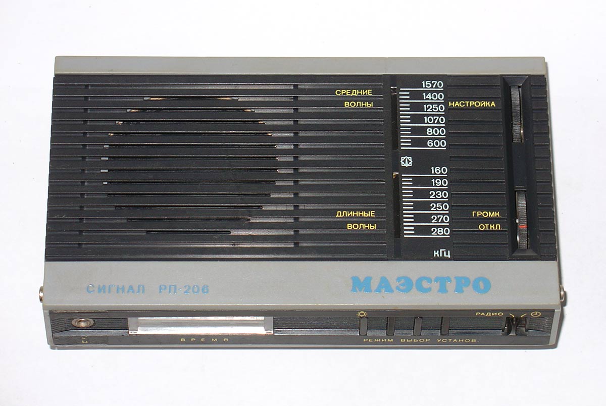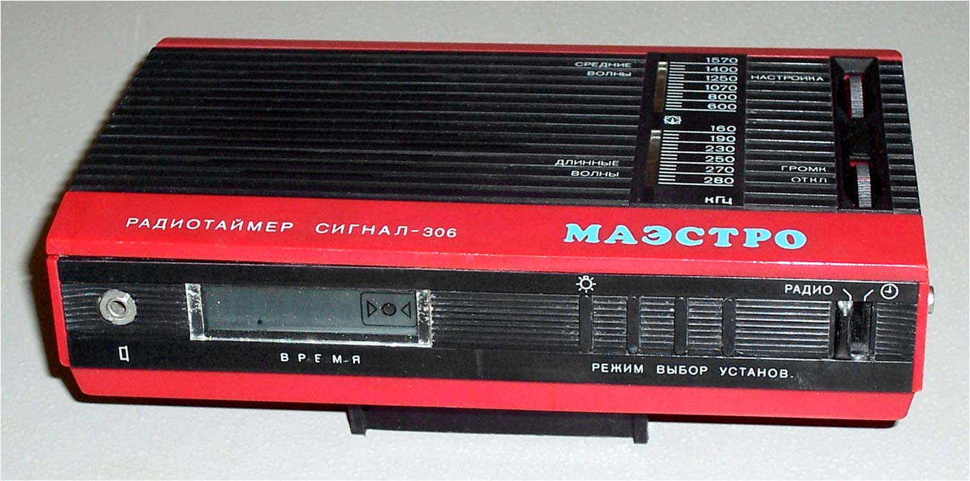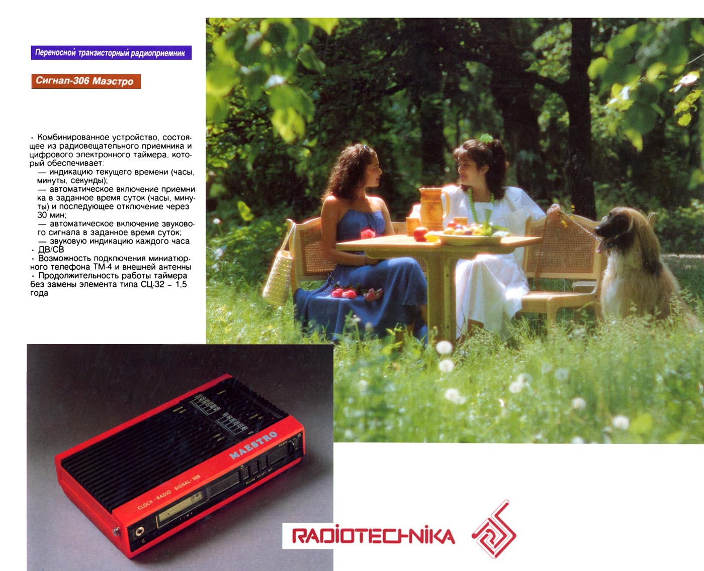 Портативный радиоприёмник *Сигнал-306* (Маэстро) с I-кв 1987 года выпускал Каменск-Уральский приборостроительный завод. Радиоприёмник **Сигнал-306** - это комбинированное устройство (радиотаймер) выполняющее функции электронных часов и радиоприёмника.Часы обеспечивают индикацию времени, сигнализацию начала каждого часа звуковым сигналом, включение звукового сигнала в нужное время, автоматическое включение радиоприёмника в заданное время и отключение через 30 минут работы. Питаются часы одним элементом типа СЦ-32. Питается приёмник от батареи Крона-ВЦ. Диапазоны волн: ДВ - 148...285; СВ - 525...1607 кГц, чувствительность, ограниченная шумами, в диапазоне: ДВ - 1,2; СВ - 0,8 мВ/м; избирательность по соседнему каналу - 28 дБ; выходная мощность усилителя низкой частоты (максимальная) 0,15 Вт; диапазон воспроизводимых звуковых частот 450...3150 Гц; габариты устройства - 164х38х93 мм; вес 0,42 кг. Цена 50 рублей 60 копеек. С 1989 года по новому ГОСТ-у завод выпускал приёмник *Сигнал РП-206*, по конструкции и оформлению одинаковый с вышеописанным.