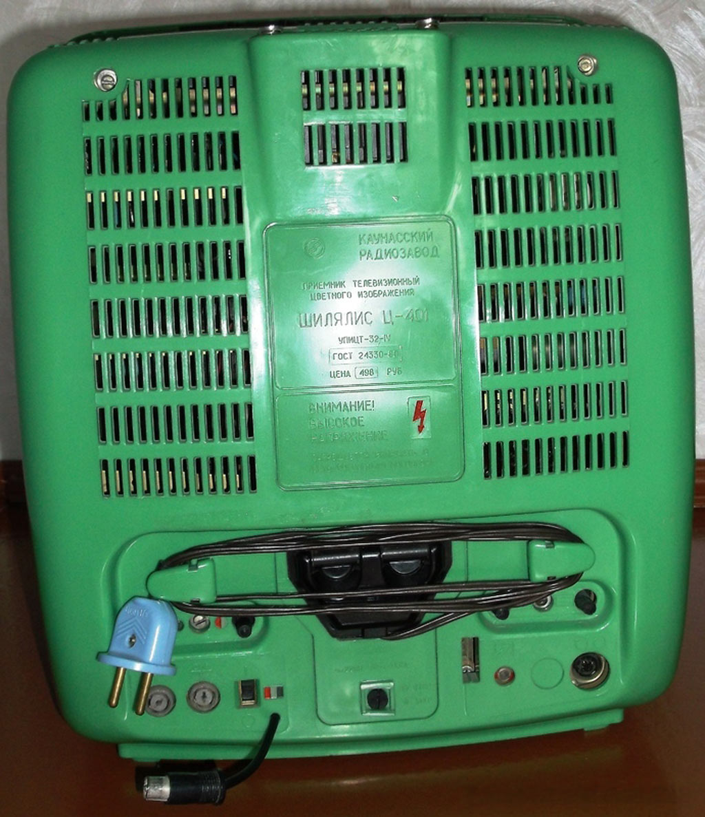 Телевизионный приёмник цветного изображения *Шилялис Ц-401* с 1978 года выпускал Каунасский радиозавод. Цветной блочно-модульный телевизор **Шилялис-Ц401** рассчитан на приём цветных и ч/б передач в МВ и ДМВ диапазонах. В телевизоре применён кинескоп 32ЛК1Ц, с размером диагонали экрана 32 см и электронный блок выбора программ, обеспечивающий предварительную настройку на шесть каналов МВ или ДМВ диапазона. Выбор программ осуществляется нажатием на кнопку псевдосенсорного переключателя. В модели имеются разъёмы для подключения головных телефонов, пульта ДУ, магнитофона на запись звукового сопровождения, видеомагнитофона. Размер изображения 182х246 мм. Чёткость по горизонтали 300 линий, по вертикали 400 линий. Номинальная выходная мощность 0,1 Вт. Питание от сети 220 В или источника постоянного тока 12 В. Мощность потребляемая от сети 100 Вт, от аккумулятора 60 Вт. Размеры модели 355х390х385 мм. Вес 17 кг.