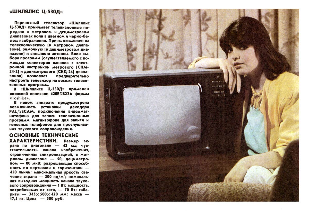 Телевизионный приёмник цветного изображения *Шилялис Ц-530Д* в 1987 году подготовил к выпуску *Каунасский радиозавод*. Унифицированный переносной цветной телевизор *Шилялис Ц-530Д* типа УПТЦ-42 - предназначен для приёма программ в цветном и чёрно-белом изображении в диапазонах МВ и ДМВ и для приёма звукового сопровождения программ. Приём производится на телескопическую в МВ диапазоне, рамочную в ДМВ или внешнюю антенны. Выбор каналов осуществляется селекторами СКМ-24-2 и СКД-24 и позволяет заранее настроиться на 8 программ. Кинескоп применён типа 420EDB22A японской фирмы *Toshiba*. Кинескоп имеет повышенные светотехнические параметры и угол отклонения лучей 90°. В ТВ предусмотрена возможность установки декодера PAL/SECAM, подключения видеомагнитофона для записи программ, а также магнитофона для записи звукового сопровождения и головных телефонов. Телевизор имеет блочно-модульную конструкции на интегральных микросхемах. Бестрансформаторный блок питания позволяет эксплуатировать телевизор без дополнительной стабилизации напряжения сети. Корпус ТВ из ударопрочной пластмассы окрашен под металлический оттенок. Диагональ экрана 42 см. Чувствительность модели в МВ - 50 мкВ, в ДМВ - 80 мкВ. Чёткость 450 линий. Яркость экрана 300 кд/м. Номинальная выходная мощность звука 1 Вт. Потребляемая от сети мощность 70 Вт. Размеры модели - 345 х 500 х 420 мм. Вес 17 кг. Ориентировочная цена 500 рублей.