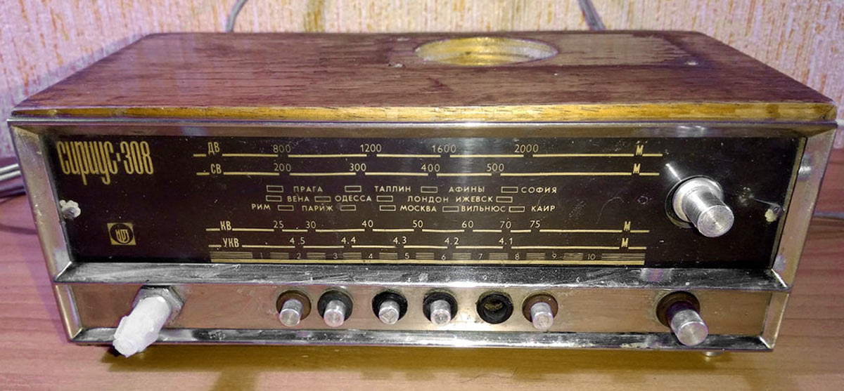Сувенирный радиоприёмник *Сириус-308* в 1971 году выпущен весьма ограниченной серией Ижевским радиозаводом. Радиоприёмник предназначался для награждения отличившихся чем либо работников Ижевского радиозавода. Основой для сувенира стала плата радиоприёмника *Вега* 1968 года выпуска. Радиоприёмник имеет как и базовая плата диапазоны ДВ и СВ. Не настаиваю, я лично не видел, но думаю что КВ и УКВ диапазоны - бутафорские, то есть обозначены на шкале, имеют пустые кнопки, но реально не работают, так как в приёмнике нет соответствующей элементной базы. Нет даже указателя настройки (стрелки). Питание от батареи типа *Крона*. Все технические параметры сувенира соответствуют радиоприёмнику *Вега*. Габариты модели - 200 х 115 х 75 мм. Масса около 1,5 кг.