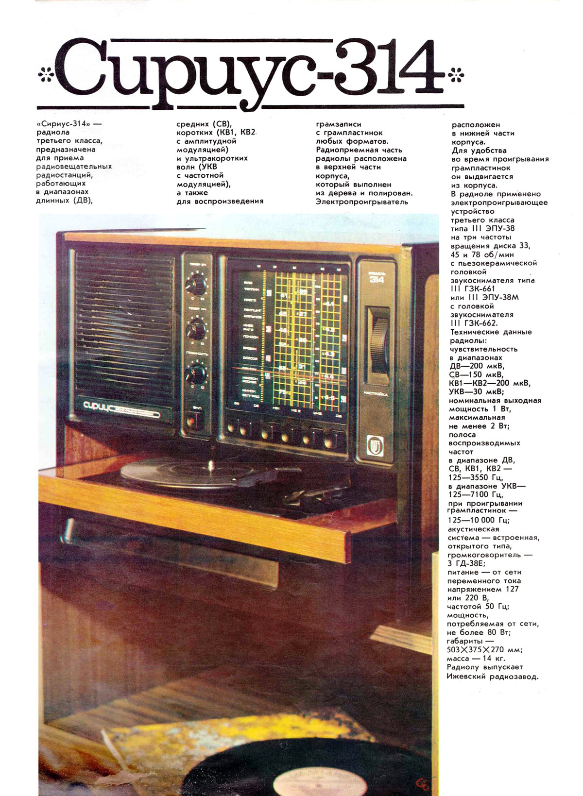 Стационарная транзисторная радиола *Сириус-З14* в 1977 году разработана и подготовлена к выпуску Ижевским радиозаводом. Радиола предназначена для приёма радиовещательных станций в диапазонах ДВ, СВ, КВ (обзорный) и УКВ, а так же для проигрывания грампластинок любых форматов двухскоростным выдвигающимся ЭПУ. В радиоле предусмотрено подключения магнитофона на запись, головных телефонов, внешнего УЗЧ. Чувствительность радиолы в АМ диапазонах 150 мкВ, ЧМ 30 мкВ. Диапазон воспроизводимых звуковых частот по звуковому давлению в АМ диапазонах 100...4000 Гц, в ЧМ и при проигрывании грампластинок 80...12500 Гц. Номинальная выходная мощность 4,5, максимальная 6 Вт. КНИ - 7%. Потребляемая от сети мощность 65...80 Вт. Габариты радиолы 500х880х390 мм. Масса 7,1 кг. Предполагаемая розничная цена 110 рублей. По каким-то причинам радиола в серийное производство не пошла. Основное фото.