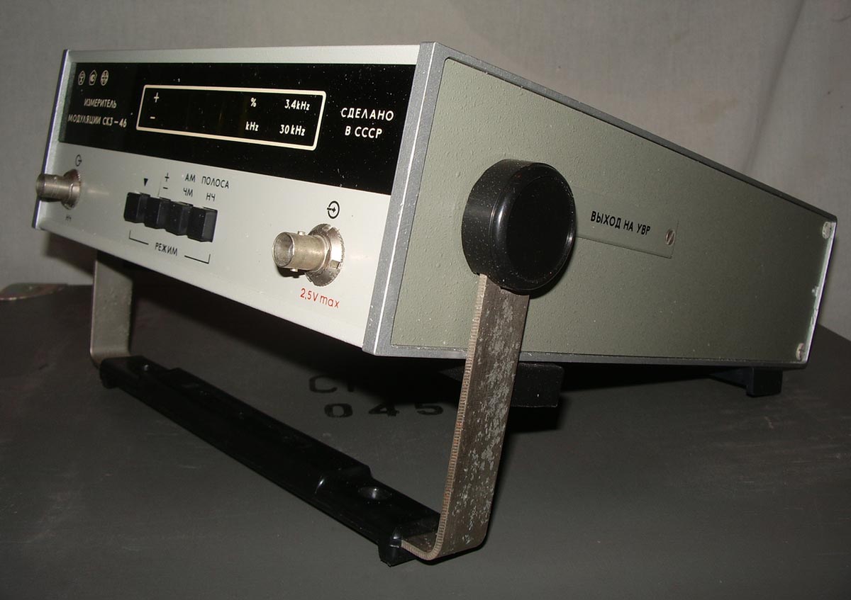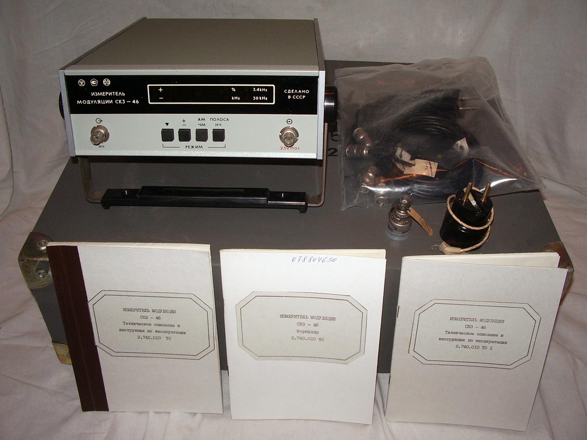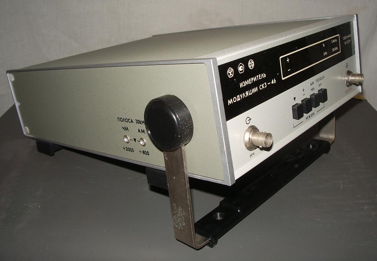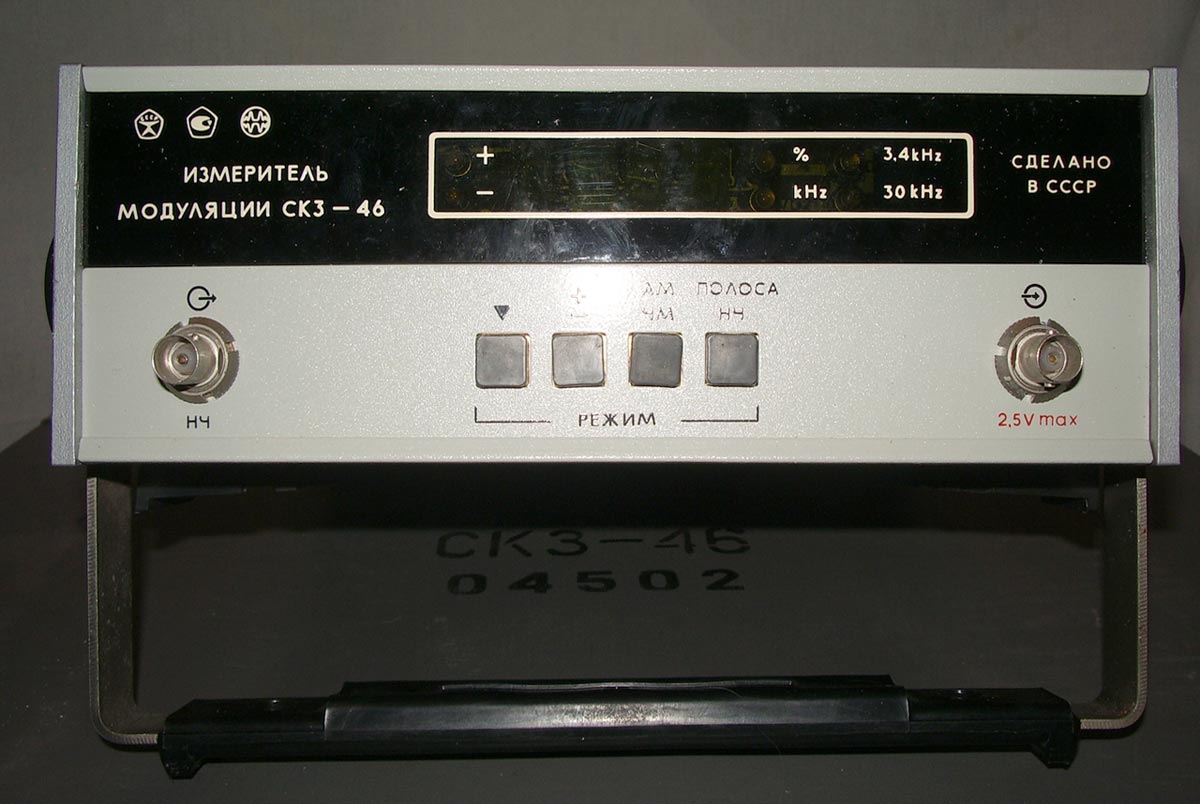 Измеритель модуляции *СК3-46* выпускался предположительно с 1987 года. Предназначен для измерения девиации частоты ЧМ сигналов и коэффициента АМ сигналов. Прибором может быть также измерен коэффициент АМ, сопутствующей ЧМ сигналу, и девиация частоты, сопутствующая АМ сигналу. Наличие выхода низкой частоты и малый уровень гармоник, вносимых в измеряемый сигнал, позволяет при помощи прибора измерять искажения закона модуляции АМ и ЧМ сигналов. Диапазон частот входного сигнала 10...1500 МГц. Габаритные размеры 260х93х375 мм. Масса 3,3 кг. Подробное описание прибора есть в интернете.