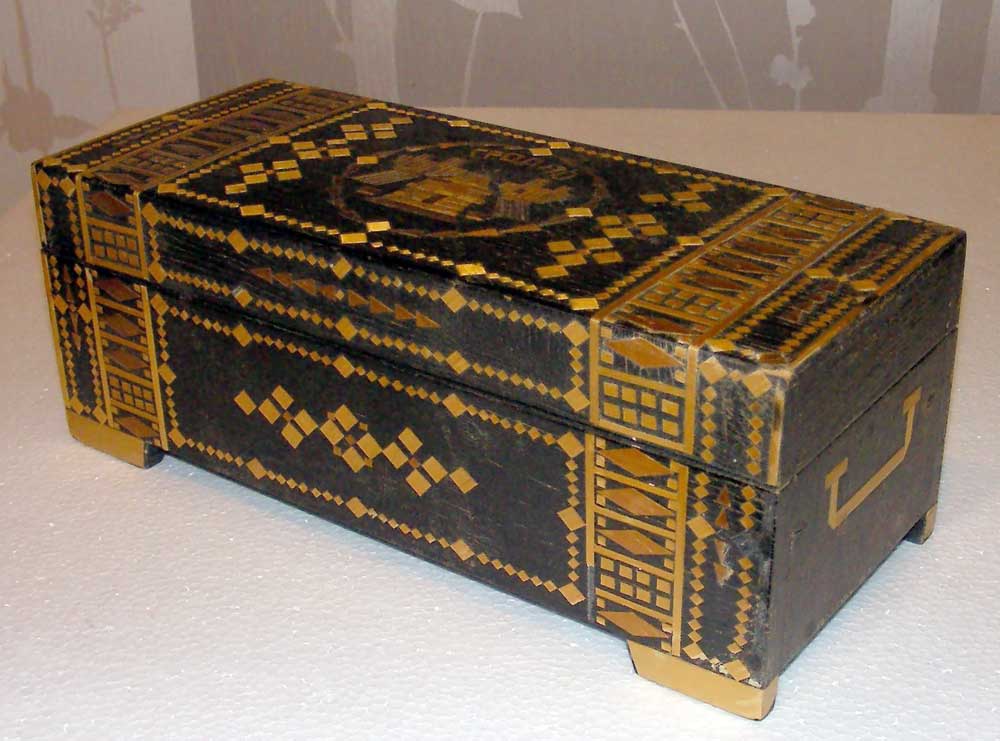 Стационарный транзисторный радиоприёмник *Шкатулка* с I-кв 1982 года выпускал Гродненский завод *Радиоприбор*. Сувенир **Шкатулка** с встроенным радиоприёмником прямого усиления работает в диапазоне ДВ и СВ. Приёмник позволяет беспоисково принимать три заранее настроенных радиостанции. Имеется таймер, работающий как часы и позволяющий в определённое время включать приёмник, используя его как будильник. Чувствительность в диапазоне ДВ - 5 мВ/м, СВ - 8 мВ/м. Селективность 15 дБ. Номинальная выходная мощность 180 мВт. Питание от 6-ти элементов типа А-316. Диапазон воспроизводимых частот 250...4000 Гц. Габариты сувенира 250х100х100 мм. Масса с батареями 900 гр. Шкатулка деревянная, фанерована, орнамент из соломки, лицевая панель из металла и пластика, часы - механические.