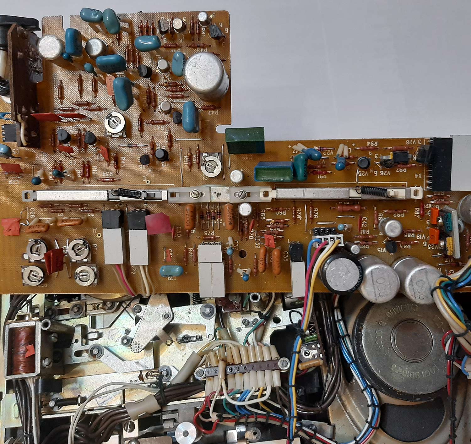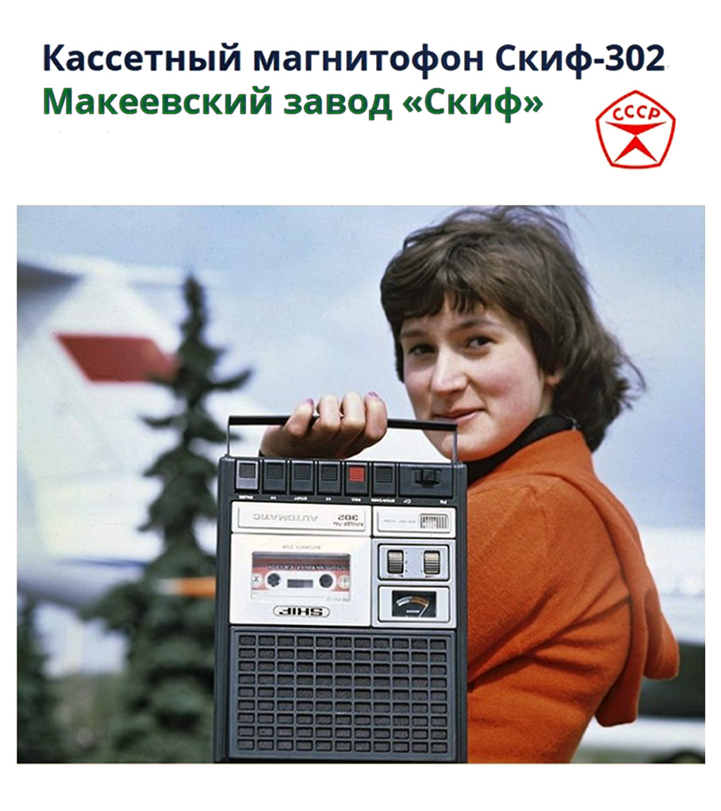 Кассетные магнитофоны *Скиф-301*, *Скиф-302* и *Скиф-303* в 1979 году подготовлены к выпуску Макеевским заводом *Скиф*. Магнитофоны предназначены для записи и воспроизведения фонограмм через внутреннюю и внешнюю АС. В моделях имеются регуляторы громкости и тембра, счетчик метража ленты, контроль питания по стрелочному индикатору. От других аппаратов такого же класса магнитофоны отличаются наличием АРУЗ, переключателя типа ленты, благодаря чему обеспечивается наилучший режим записи на лентах Fe, FeCr, Сr и автостопа, возвращающего ЛПМ в положение Стоп при остановке и обрыве ленты. Конструкция магнитофонов блочно-модульная. ЛПМ, блок усилителей, блок регуляторов и питания соединены разъёмами. ЛПМ магнитофонов выполнен по одномоторной кинематической схеме. В цепи передачи вращения от маховика к под-кассетным узлам при перемотке применена фрикционная муфта, благодаря чему используется инерция маховика для привода механизма автостопа. Магнитофон **Скиф-303** стереофонический аппарат. Его электрическая часть выполнена на интегральной микросхеме, 21 транзисторе, 2 диодных сборках и 7 диодах. Схема монофонических моделей выполнена на 1 микросхеме, 16 транзисторах, одной диодной сборке и 8 диодах. Особенность магнитофонов - полное отсутствие в схеме, за исключением блока питания моточных изделий. Все магнитофоны питаются от сети 127, 220 В или от 6 батарей А-343. Основные характеристики моделей: скорость протяжки магнитной ленты 4,76 см/с; коэффициент детонации ЛПМ - ±0,4%; рабочий диапазон звуковых частот на ЛВ - 60...10000 Гц; диапазон регулировки тембра НЧ и ВЧ - 8 дБ; номинальная выходная мощность при питании от сети 1,3 Вт; автономного источника 1 Вт. Габариты любого магнитофона - 204 х 258 х 75.Масса 2,7 кг. Магнитофоны серийно не выпускались, на другом, неустановленном заводе выпущена лишь опытная партия магнитофонов *Скиф-303*, но из-за огромной цены для 1979 года в 330 рублей магнитофон практически не покупался и его выпуск был прекращён.