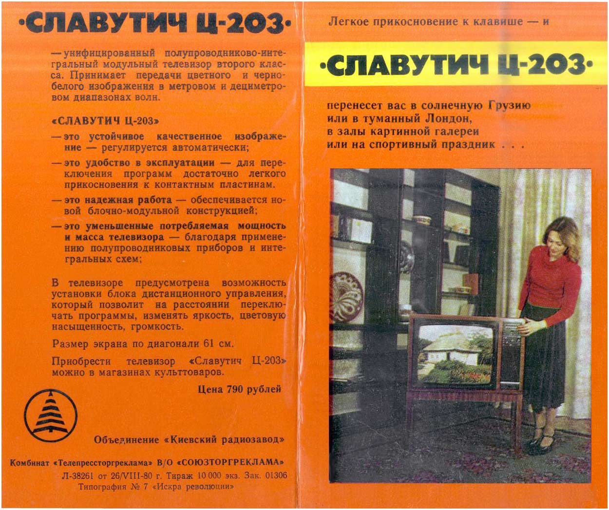 Цветной телевизионный приёмник *Славутич Ц-203* подготовлен к выпуску с 1981 года Киевским радиозаводом. Телевизор является практически полным аналогом модели *Славутич Ц-202*, выпуска 1980 года. Была попытка запустить модель и с 1982 года, но продолжился выпуск телевизора *Славутич Ц-202*.
