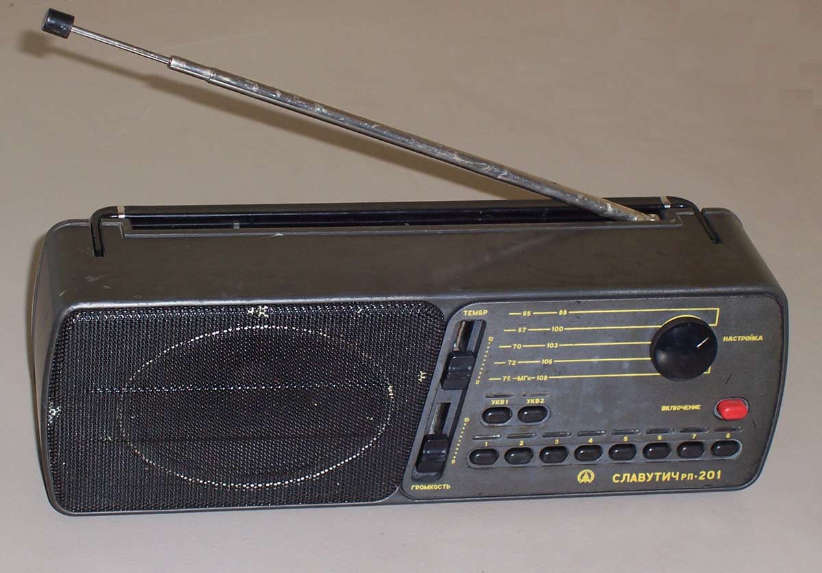 Портативный транзисторный радиоприёмник *Славутич РП-201* с I-кв 1991 года выпускал *Киевский радиозавод*. Радиоприёмник *Славутич РП-201* предназначен для прослушивания вещательных программ в двух диапазонах УКВ: УКВ-1 - 65...75 мгц и УКВ-2 88...108 мгц. Имеется восемь фиксированных настроек, а также плавная настройка на частоту радиовещательной станции в обоих диапазонах. Чувствительность, ограниченная шумами, при соотношении сигнал/шум 26 дБ по напряжению 5 мкВ. Диапазон частот, воспроизводимых АС 200...8000 Гц. Коэффициент гармоник менее 5%. Максимальная выходная мощность 1 Вт. Питание приёмника осуществляется от шести батарей типа А-343 или от электрической сети 220 вольт. Потребляемая от сети мощность не более 5 Вт.