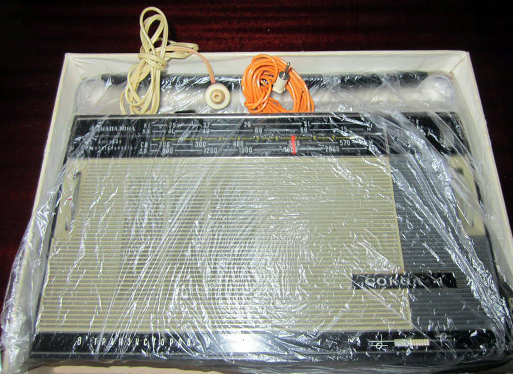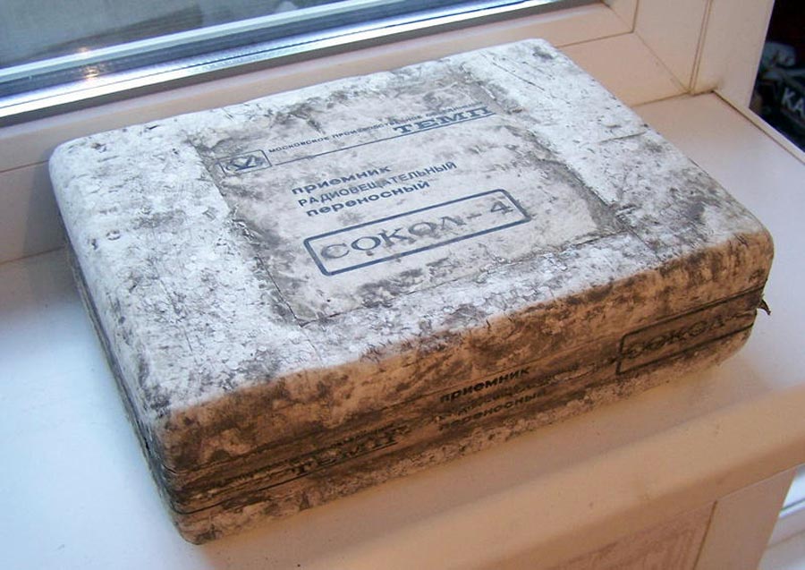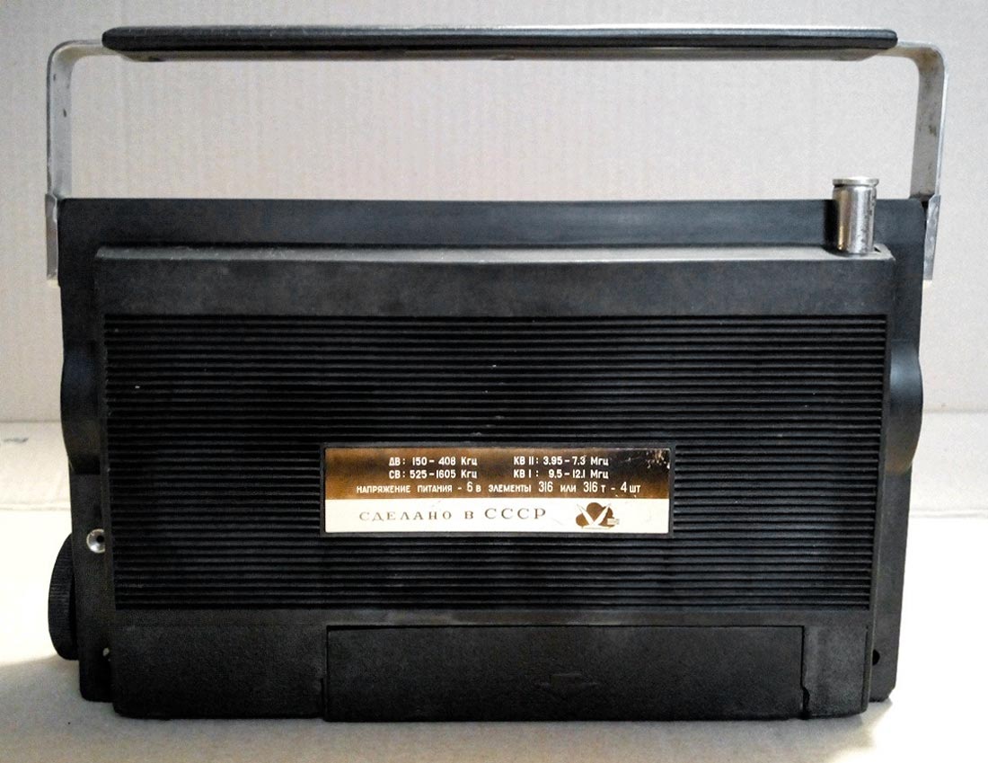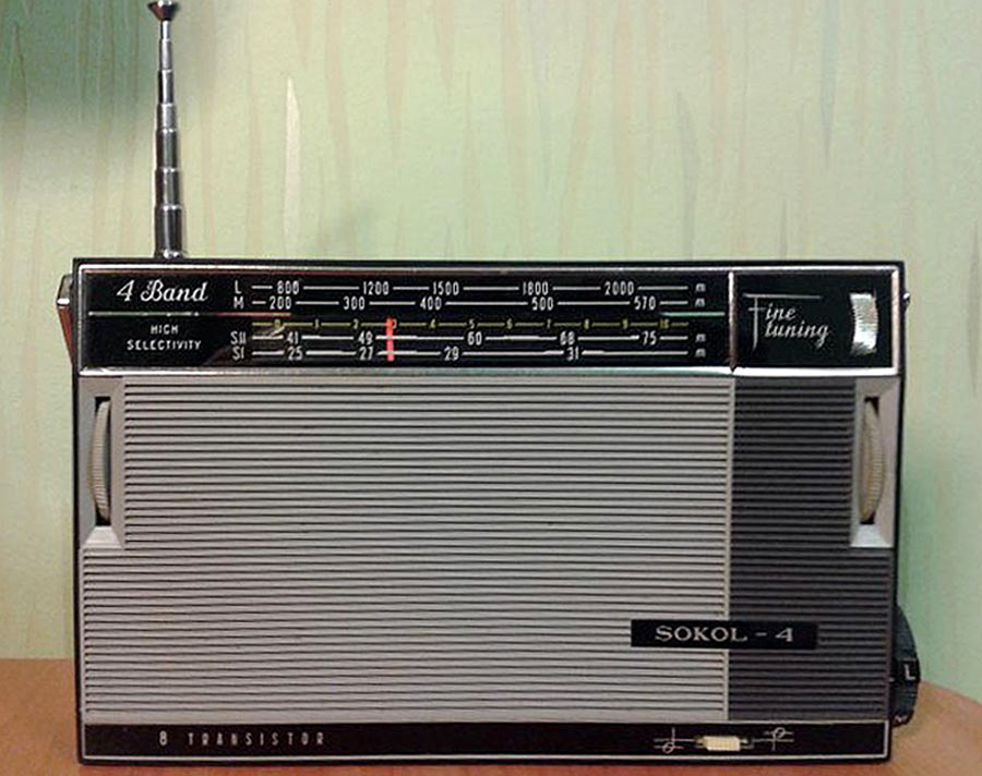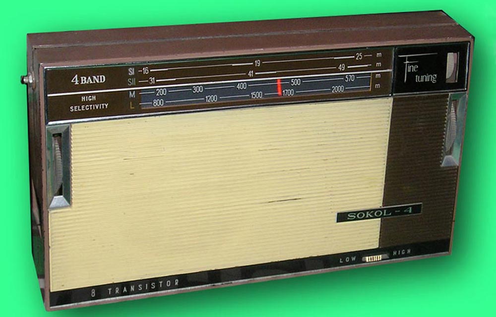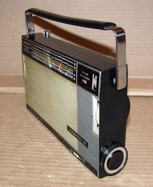 Транзисторный радиоприёмник *Сокол-4* с 1967 года выпускал Московский радиозавод. Приёмник представляет собой супергетеродин, собранный на восьми транзисторах и двух диодах. Он предназначен для приёма радиостанций в диапазонах ДВ, СВ и КВ. Приём в ДВ, СВ осуществляется на магнитную антенну, а в КВ на телескопическую. К приёмнику можно подключить головной телефон. Питание приёмника осуществляется от четырёх элементов А-316. Управление с помощью четырёх ручек; настройки, подстройки, переключателя диапазонов и регулятора громкости с выключателем питания. Диапазоны: ДВ - 735...2000, СВ - 186...570 и КВ - 25...75 метров. КВ диапазон разбит на два поддиапазона: KВ-1 - 25...31 м и КВ-2 - 41...75 м. Экспортные варианты имели как указанные, так и другие частоты КВ поддиапазонов. Чувствительность модели 1,8 мВ/м на ДВ, 0,8 мВ/м на СВ, 150 мкВ на КВ. Селективность 46 дБ. Номинальная выходная мощность 100 мВт. Ток покоя 10 мА. Габариты радиоприёмника 215 х 125 х 47 мм. Масса с элементами питания 950 грамм.