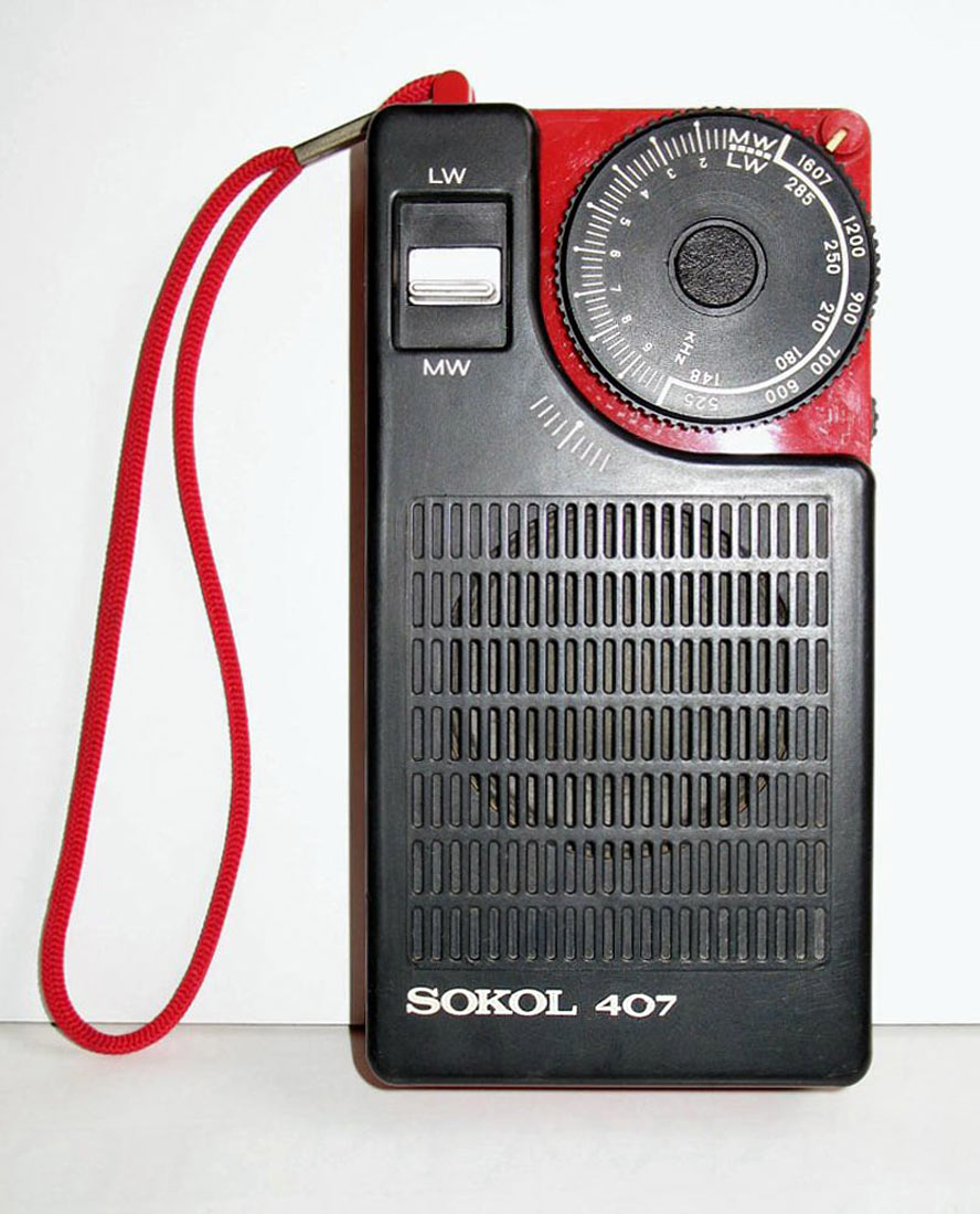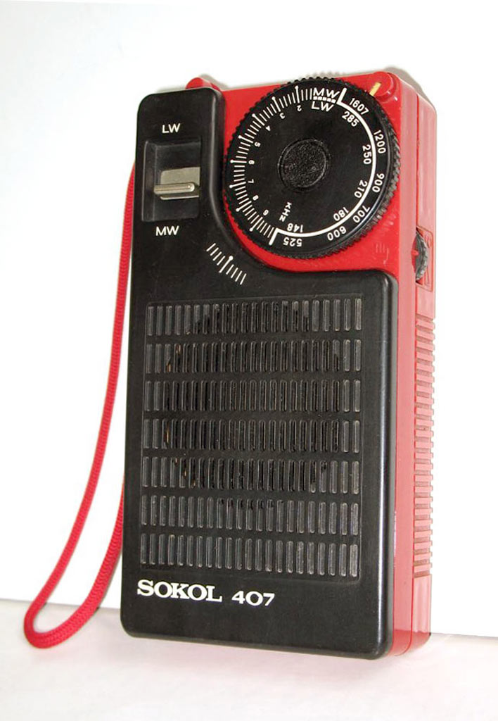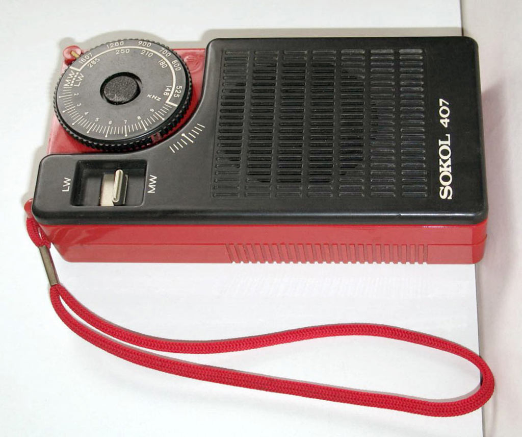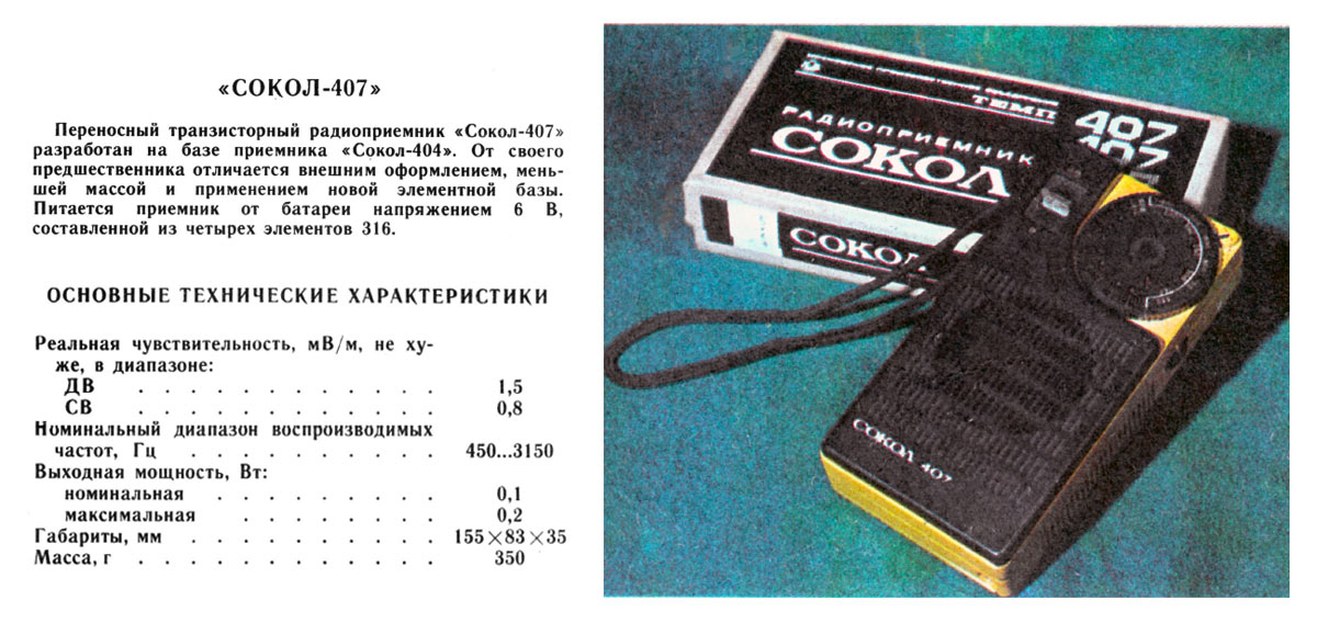 Портативный радиоприёмник *Сокол-407* с 1984 года выпускал Московский радиозавод. Радиоприёмник разработан на базе модели **Сокол-404** и отличается от него оформлением, меньшей массой, размерами и новой элементной базой. Питается приёмник 4-х элементов 316. Радиоприёмник работает в диапазонах длинных и средних волн. Приём осуществляется на магнитную антенну, но при необходимости можно подключить и внешнюю. Прямоугольная форма корпуса, круглая, хорошо читаемая шкала, удобная ручка для переноски придают приёмнику современный вид. Чувствительность в диапазонах ДВ - 1,5, СВ - 0,8 мВ/м. Диапазон частот звука 450...3150 Гц. Номинальная выходная мощность 0,1, максимальная 0,2 Вт. Габариты модели 155х83х35 мм. Вес 350 гр. Цена 31 рубль.