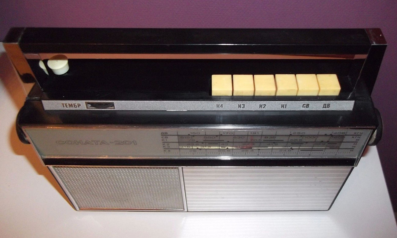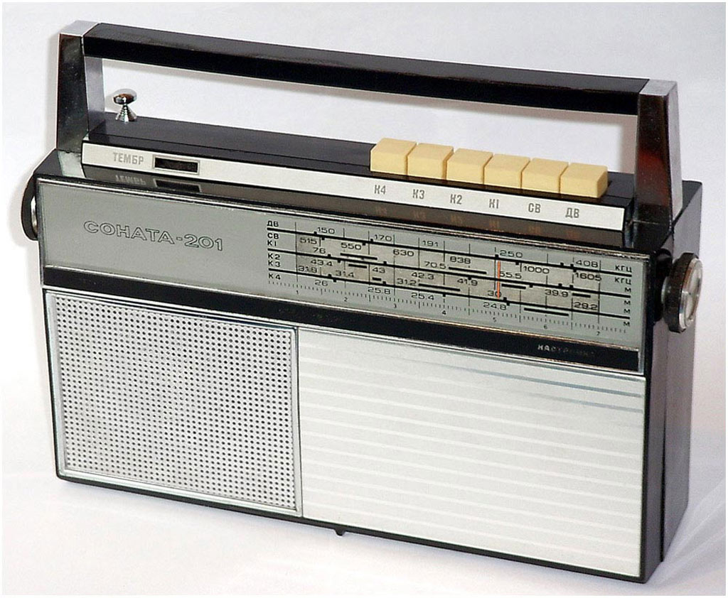Портативный радиоприёмник *Соната-201* с 1972 года выпускал Ленинградский завод *Радиоприбор*. Радиоприёмник 2-го класса **Соната-201** предназначен для приёма программ радиовещательных станций в диапазонах ДВ, СВ и четырёх поддиапазонах КВ. Он разработан на основе приёмника **Соната**. Изменения в электрической схеме направлены на увеличение выходной мощности до 0,5 Вт и удобству настройки на KB поддиапазонах. Для этого выходные триоды П41 заменены на ГТ402А, а галетный переключатель заменён новым кнопочным переключателем на шесть положений. Это нововведение позволило увеличить число KB поддиапазонов с двух до четырёх, а поддиапазоны 41, 31 и 25 метров сделать растянутыми. Кроме того в модели используется входная цепь отличающаяся помехозащищенностью и высокой чувствительностью. Изменился и внешний радиоприёмника, а также размещение его органов управления и шкалы. Питание осуществляется от 2-х батарей 3336Л. Размеры радиоприёмника - 198 х 270 х 78 мм. Масса 2 кг. Экспортный вариант радиоприёмника имел КВ поддиапазоны с 16 до 50 метров.