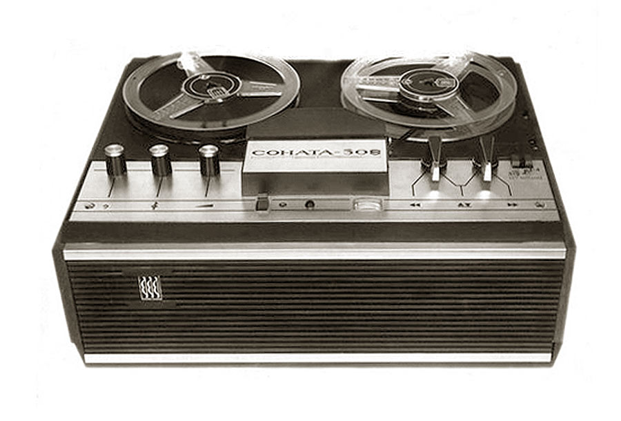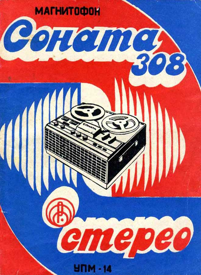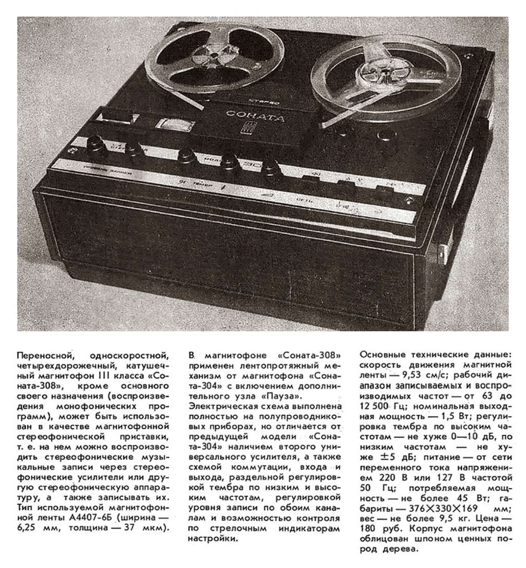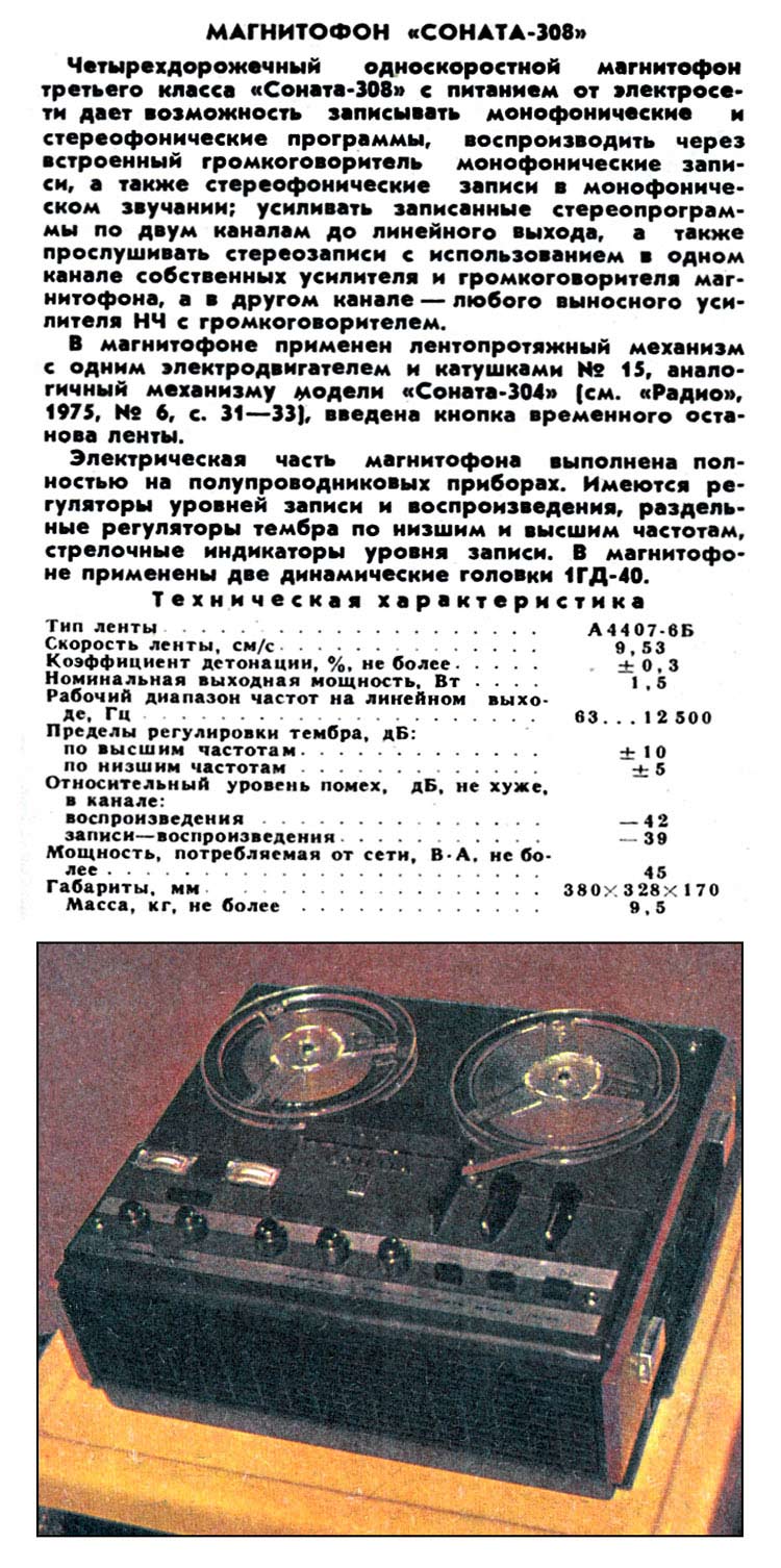 Катушечный магнитофон *Соната-308* с начала 1977 года выпускало Великолукское ПО *Радиоприбор*. Магнитофон **Соната-308** отличается от модели **Соната-304** тем, что новый магнитофон четырёхдорожечный и до линейного выхода стереофонический. Магнитофон планировали выпускать в оформлении старой модели (1-е фото). Аппарат предназначен для записи моно и стерео-фонограмм, моно записи можно слушать через встроенные громкоговорители или внешние АС, а стерео через стереотелефоны и подключаемый к ЛВ внешний стереоусилитель с АС. В магнитофоне имеются регуляторы тембров, два стрелочных индикатора уровня записи, впоследствии только один подключаемый поочерёдно к одному из каналов. Тип магнитной ленты А4407-6Б, А4409-6Б, А4309-6Б. Скорость ленты 9,53 см/с. Время записи на катушках №15 4х65 минут. Коэффициент детонации ±0,3 %. Диапазон рабочих частот 63...12500 Гц. Номинальная выходная мощность 1 Вт. Диапазон регулировки тембра по ВЧ ±10 дБ, по НЧ ±5 дБ. Уровень помех в канале З/В -42 и -45 дБ. Потребляемая мощность 45 Вт. Габариты МГ - 380х328х170 мм. Вес 9,5 кг.