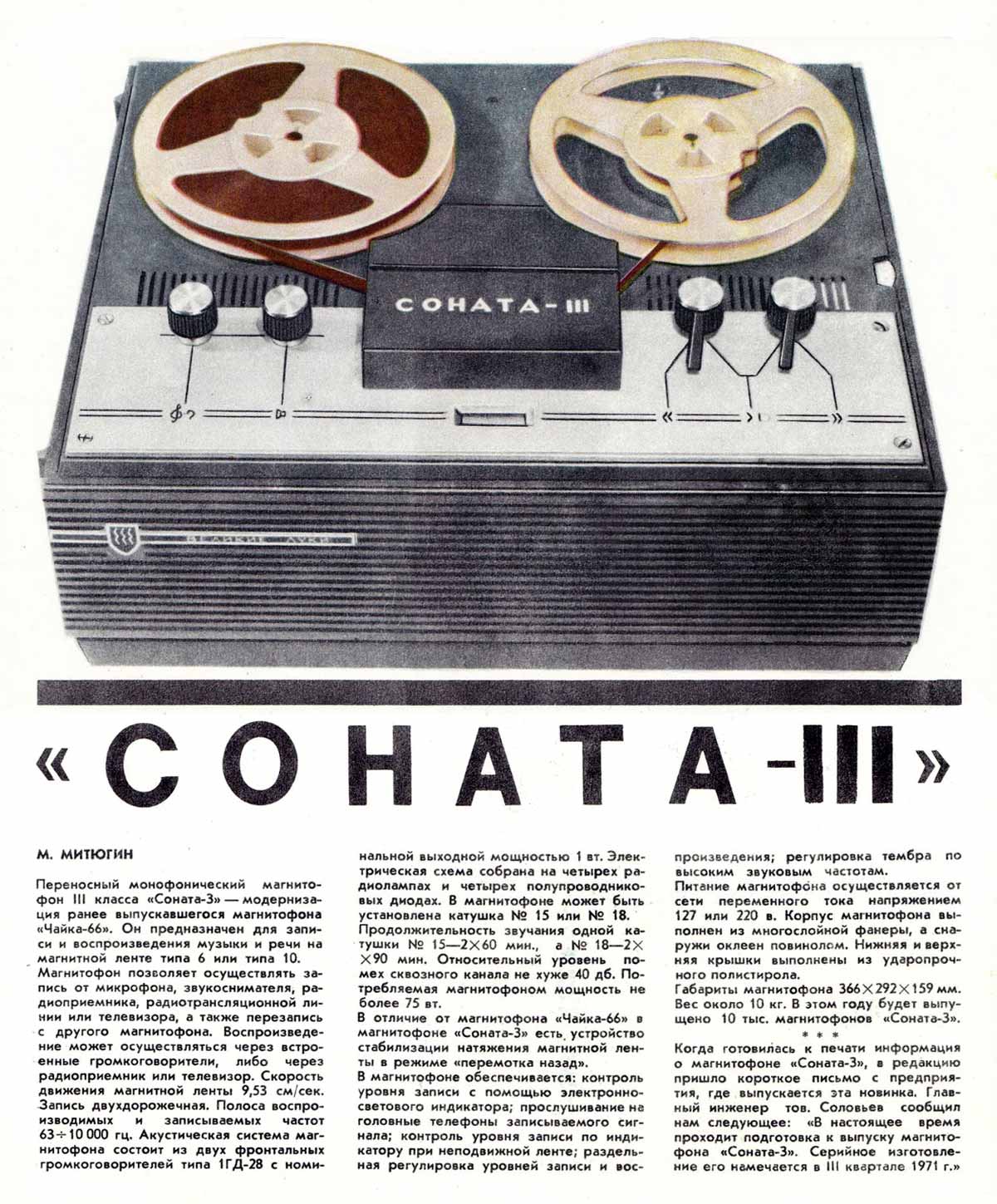 Катушечный магнитофон *Соната-III* с 1971 года выпускал Великолукский радиозавод. Ламповый магнитофон 3-го класса **Соната-III** разработан на основе ЛПМ магнитофона **Чайка-66**. Магнитофон рассчитан на двухдорожечную запись от любых источников звукового сигнала. Скорость магнитной ленты 9,53 см/сек. Коэффициент детонации 0,3%. Запись производится на магнитную ленту типа 6 или 10. Длительность записи при использовании катушек на 375 м. магнитной ленты 65х2 мин. Частота генератора стирания и подмагничивания 60 кГц. Выходная мощность усилителя низкой частоты 1 Вт, при КНИ не более 5%. Напряжение на линейном выходе 0,25...0,5 В. Диапазон частот на линейном выходе 63...10000 Гц. Имеется регулировка тембра по высоким частотам. Питание осуществляется от сети переменного тока 127 или 220 В. Потребляемая мощность 75 Вт. Размеры магнитофона 379х303х164 мм. Масса 9,5 кг.