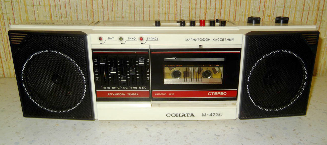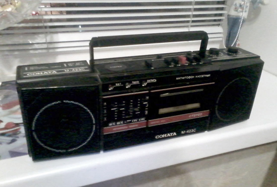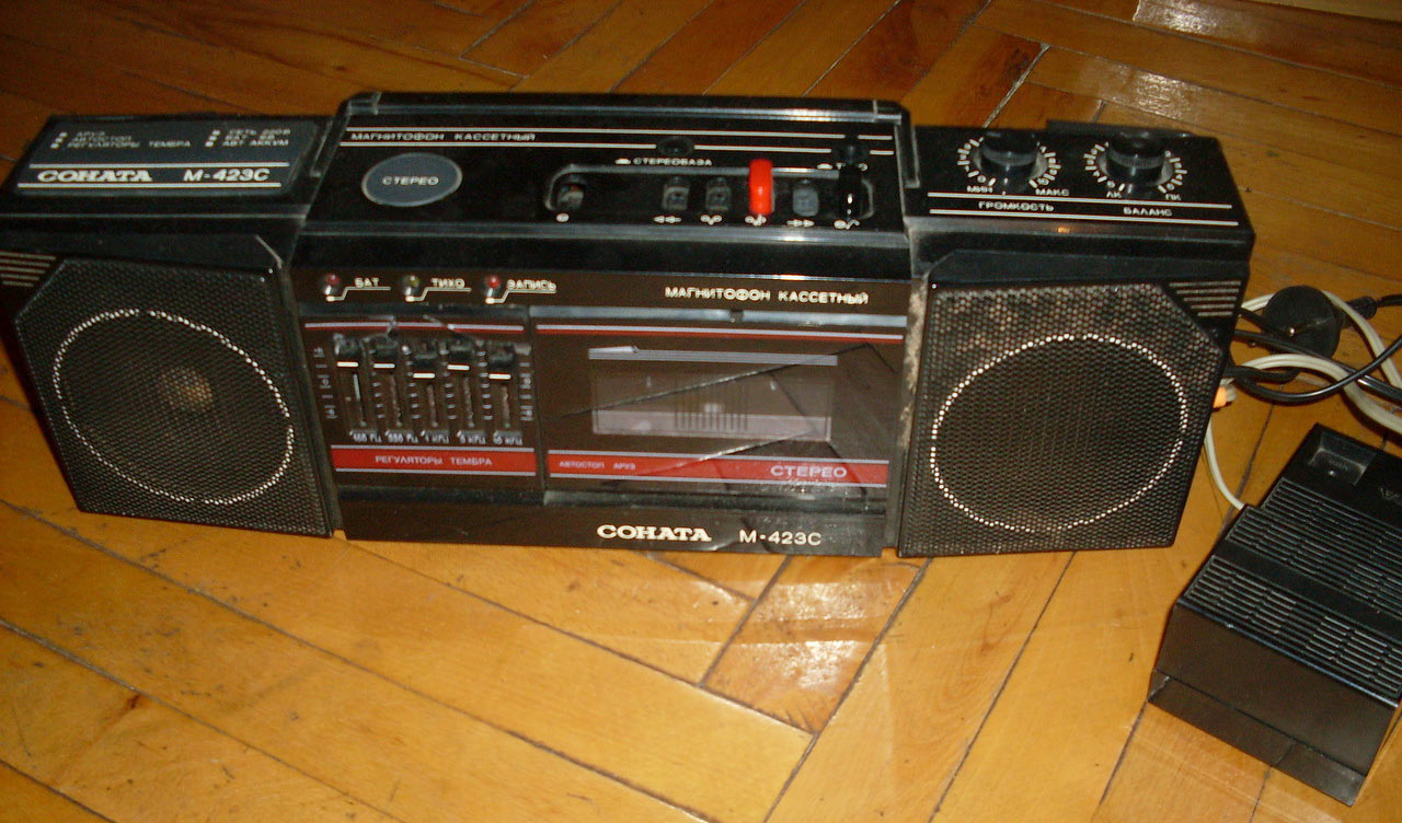 Стереофонический магнитофон *Соната М-423С* с начала 1987 года выпускало Великолукское ПО *Радиоприбор*. Портативный кассетный магнитофон *Соната М-423С* предназначен для записи фонограмм с двух встроенных электретных микрофонов в режиме стерео или внешних источников моно или стереофонического сигнала. Встроенный 5-полосный графический эквалайзер позволяет установить наилучшее качество воспроизведения. Номинальная выходная мощность 2х0,5 Вт, максимальная 2х1,8 Вт. Диапазон рабочих частот на ЛВ - 63...10000 Гц. Габариты магнитофона - 530х180х150 мм. Масса 5 кг.