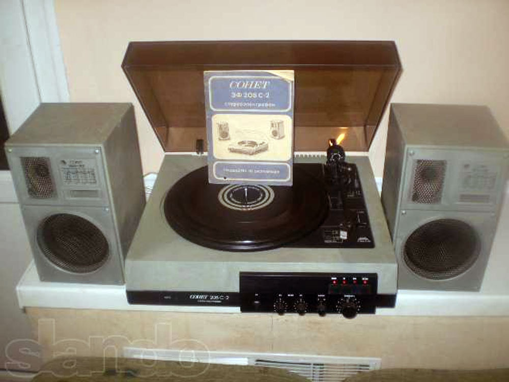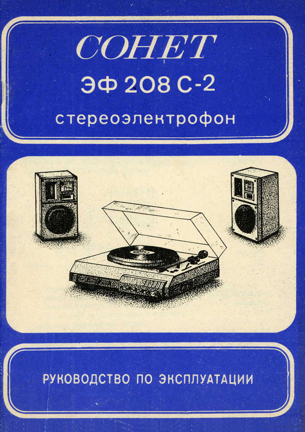 Электрофон сетевой транзисторный *Сонет-208-стерео* с осени 1986 года выпускал Казанский электротехнический завод. Стереофонический электрофон **Сонет-208-стерео** состоит из электропроигрывателя с усилителем звуковой частоты и 2-х малогабаритных акустических систем. В модели установлено ЭПУ типа 2-ЭПУ-71С с тихоходным двигателем и магнитной головкой с алмазной иглой бельгийской фирмы Ортофон. В ЭПУ имеется автостоп, устройство для подстройки частоты вращения диска. Электрофон может использоваться и как УЗЧ, к его входам могут быть подключены источники звуковых сигналов, имеется гнездо стереотелефонов. В УЗЧ аппарата имеется защита от КЗ в нагрузке, АС имеют встроенные индикаторы перегрузки. Скорости вращения диска 33, 45 об/мин. Коэффициент детонации 0,1%. Номинальный диапазон рабочих частот по напряжению 20...25000 Гц, звуковому давлению 63..16000 Гц. КНИ 0,5%. Переходные затухания между каналами 45 дБ. Габариты модели - 400х365х155 мм. АС - 265х175х160 мм. Масса 6,5 и 3,3 кг. Цена с АС 220 рублей. С 1988 года выпускался электрофон *Сонет ЭФ-208С*. В 1990 году электрофон был модернизирован и выпускался с наименованием *Сонет ЭФ-208С-2*. Основные отличия этой модели от 208 - это другое оформление, электронное переключения режимов входов и режима моно/стерео, отсутствие кнопки отключения АС. АС автоматически отключалась при подключении головных телефонов. Усилитель мощности собран на транзисторах или на 2-х микросхемах типа TDA-2030.