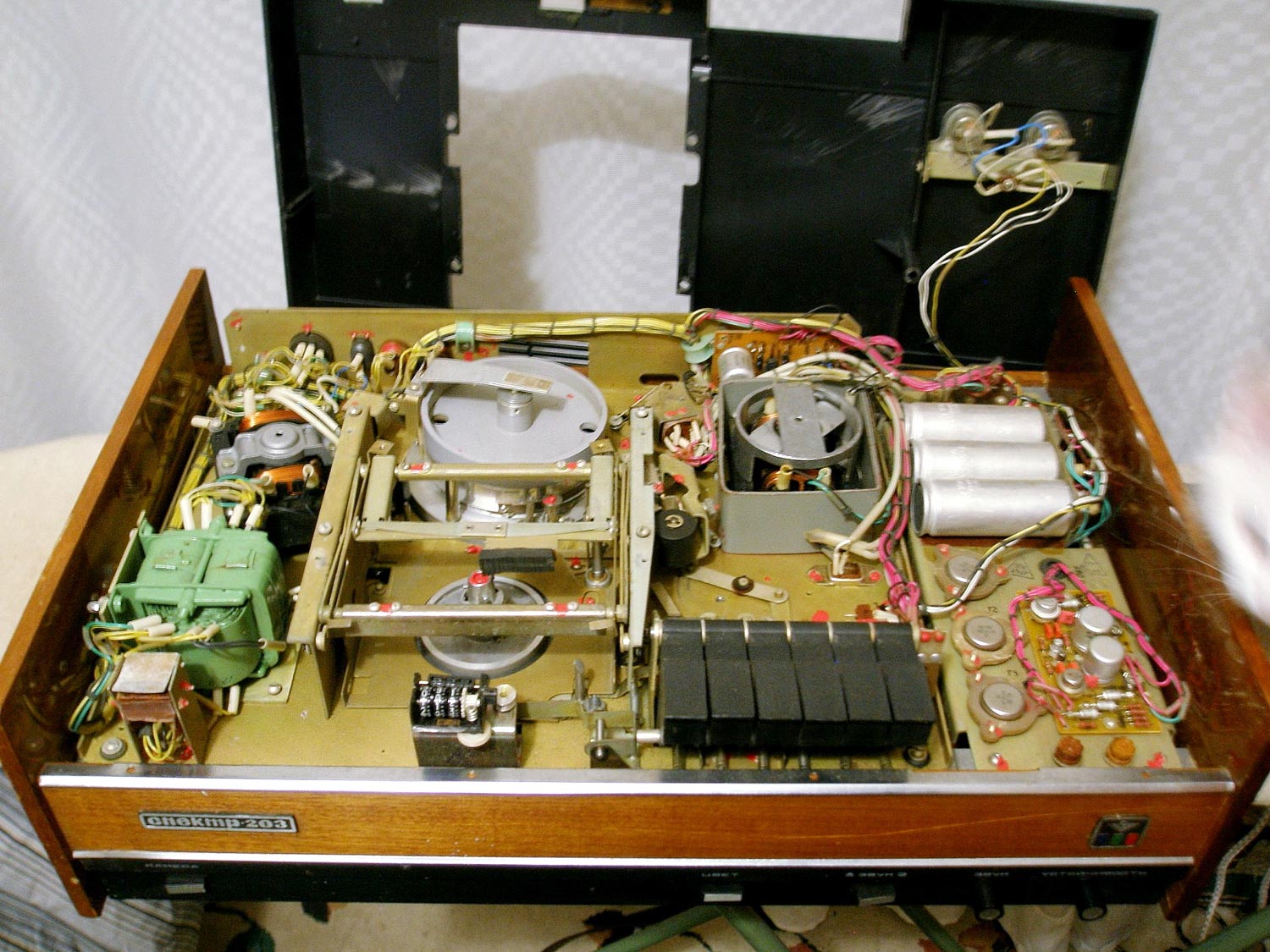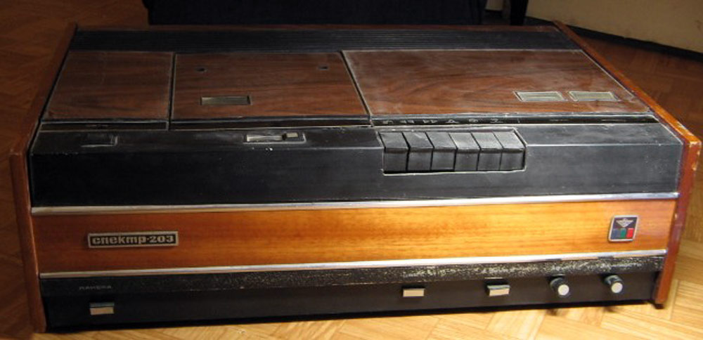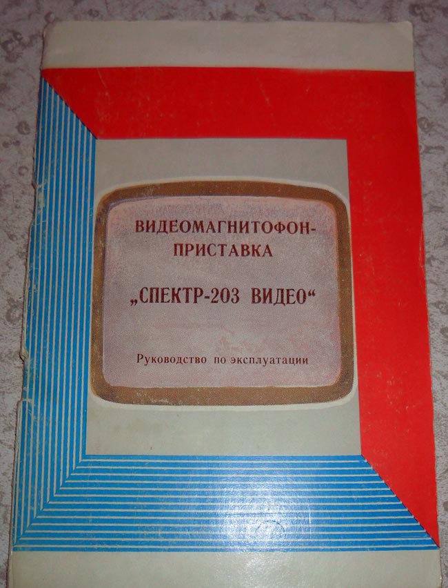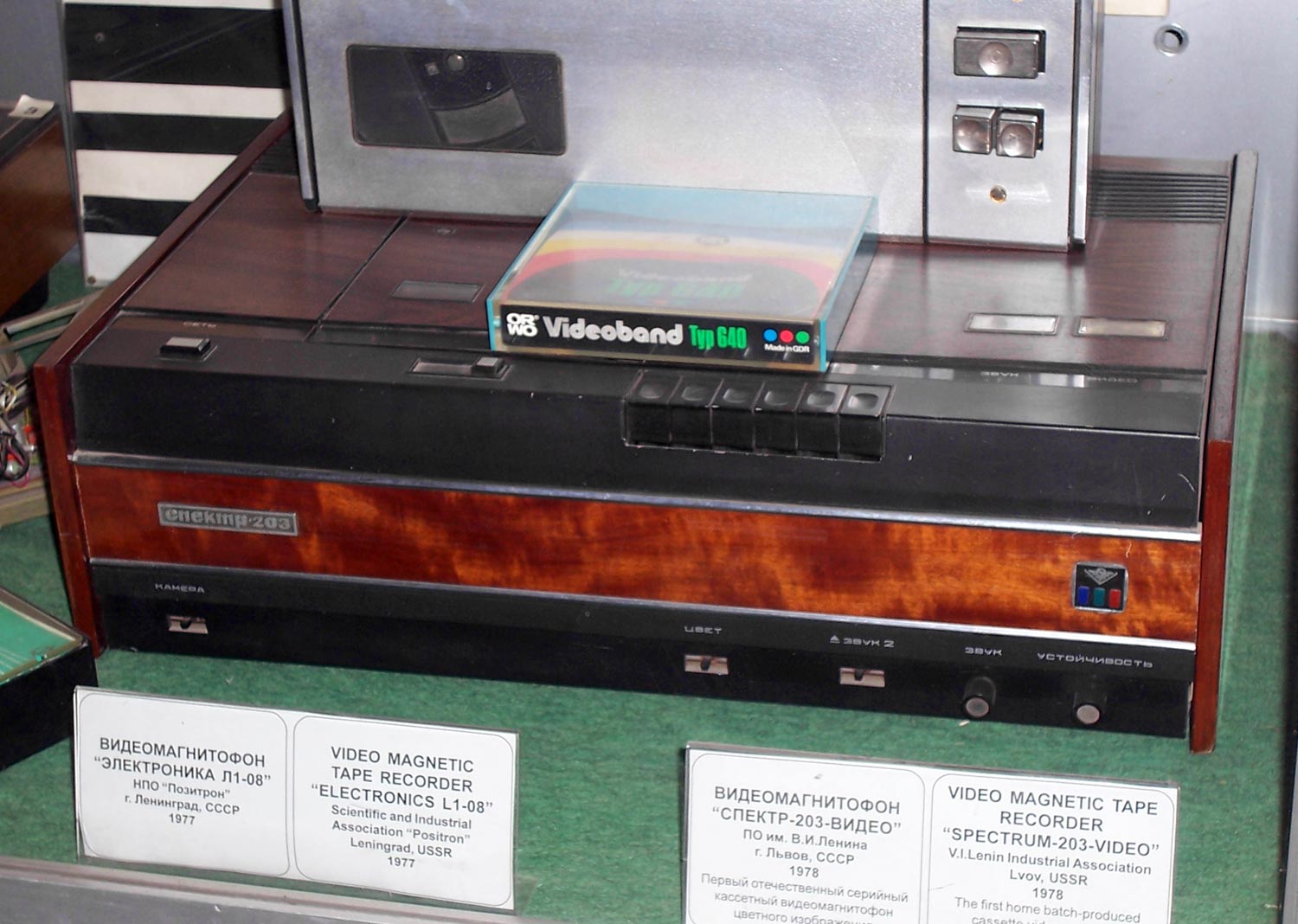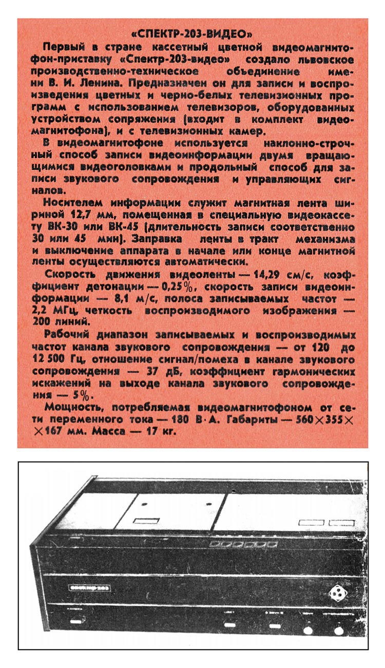 Кассетный цветной видеомагнитофон-приставка *Спектр-203* с 1977 года выпускался Львовским ПТО имени В.И. Ленина. Первый в стране кассетный цветной видеомагнитофон-приставка **Спектр-203-видео** разработан ещё в 1974 году, однако его серийное производство началось лишь в 1977 году. ВМ предназначен для записи и воспроизведения цветных и ч/б телевизионных программ, с использованием телевизоров оборудованных устройством сопряжения, входящим в комплект и с телекамер. В ВМ используется наклонно-строчный способ записи видеоинформации 2-мя вращающимися видеоголовками и продольный способ для записи звукового сопровождения и управляющих сигналов. Носителем информации служит магнитная лента шириной 12,7 мм, помещенная в специальную кассету ВК-30 или ВК-45, время записи на которых соответственно 30 и 45 минут. Заправка ленты в тракт ЛПМ, включение и выключение ВМ в начале и конце магнитной ленты автоматическое. Скорость движения магнитной ленты 14,29 см/с. Коэффициент детонации ЛПМ - 0,25%. Скорость записи видеоинформации 8,1 м/сек. Полоса записываемых видеочастот - 2,2 МГц. Чёткость изображения 200 линий. Диапазон частот канала звука - 120...12500 Гц. Отношение сигнал/помеха в канале звука - 37 дБ. Коэффициент искажений канала звука - 5%. Потребляемая от сети мощность 180 Вт. Габариты ВМ - 560х355х167 мм. Вес 17 кг.