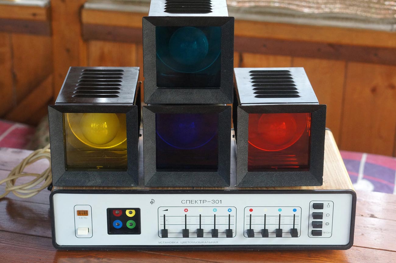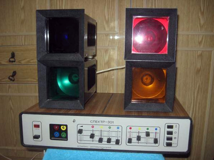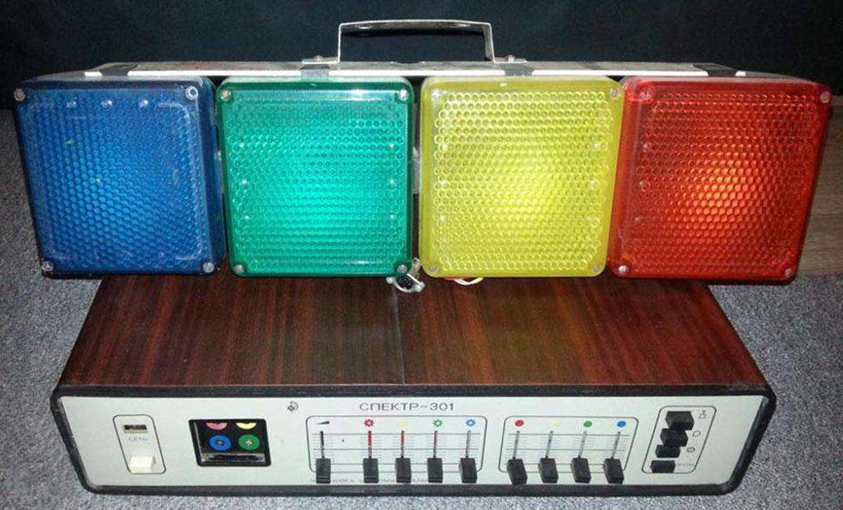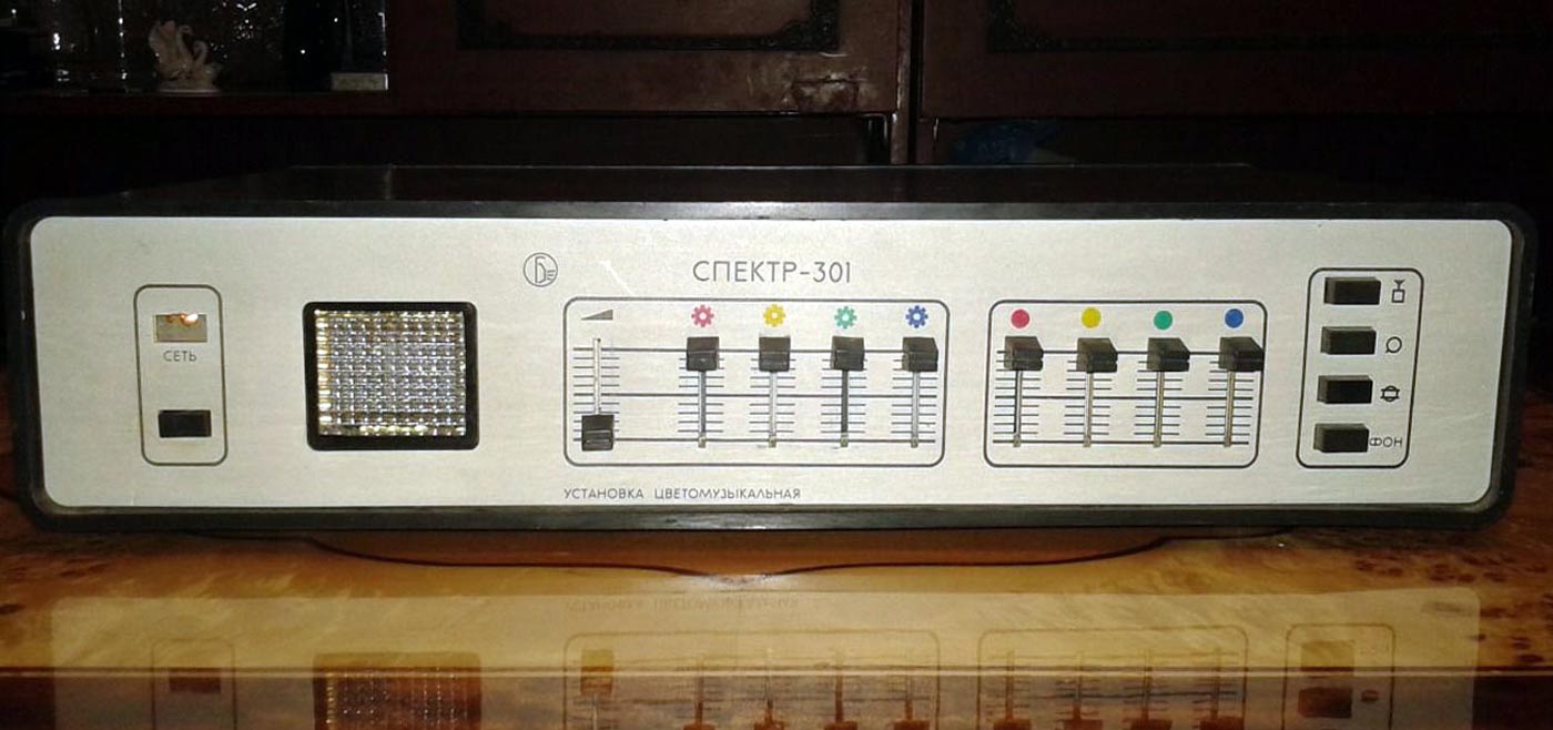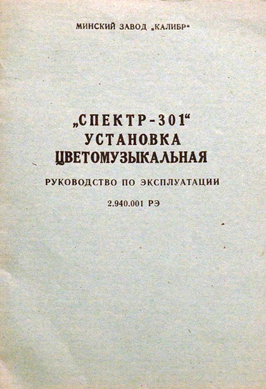 Установка цветомузыкальная *Спектр-301* выпускалась с 1987 года Минским заводом *Калибр*. Установка выпускалась в 2-х вариантах по типам фонарей и рассчитана на совместную работу с магнитофоном, электрофоном, р-приёмником, трансляционной линией и электромузыкальными инструментами. Количество цветовых каналов - 4. Границы диапазонов частот цветовых каналов, красного нижняя 20, верхняя 350 Гц, жёлтого нижняя 150, верхняя 1400 Гц, зелёного нижняя 500, верхняя 2000 Гц, синего нижняя 1200, верхняя, 20000 Гц. Чувствительность входа приёмника 10, электрофона 150, трансляционной линии 10000 мВ. Время непрерывной работы 8 часов. Напряжение питания 220 В. Потребляемая мощность с экраном 500, с прожекторами 450 В/А. Мощность прожекторов по каждому цветовому каналу 100 В/А.
