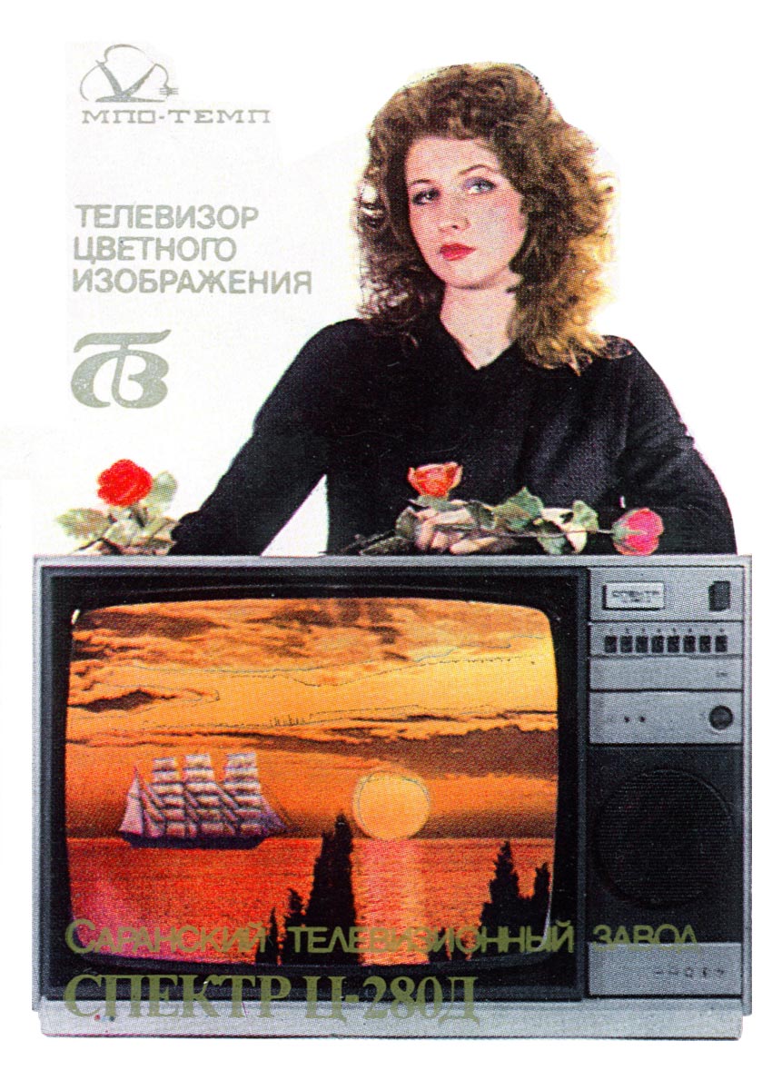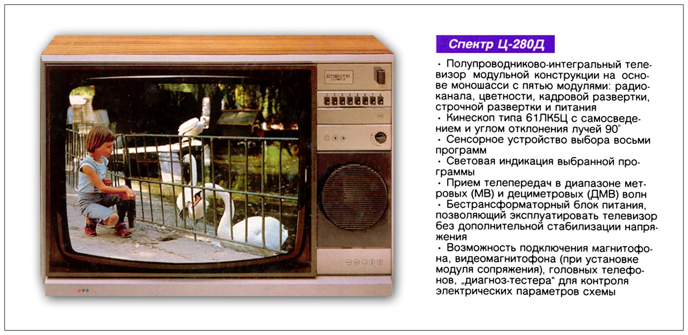 Цветной телевизор *Спектр Ц-280Д* с 1985 года выпускал Саранский телевизионный завод. Цветной унифицированный полупроводниково-интегральный модульный стационарный телевизор **Спектр Ц-280Д** предназначен для приёма программ в МВ и ДМВ диапазоне. В модели имеется ряд автоматических регулировок, обеспечивающих качественное изображение. Выбор любой из восьми программ осуществляется сенсорным переключателем. Применён импульсный источник питания и новая элементная база, позволившие уменьшить габариты, массу и потребляемую мощность. Установлен цветной масочный кинескоп 61ЛК5Ц с углом отклонения лучей 90° с самосведением, сенсорный переключатель программ, селекторы каналов МВ и ДМВ диапазона, световая индикация включенного канала. Предусмотрено подключения магнитофона для записи звукового сопровождения, видеомагнитофона (при установке модуля сопряжения), прослушивания звука на головные телефоны, подключения «диагноз-тестера» для контроля неисправности модулей. Размер изображения на экране - 362х482 мм. Чувствительность в диапазонах МВ - 55, ДМВ - 90 мкВ. Диапазон воспроизводимых частот 80...12500 Гц. Номинальная выходная мощность 2,5 Вт. Потребляемая мощность 80 Вт. Габариты телевизора - 500х745х550 мм. Масса - 32 кг. Цена 755 рублей. Телевизор *Спектр Ц-280Д*, кроме наименования полный аналог телевизора *ТЕМП Ц-280/Д* Московского ПО *Темп*, в том числе и по своему внешнему оформлению за исключением того что он работает в МВ и ДМВ диапазоне, тогда как *Темп Ц-280/Д* выпускался с МВ или с МВ и ДМВ диапазонами.