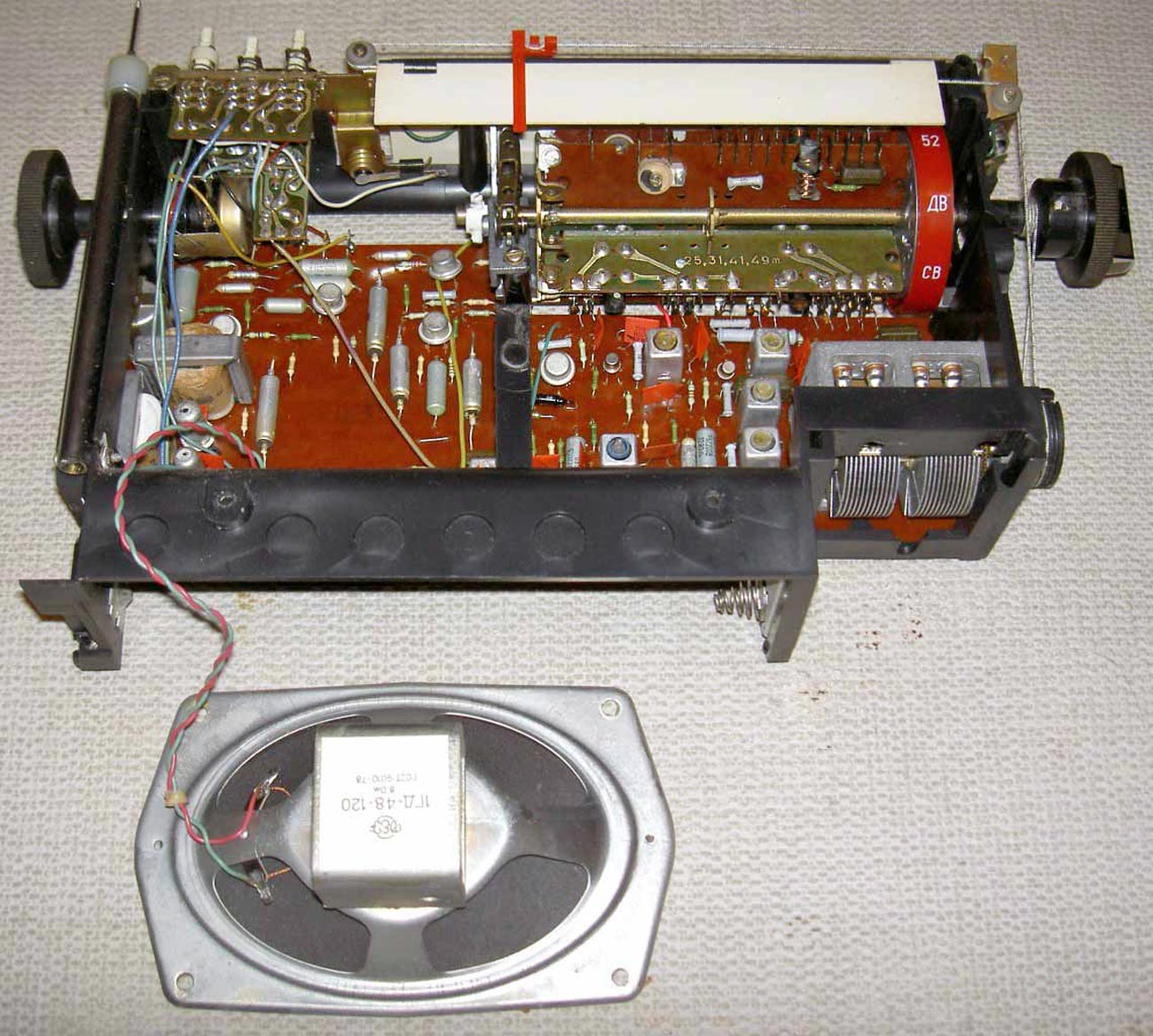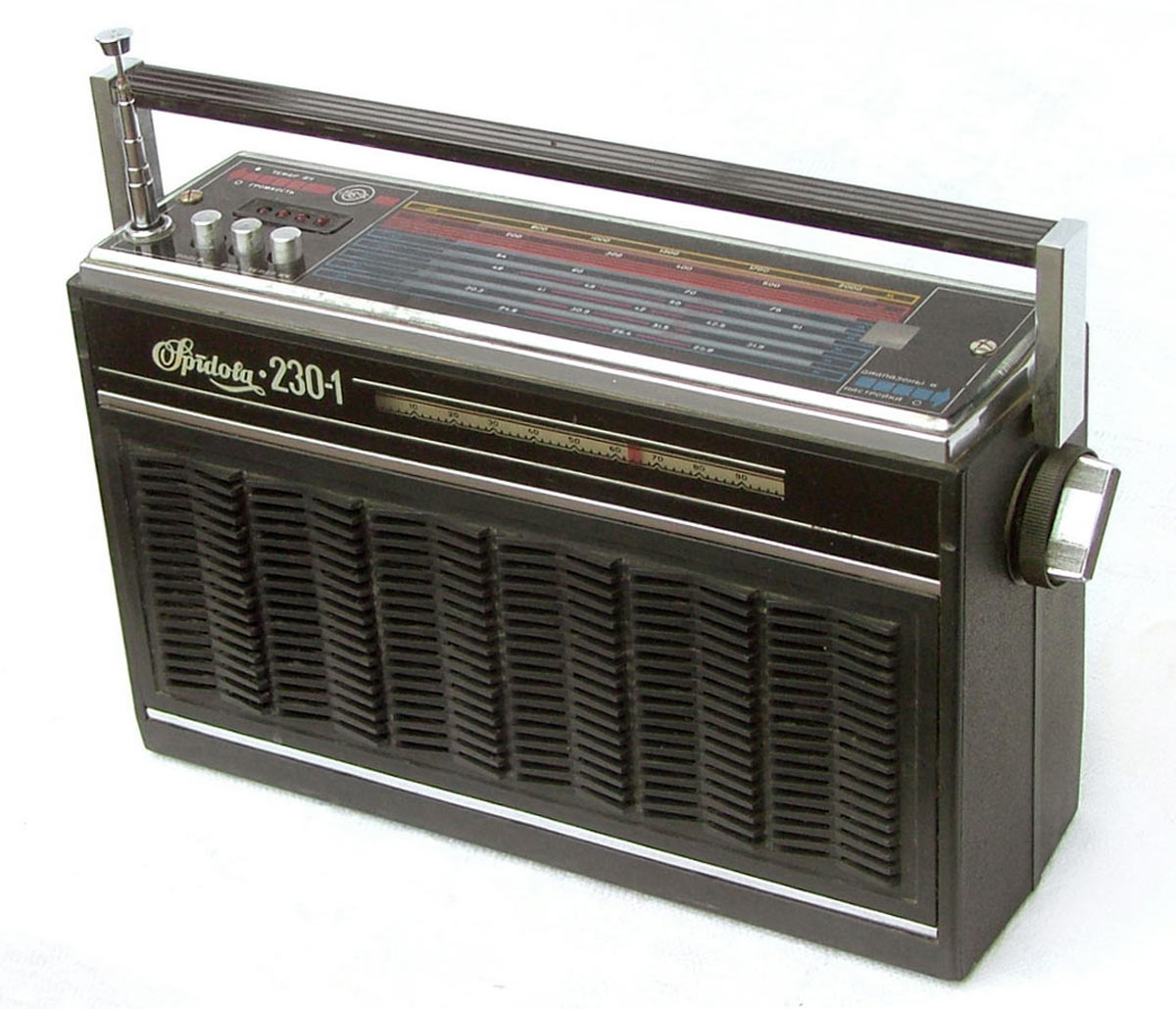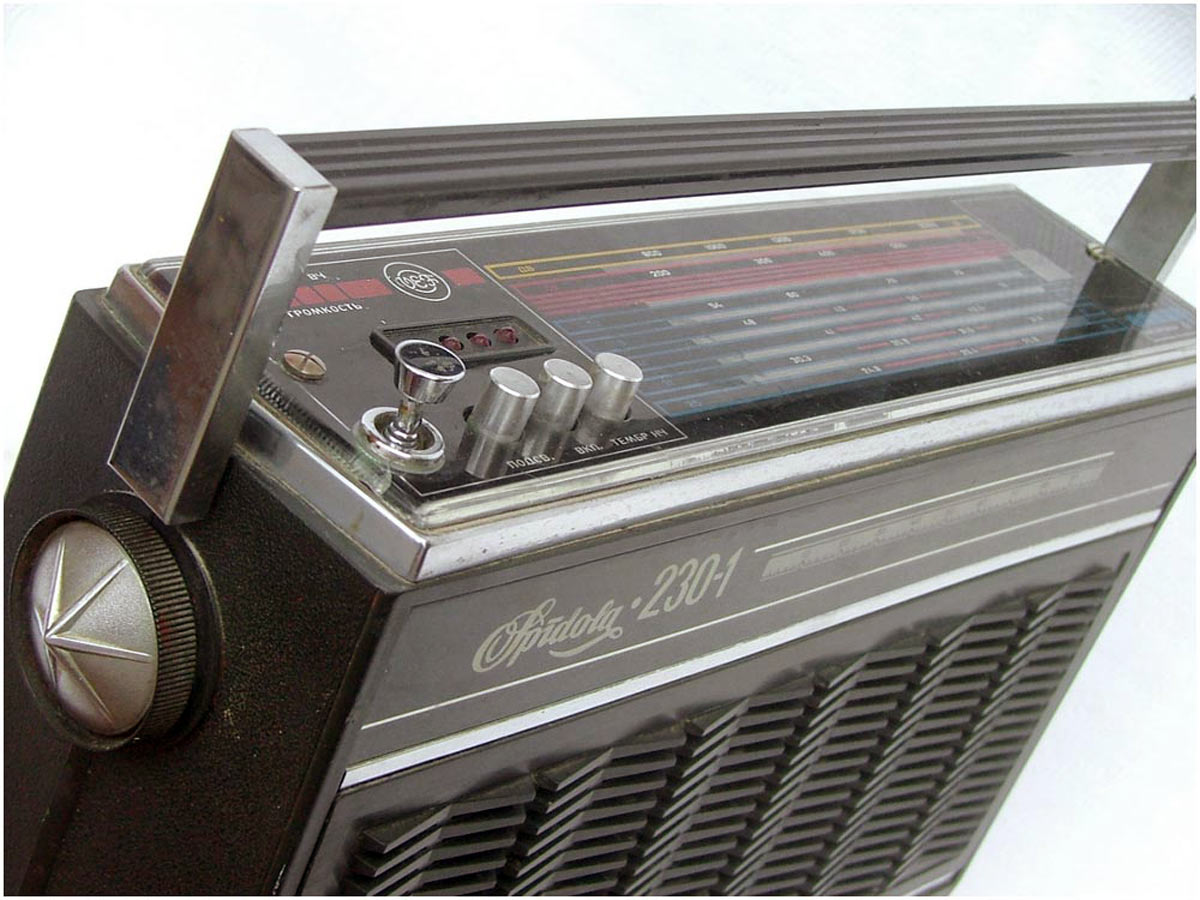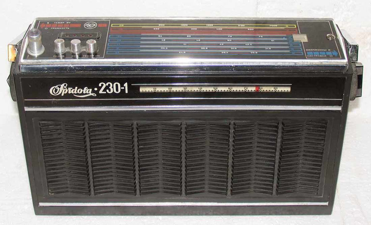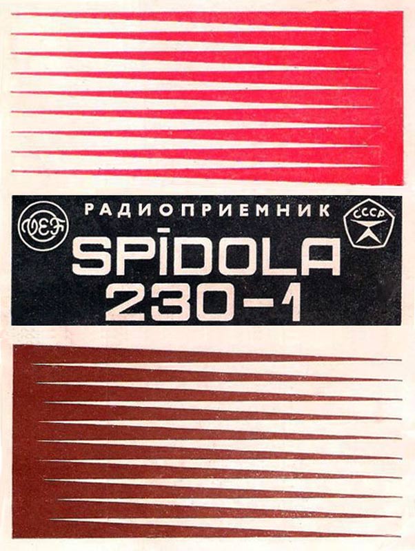 Переносные радиоприёмники *Спидола-230* и *Спидола-230-1* с 1973 и 1975 года выпускал Рижский радиозавод *ВЭФ*. Радиоприёмники 2 класса **Спидола-230** и **Спидола-230-1** предназначены для приёма в диапазонах ДВ, СВ и 5-ти поддиапазонах КВ. Модели имеют встроенную магнитную антенну, а в диапазоне КВ штыревую телескопическую, плавную регулировку тембра ВЧ и ступенчатую на два положения НЧ, индикатор настройки, подсветку шкалы, гнёзда для внешней антенны и заземления, магнитофона на запись, головного телефона, громкоговорителя и внешнего питания. Выпускаемый с 1975 года приёмник **Спидола-230-1** кроме наименования не отличается от модели **Спидола-230**. Чувствительность с магнитной антенной в диапазонах ДВ - 1,5, СВ - 0,8 мВ/м, со штыревой в поддиапазонах KB - 200 мкВ. С внешней антенной в ДВ - 300, СВ и KB не менее 200 мкВ. Избирательность в диапазонах ДВ, СВ - 34 дБ. ПЧ - 465 кГц. Действие АРУ: при изменении сигнала на входе на 30 дБ изменение напряжения на выходе 10 дБ. Полоса воспроизводимых частот - 125...4000 Гц. Номинальная выходная мощность 0,4 Вт, максимальная 0.8 Вт. Питание от шести элементов типа А-373. Габариты радиоприёмника - 365 х 250 х 100 мм. Масса без источников питания - 3,2 кг.