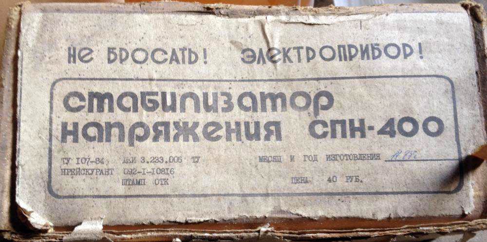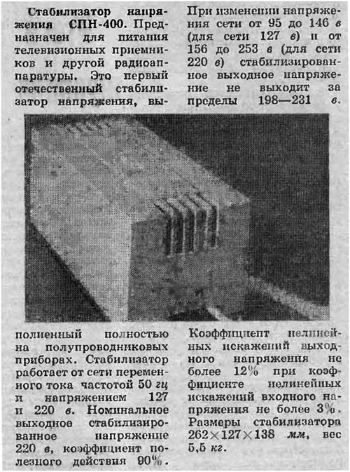 Полупроводниковый стабилизатор напряжения *СПН-400* выпускался с начала 1971 года Саранским заводом *Электровыпрямитель*. Предназначен для питания телевизоров и другой аппаратуры с потребляемой мощностью до 400 Вт. Это первый отечественный стабилизатор напряжения на полупроводниковых приборах. Стабилизатор работает от сети переменного тока частотой 50 гц и напряжением 127 и 220 вольт. Номинальное выходное стабилизированное напряжение 220 В, коэффициент полезного действия 90%. При изменении напряжения сети от 95 до 146 В (для сети 127 В) и от 156 до 253 В (для сети 220 В) стабилизированное выходное напряжение не выходит за пределы 198...231 вольт. КНИ выходного напряжения не более 12%, при КНИ входного напряжения не более 3%. Размеры стабилизатора - 262x127х138 мм, масса 5,5 кг. За время выпуска, а это более 15 лет, стабилизатор совершенствовался по схеме, изменялось его оформление.
