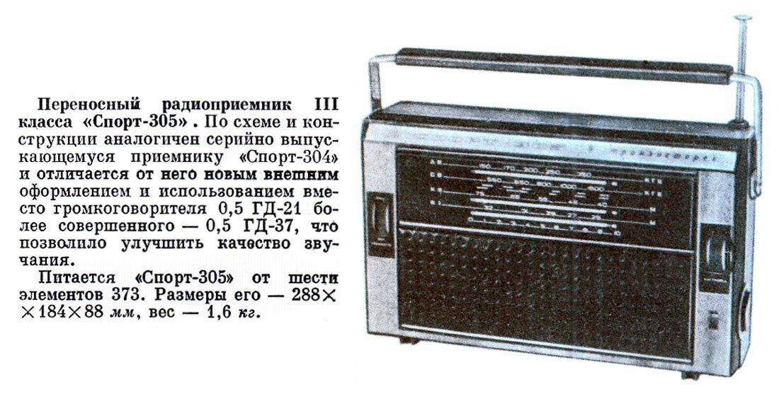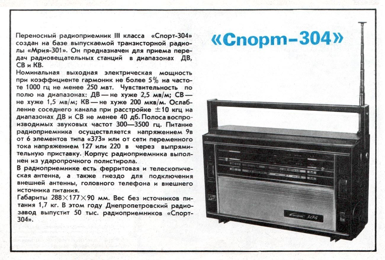 Переносные радиоприёмники *Спорт-304* и *Спорт-305* с 1971 и с 1972 года выпускал Днепропетровский радиозавод. Радиоприёмник третьего класса **Спорт-304** выполнен на основе радиолы **Мрия-301** и предназначен для приёма передач вещательных радиостанций, работающих в диапазонах ДВ, СВ, а также в 2-х коротковолновых поддиапазонах КВ1 и КВ2. Приём в поддиапазонах КВ производится на телескопическую антенну. Радиоприёмник выполнен на 9-ти транзисторах и 2-х диодах. Громкоговоритель применён типа 0,5ГД-21. Максимальная выходная мощность 0,5 Вт. Питается приёмник *Спорт-304* от 6 элементов типа 373. Габариты приёмника 288х176х90 мм, его масса 1,7 кг. **Спорт-305** является модернизацией модели **Спорт-304**. По схеме и конструкции он ему аналогичен, отличаясь лишь оформлением и громкоговорителем (не всегда). Размеры модели 288х184х88 мм. Масса 1,6 кг.