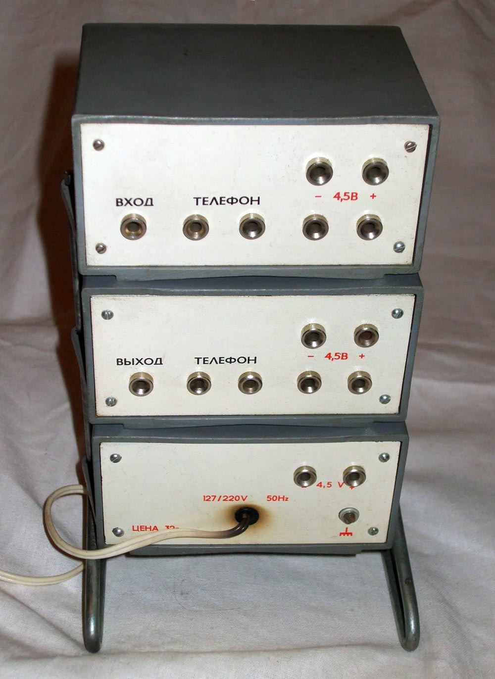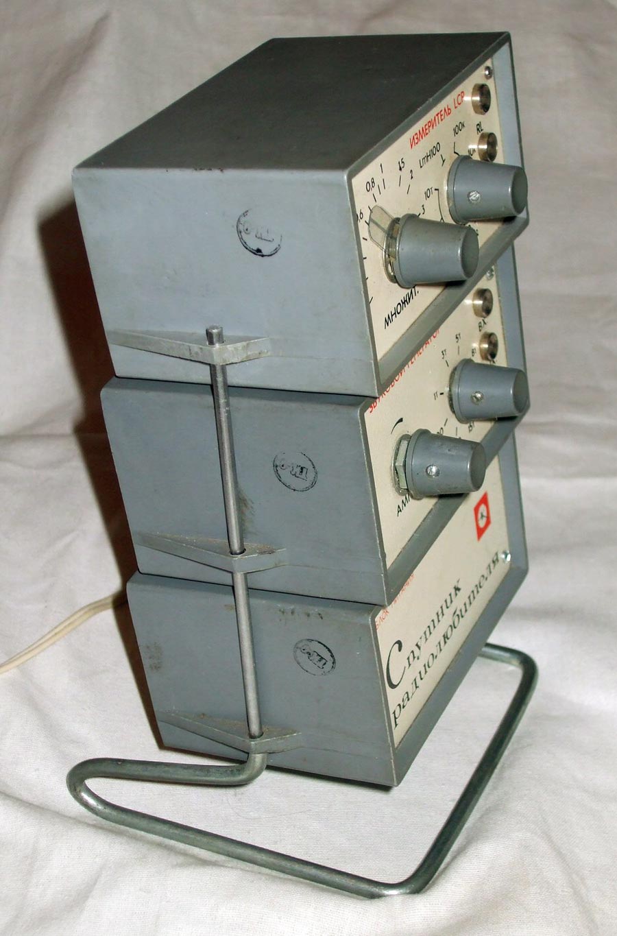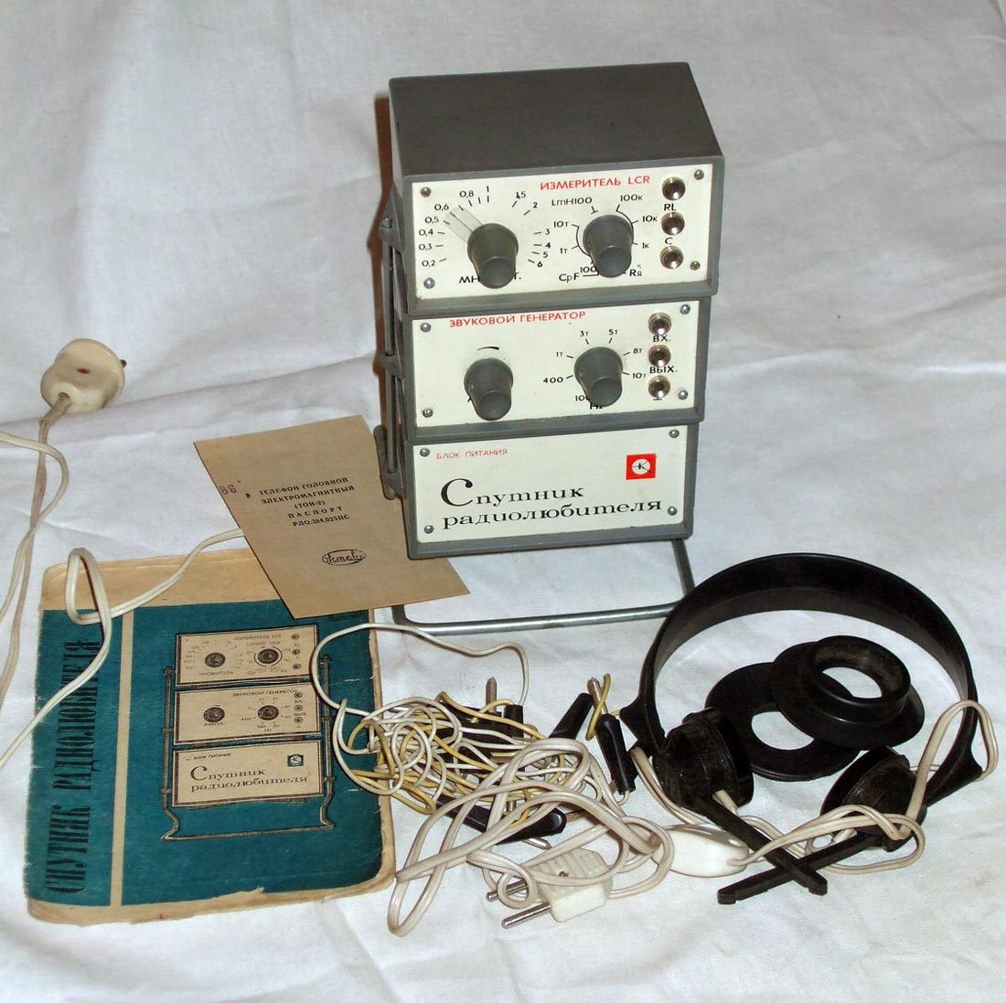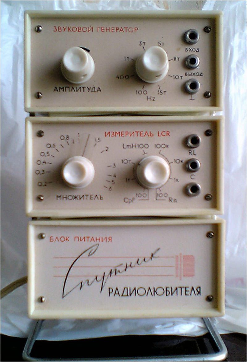 Комплект приборов *Спутник радиолюбителя* с 1967 года выпускал Курский завод *Маяк*. В комплект входит три блока, это звуковой генератор, измеритель RCL и блок питания. Завод рекламировал дальнейшее комплектование комплекта ещё и другими приборами, но так ничего больше выпущено не было. Звуковой генератор комплекта работает на 8 фиксированных частотах в диапазоне от 100 Гц до 15 Кгц. Измеритель RCL может измерять номиналы резисторов в диапазоне от 20 Ом до 500 кОм, индуктивностей от 20 до 500 мгн и ёмкостей от 20 пф до 20 мкф. Блок питания сетевой, без добавочной батареи или батарейный, одна батарея КБС или три-четыре элемента типа ФБС. Габариты комплекта *Спутник радиолюбителя* - 220х140х110 мм, масса каждого блока 1, 3 и 1 кг. соответственно.