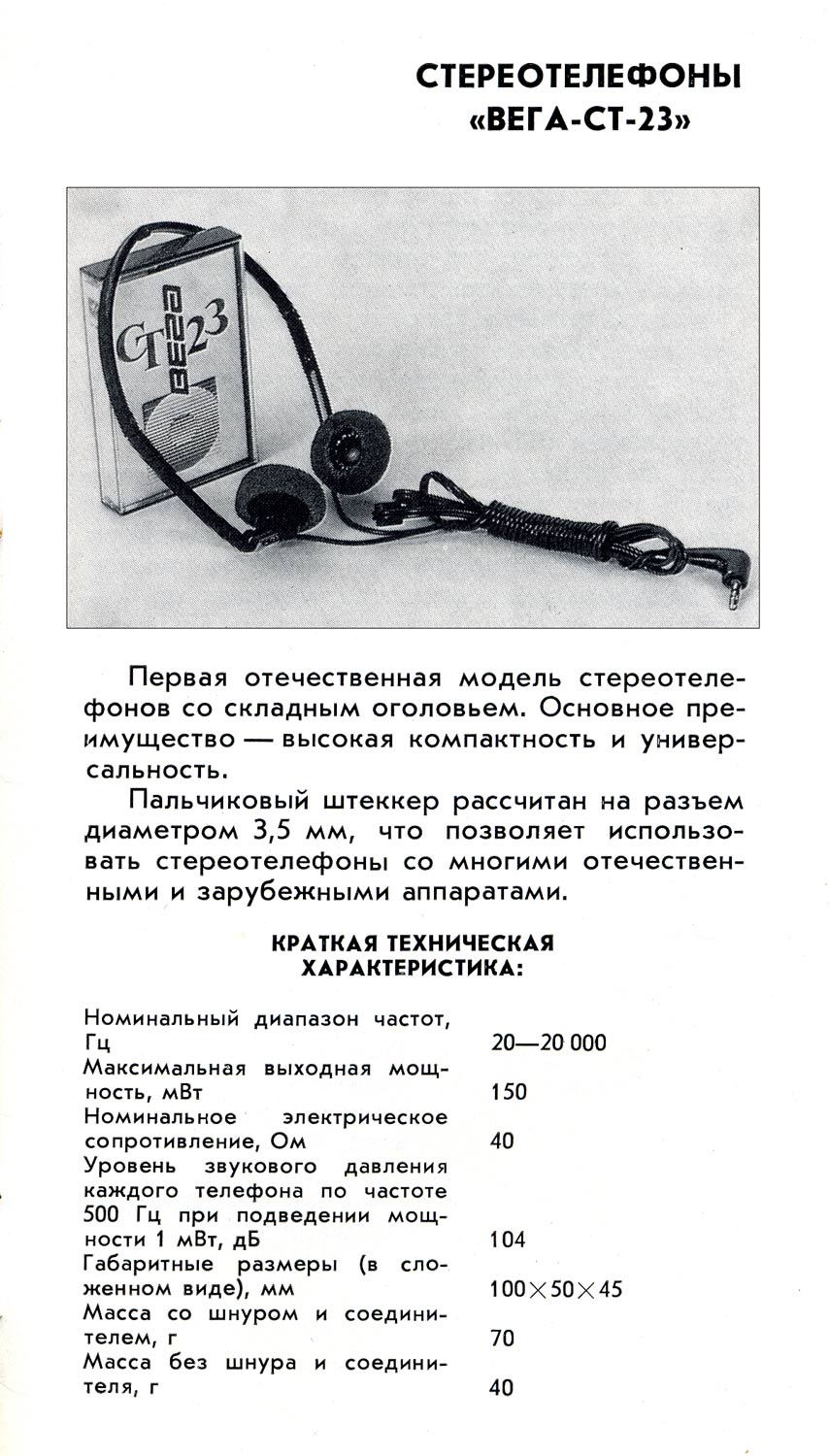 Телефоны головные динамические стереофонические малогабаритные *Вега СТ-23* выпускались с 1989 года Бердским ПО *Вега*. Описание ниже.
