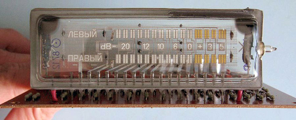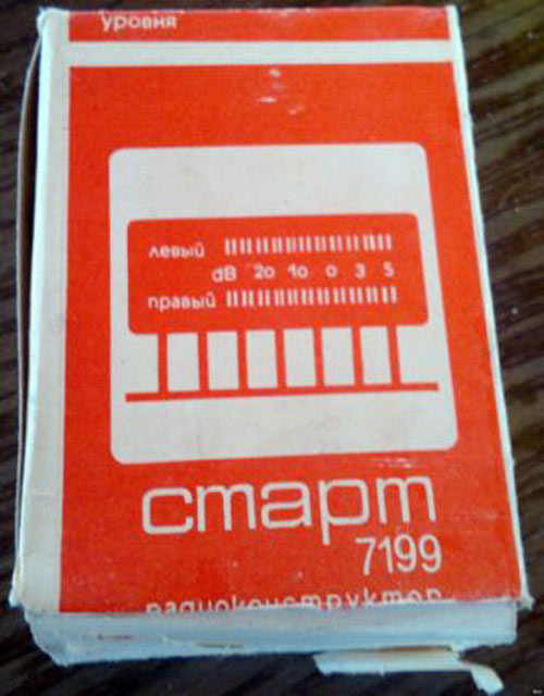 Радиоконструктор *Старт-7199* (Световой логарифмический индикатор уровня) с 1985 года выпускали в городе Ровно на заводе Газотрон. РК позволяет собрать двухканальный индикатор уровня сигнала для стереомагнитофона или стереофонического усилителя звуковой частоты. Отображающее устройство - двухцветный дискретно-аналоговый вакуумно-люминесцентный индикатор П-402. Плата дает возможность изготовить либо индикаторы пикового уровня со временем интеграции 5 мс, обратного хода 40 мс либо промежуточного, интеграция и обратный ход 40 мс. Динамический диапазон индикации 25 дБ. Входное напряжение около 120 мВ.