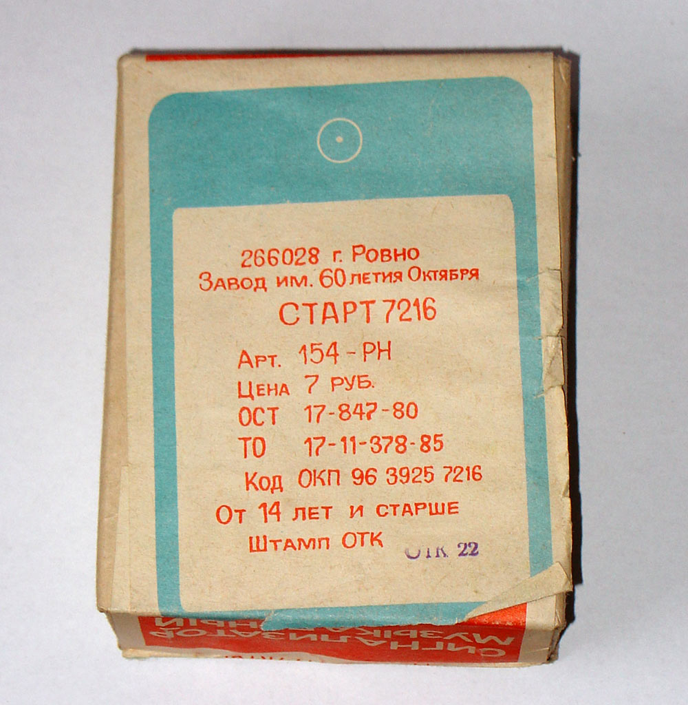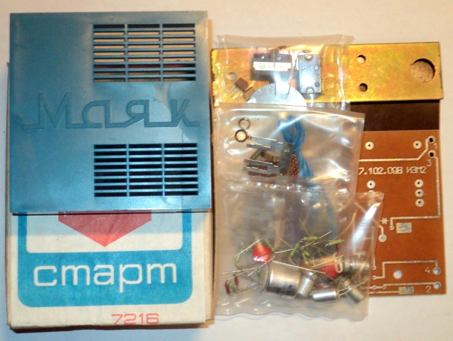 Радиоконструктор *Старт-7216* (сигнализатор музыкальный) с середины 1987 года выпускал Ровненский завод им. 60-летия Октября. Содержит корпус, печатную плату и детали из которых можно по приложенной инструкции собрать музыкальный сигнализатор - устройство издающее сигнал напоминающий пение птиц. Сигнализатор выполнен на девяти транзисторах КТ315. Звуковой сигнал генерируется пьезокерамическим излучателем типа ЗП-3. Узел управления устройством позволяет либо подавать сигнал только тогда, когда нажата кнопка, замкнуты контакты какого-либо переключателя, либо в течение примерно 5 секунд после кратковременного нажатия на кнопку. В описании к РК даны различные варианты применения сигнализатора. Он может быть, например, использован как датчик наличия влаги, наполнения резервуара водой, степени увлажнения ткани и т.п. Питание сигнализатора, осуществляют от батареи Крона, которая размещается внутри корпуса. Напряжение питания может лежать в пределах от 9 до 15 В. Потребляемый ток не превышает 80 мА. Габариты конструкции 125х94х35 мм, вес 200 г. Цена 7 рублей.