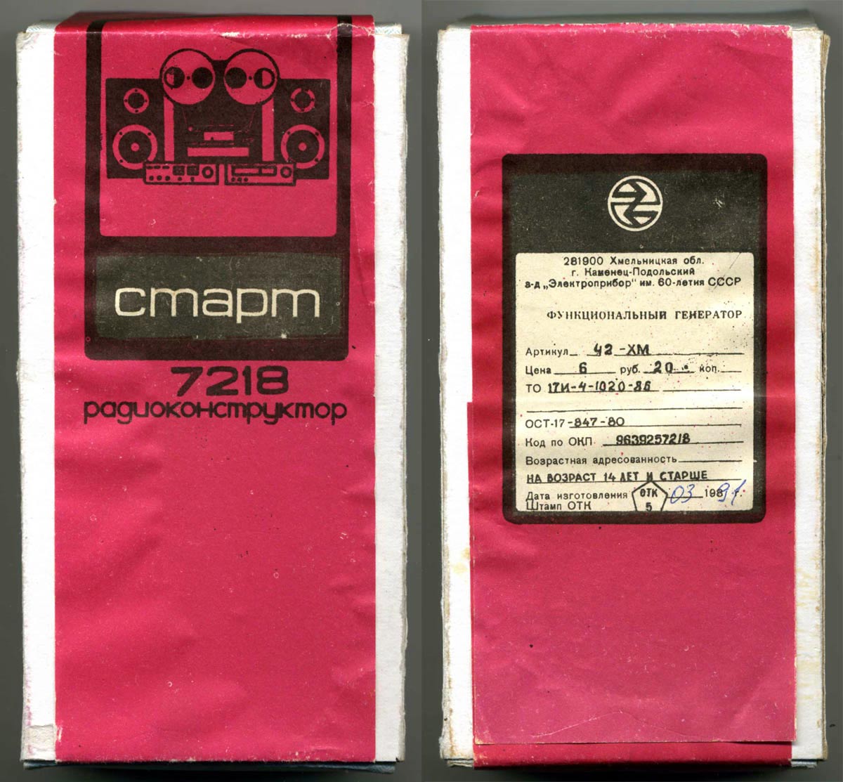 Радиоконструктор *Старт-7218* (Функциональный генератор) с I-кв 1988 года выпускал Каменец-Подольский завод Электроприбор. РК предназначен для детей старшего школьного возраста, а также для радиолюбителей любой квалификации. Работа с радиоконструктором не требует специальной подготовки и позволяет овладеть навыками конструирования и макетирования радиоустройств. РК позволяет на печатной плате собрать простой функциональный генератор, который вырабатывает колебания синусоидальной, треугольной и прямоугольной формы в широком диапазоне частот, что позволяет использовать его при проверке и настройке радиоэлектронных устройств. При использовании генератора совместно с осциллографом, имеется возможность снятия ампдитудно-частотных и динамических характеристик измеряемых устройств. Генератор может использоваться для проверки динамического состояния логических элементов устройств цифровой техники. Монтаж элементов выполняется на печатной плате. Основные характеристики: Рабочий диапазон 20...135000 Гц. Количество поддиапазонов 4. Выходное напряжение при синусоидальной форме сигнала 0,3 В, треугольной и прямоугольной 1,8 В. Коэффициент гармоник синусоидального напряжения 6%. Выходное сопротивление 600 Ом. Напряжение питания 9 В. Потребляемый ток 60 мА. Габариты ФГ - 167х92х55 мм. Масса 200 гр.