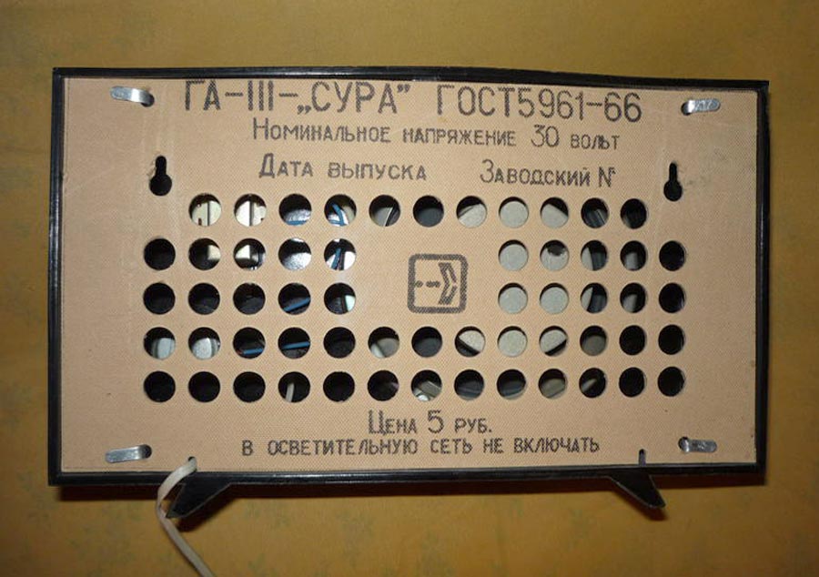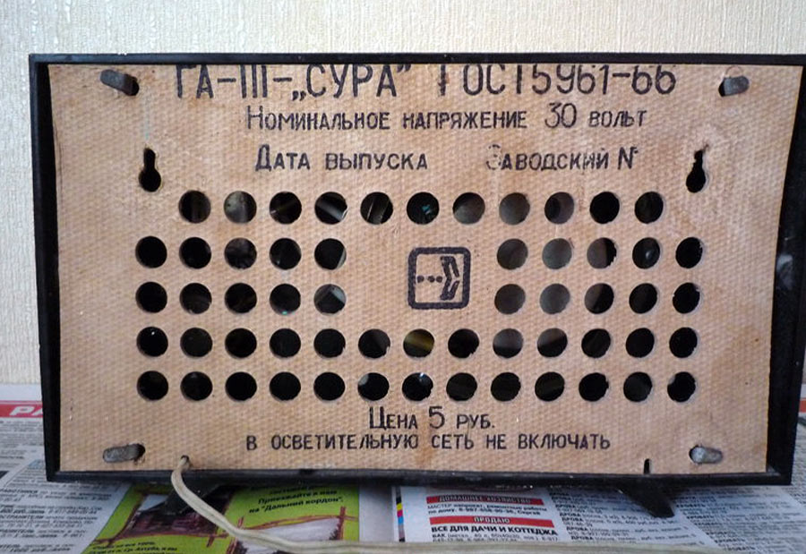 Абонентский громкоговоритель "Сура" выпускался с 1967 года. "Сура" - стандартный абонентский громкоговоритель, рассчитанный на радиотрансляционную сеть с напряжением 30 В. Номинальная подводимая мощность 0,15 Вт. Диапазон звуковых воспроизводимых частот 160...5000 Гц. Сопротивление на входе АГ 3,6 кОм. Габариты громкоговорителя - 260х150х65 мм. Масса 1 кг. Цена 5 рублей.