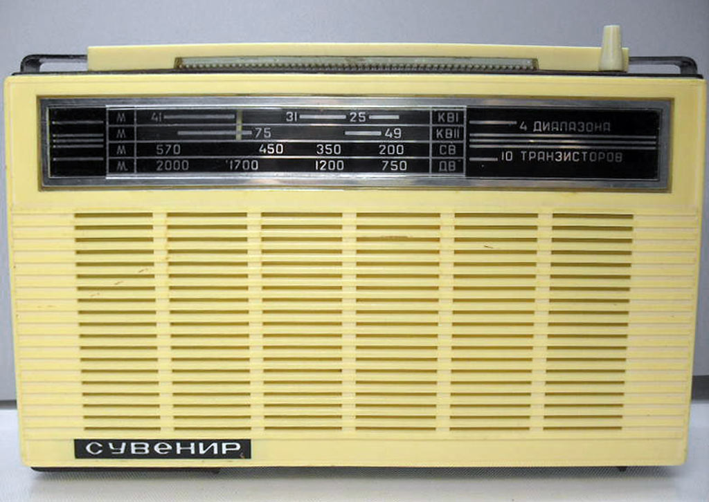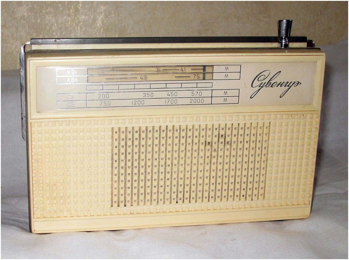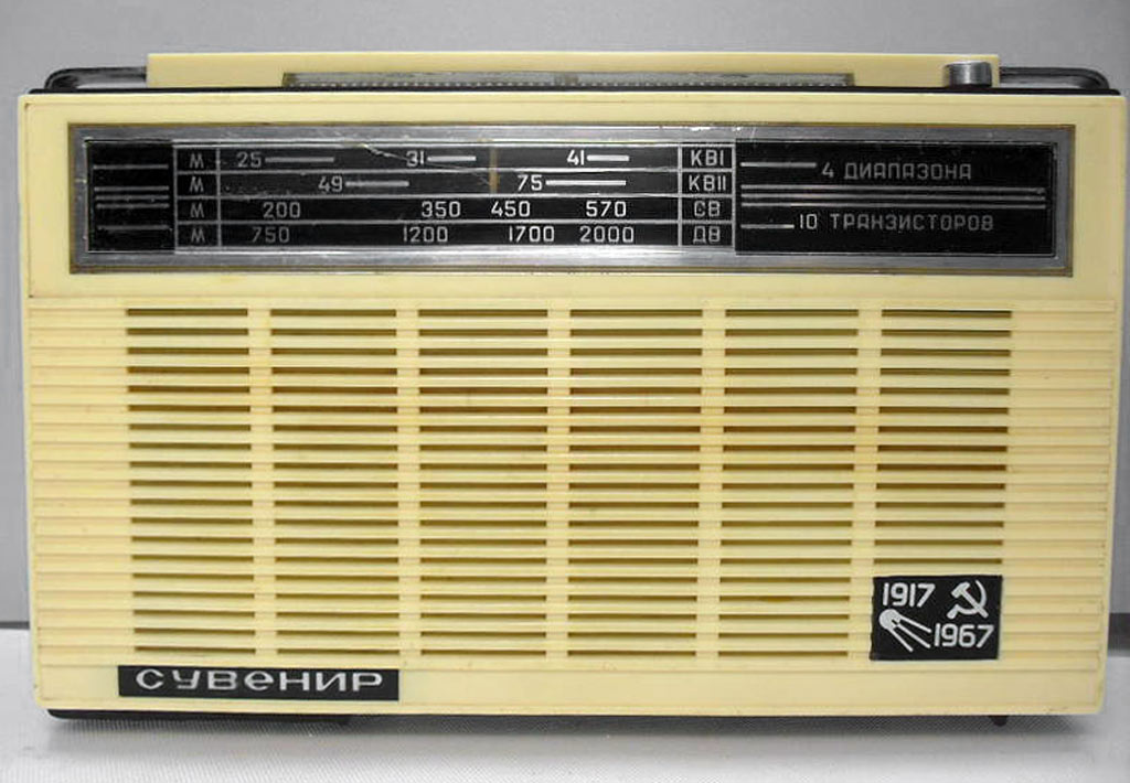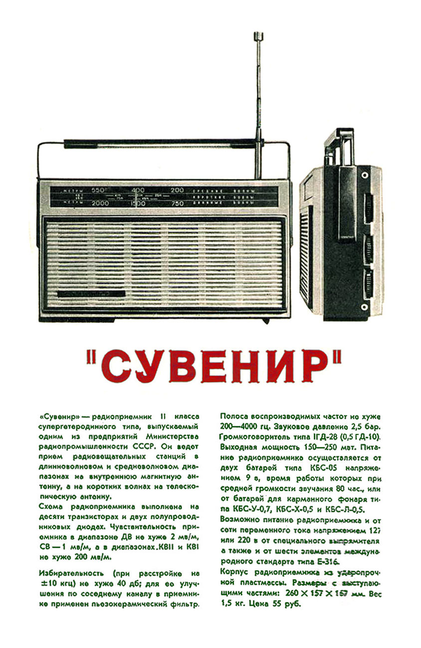 Портативный радиоприёмник 2-го класса *Сувенир* с 1965 года выпускал Воронежский радиозавод. Супергетеродин на 10-ти транзисторах и 2 диодах. Приёмник предназначен для работы в ДВ, СВ и 2 полу-растянутых КВ поддиапазонах. В диапазонах ДВ и СВ приём осуществляется на магнитную антенну, КВ на телескопическую. Чувствительность в ДВ - 2,0 мВ/м, СВ - 1,0 мВ/м, KB - 100 мкВ. Избирательность по соседнему каналу при расстройке на ±10 кГц - 40 дБ. Полоса воспроизводимых звуковых частот - 200...4000 Гц. Номинальная выходная мощность - 150 мВт. Ток покоя 6 мА, при номинальной мощности 50 мА. Питание от двух батарей КБС-Л-0,5. Работоспособность приёмника сохраняется при снижении напряжения до 4 В. Футляр изготовлен из цветной ударопрочной пластмассы с ручкой переноски. К приёмнику можно подключить антенну, заземление и головные телефоны. Габариты РП 260х160х67 мм. Вес с батареями 1,6 кг. РП имел несколько вариантов оформления.