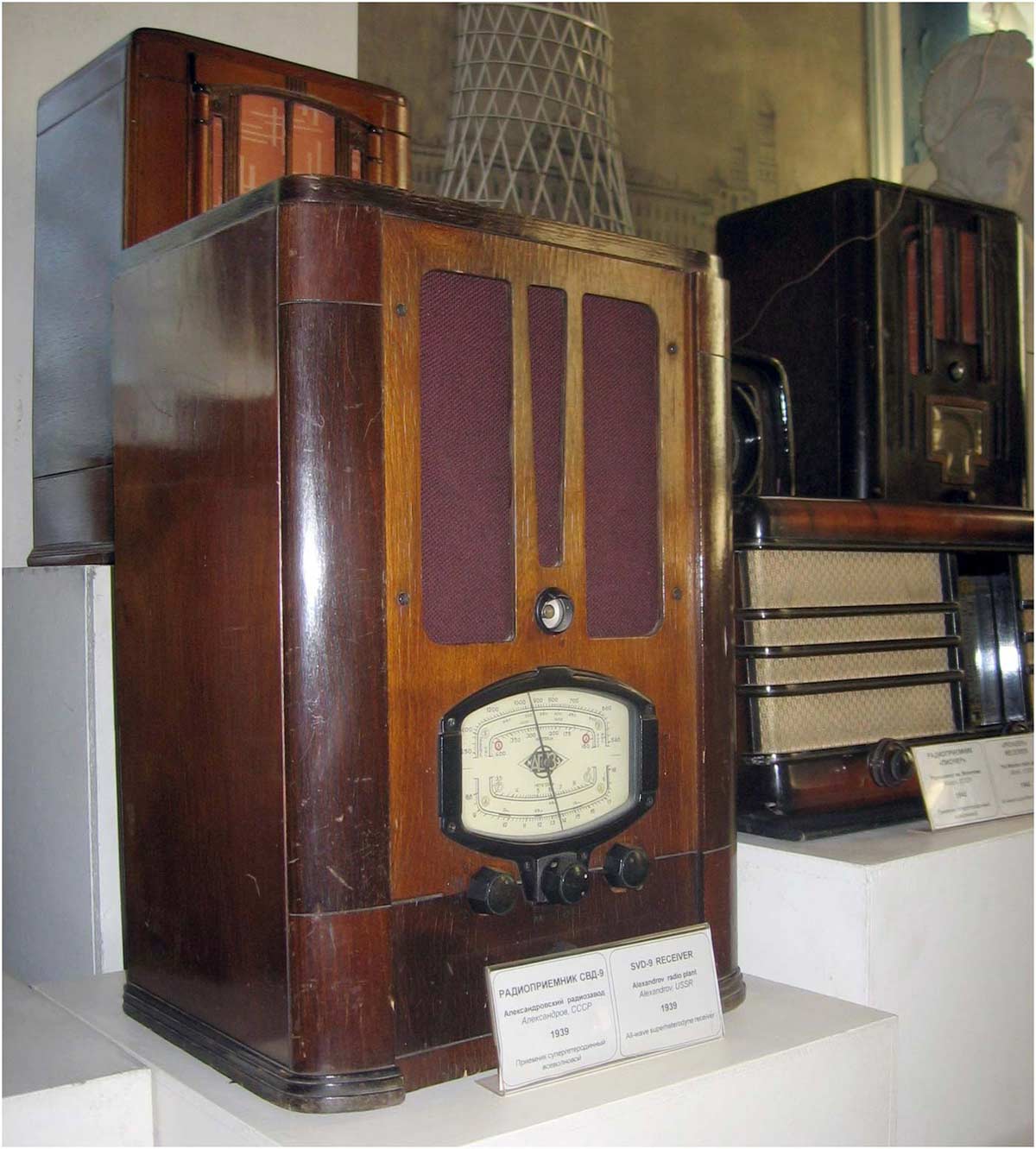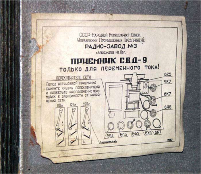 Радиоприёмник сетевой ламповый *СВД-9* с начала 1938 года выпускал Александровский радиозавод № 3 НКС. За время производства приёмников серии **СВД** их электрическая схема изменялась, а в соответствии с ней менялось и наименование модели. Очередная модернизация получила наименование **СВД-9**. В 1940 году круглая шкала приёмника была заменена на овальную, также частично модернизирована электрическая и монтажная схема. Радиоприёмник **СВД-9** собран на 9 лампах типов: 6К7, 6А8, 6Х6, 6Ф5, 6Л6, 5Ц4, 6Е5. Диапазоны ДВ (А) 750-2000 м, СВ (Б) 200-556 м, КВ (Г) 85,7-33,3 м, КВ (Д) 36,6-16,7 м. Чувствительность приёмника около 30 мкВ. Промежуточная частота 445 кГц. Номинальная выходная мощность усилителя приёмника 3, максимальная 7 Вт. Диапазон звуковых частот 100...4000 Гц. Потребляемая от сети мощность 100 Вт. Размеры приёмника 560х360х290 мм. Масса 16 кг. Приёмник собран в футляре из многослойной фанеры и дерева, покрыт лаком. Круглая, позже овальная шкала приёмника защищена стеклом. В центре шкалы эмблема: земной шар со звездой, серпом и молотом, на овальной - логотип Александровского радиозавода. Над шкалой находится индикатор настройки с козырьком. Ручек управления четыре. Первая переключатель диапазонов (А-Б-Г-Д), далее настройка и громкость. Нижняя регулятор тембр и выключатель сети. Двойная ручка настройки с редуктором. Громкоговоритель **ГМЭ-1** с подмагничиванием.